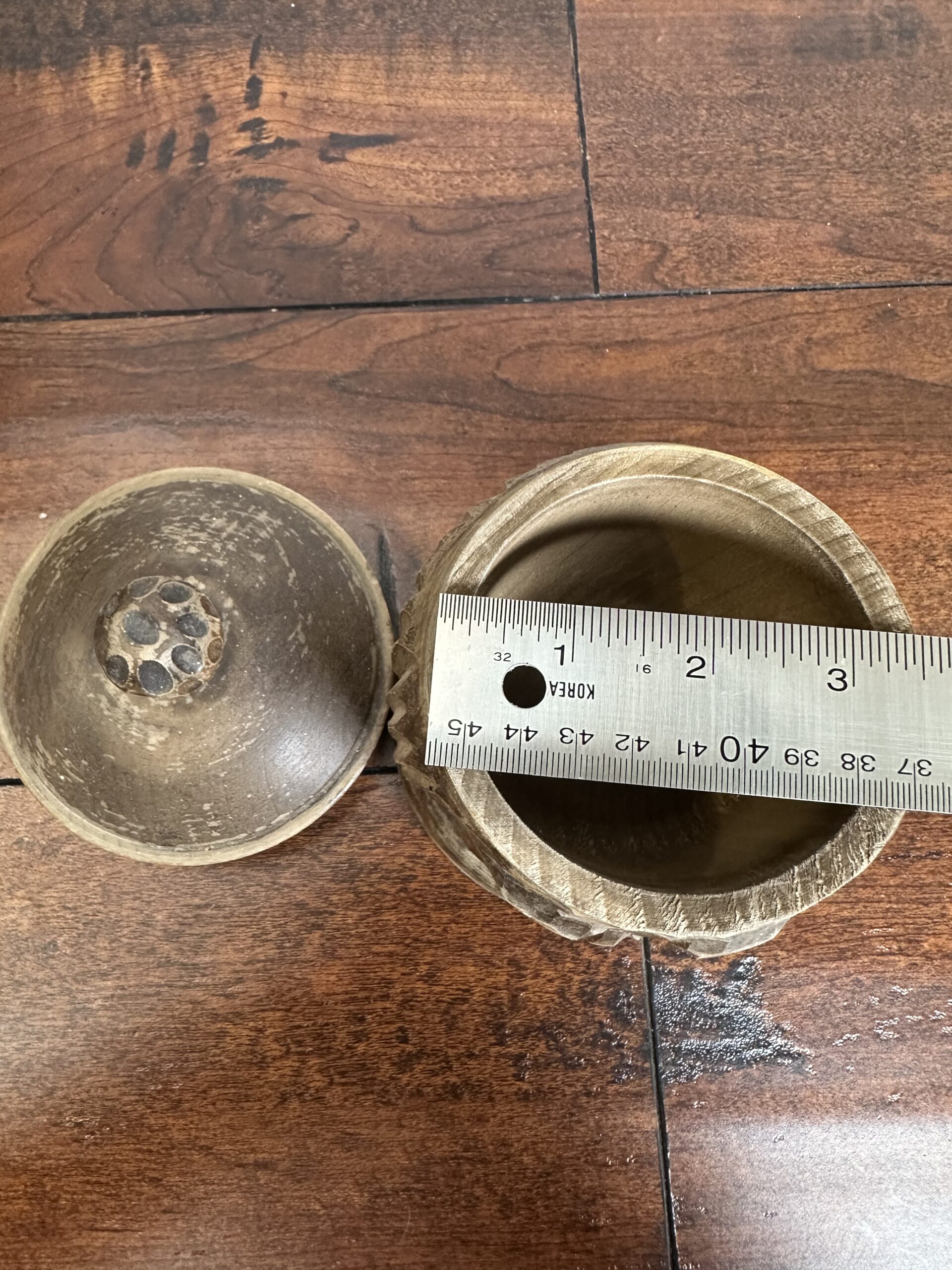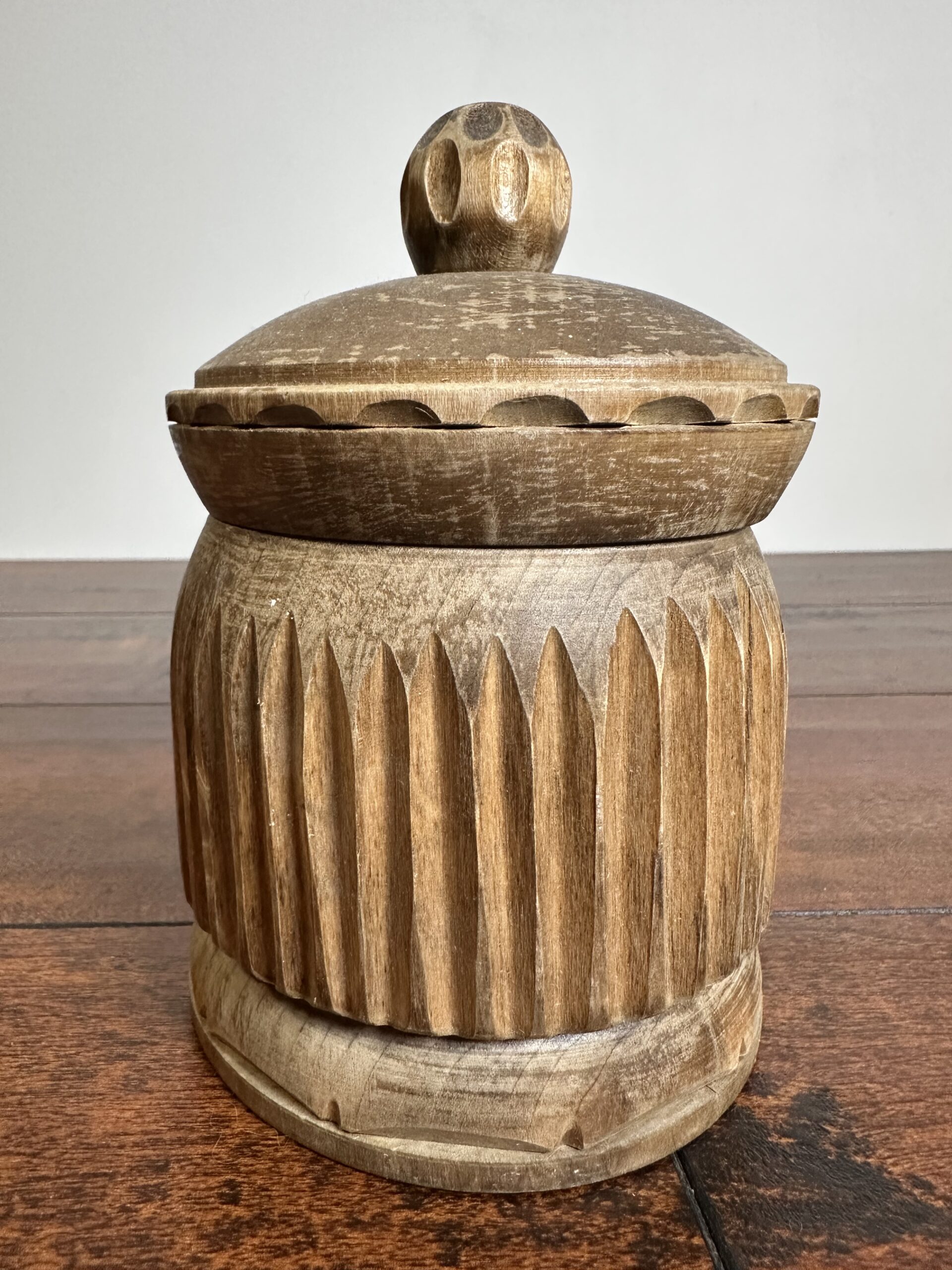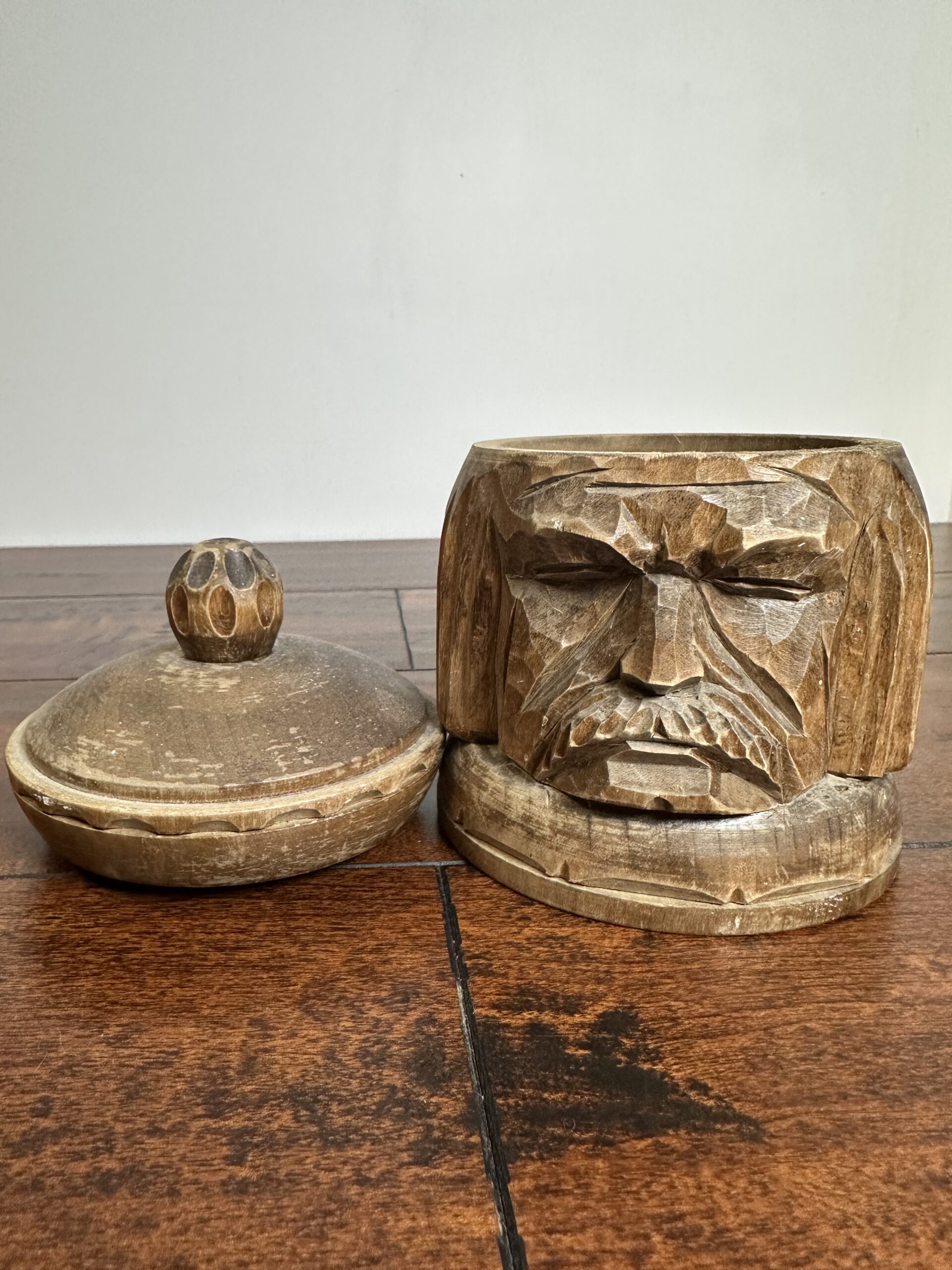 A unique hand-carved wooden jar featuring a detailed face motif on the front. The jar comes with a matching lid adorned with a round knob. Ideal for decorative purposes. The jar measures approximately 5 inches in height.