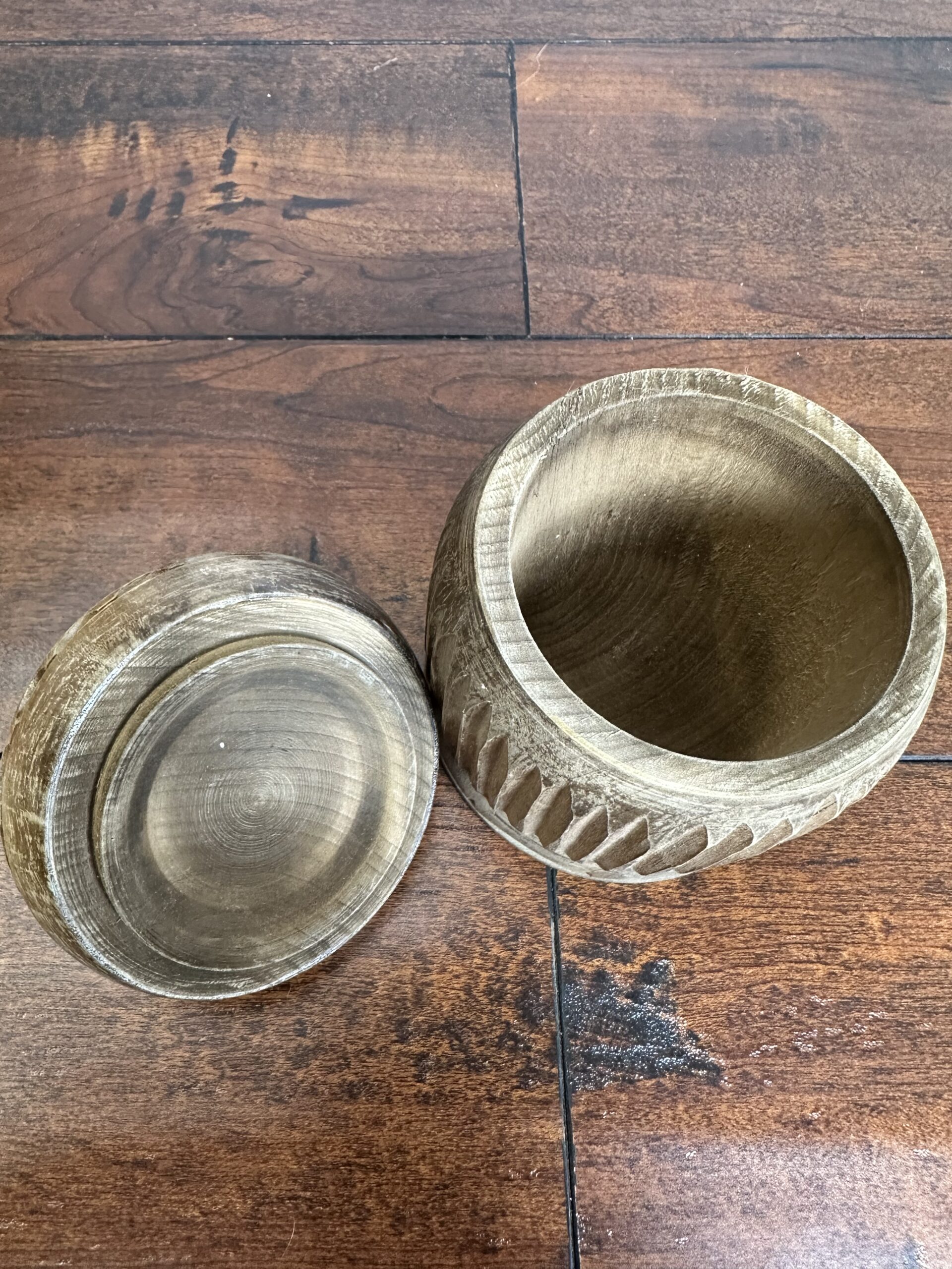 Hand-Carved Wooden Jar with Lid and Face Motif