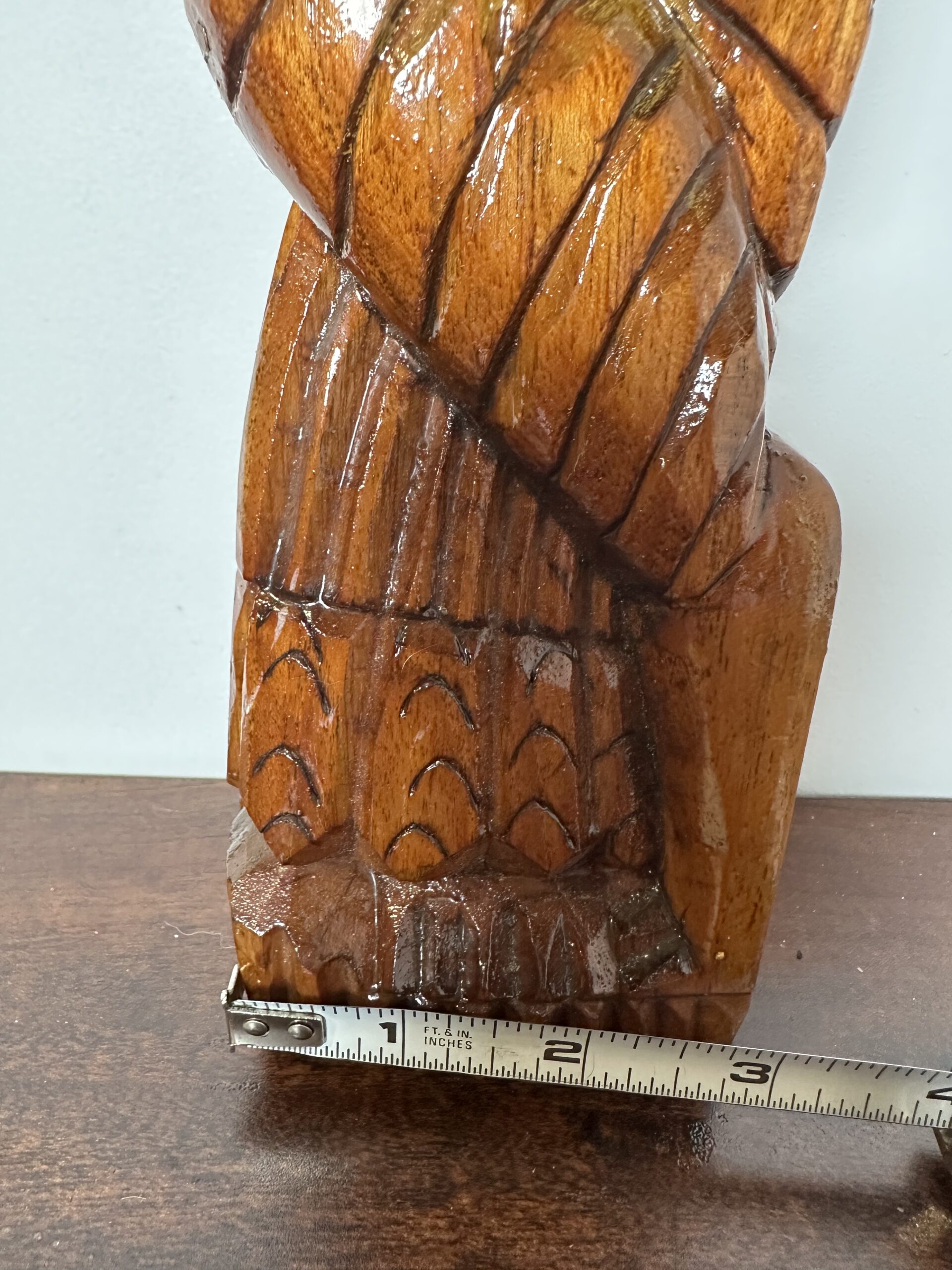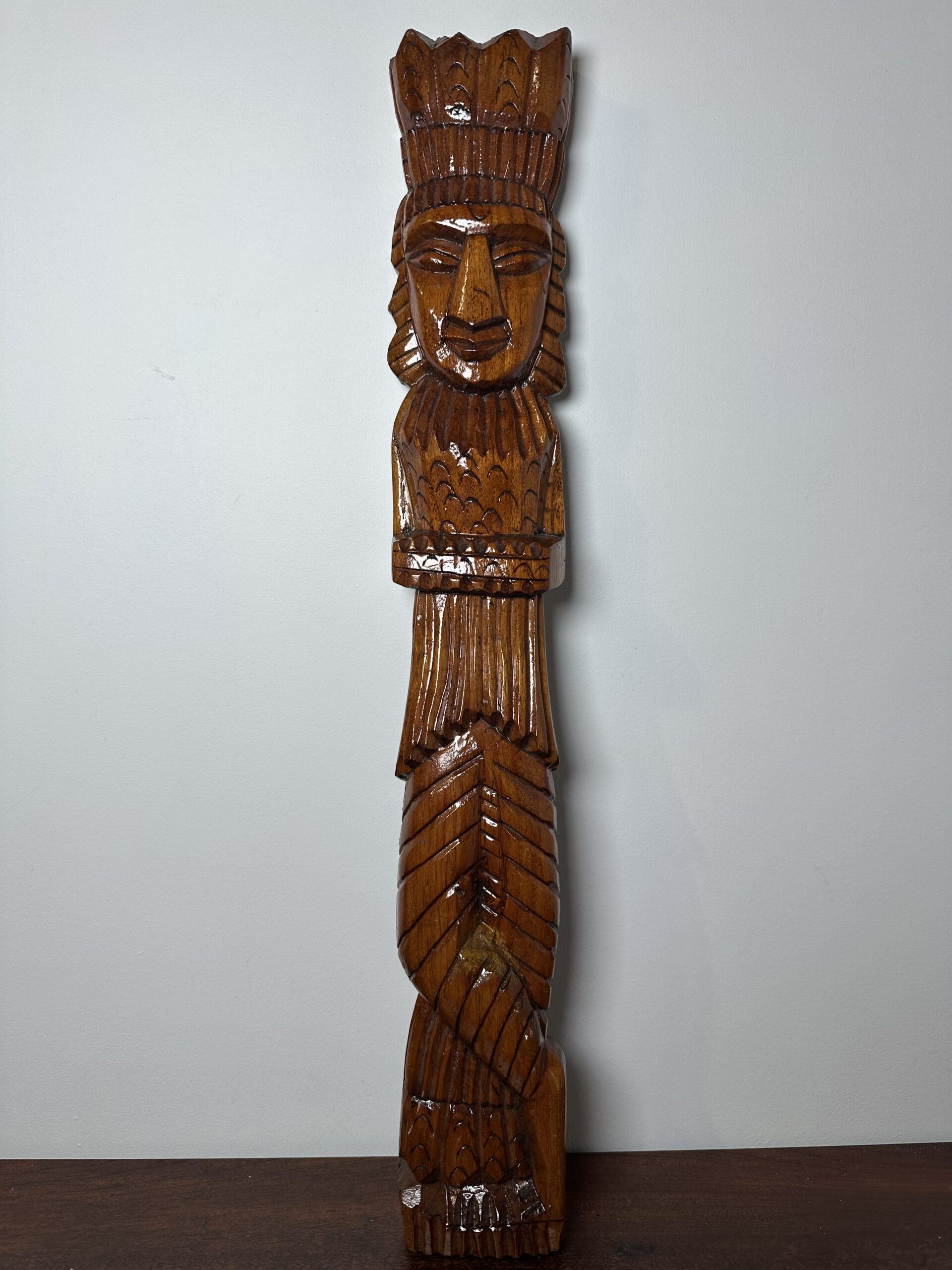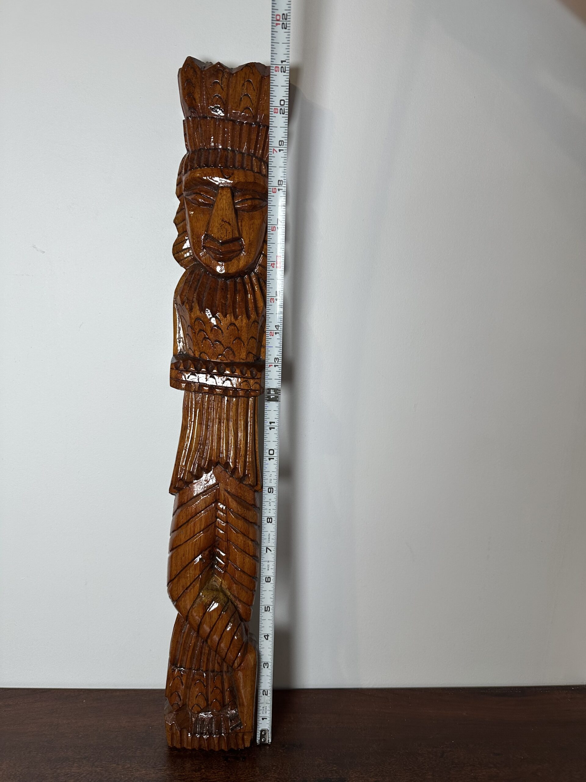 This exquisite hand-carved wooden tribal sculpture stands 17 inches tall and is crafted from rich brown wood. Its intricate detailing showcases skilled craftsmanship, making it a perfect addition to any collection or as a standalone decorative piece. The sculpture is in good condition with some minor wear on the back, adding to its rustic charm.