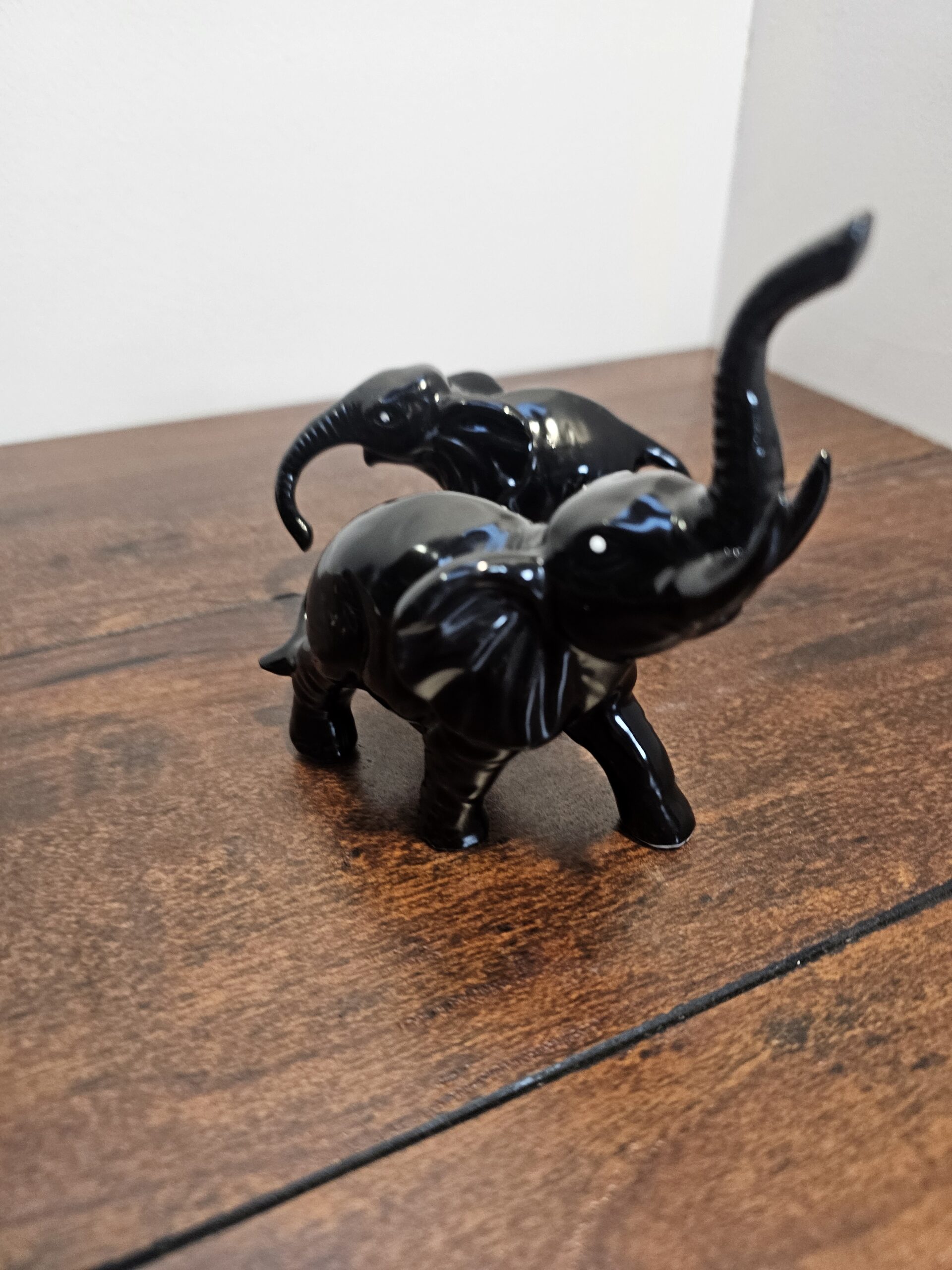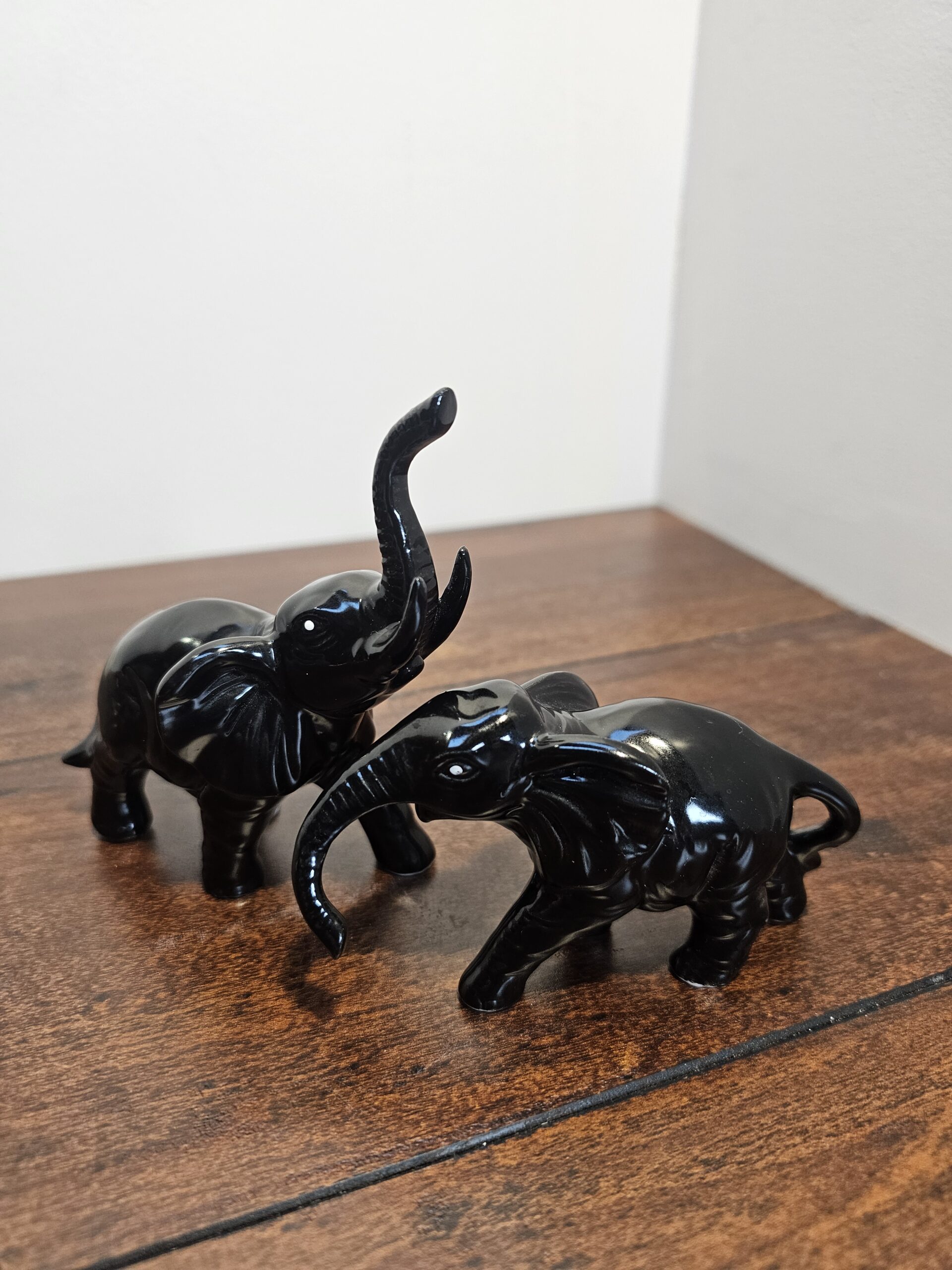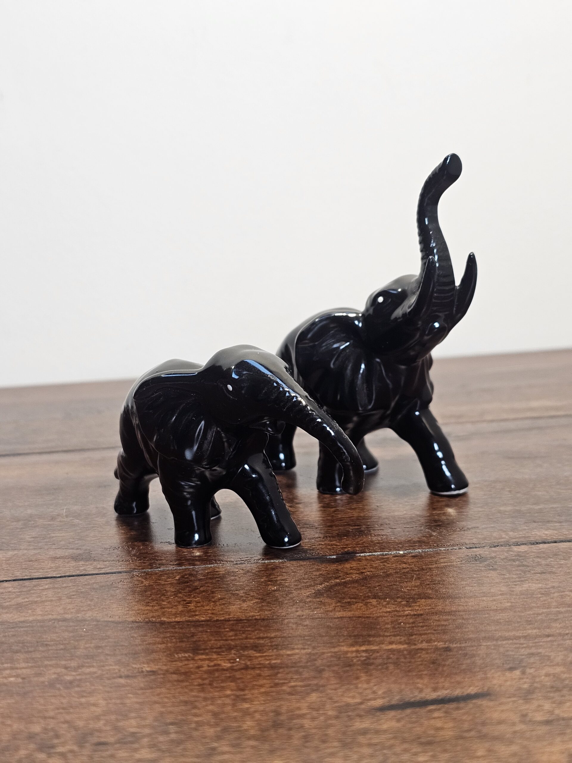 Set of two black ceramic elephant figurines featuring smooth, glossy finishes. Each elephant is uniquely posed, with one trunk raised. Ideal for decorative display purposes.