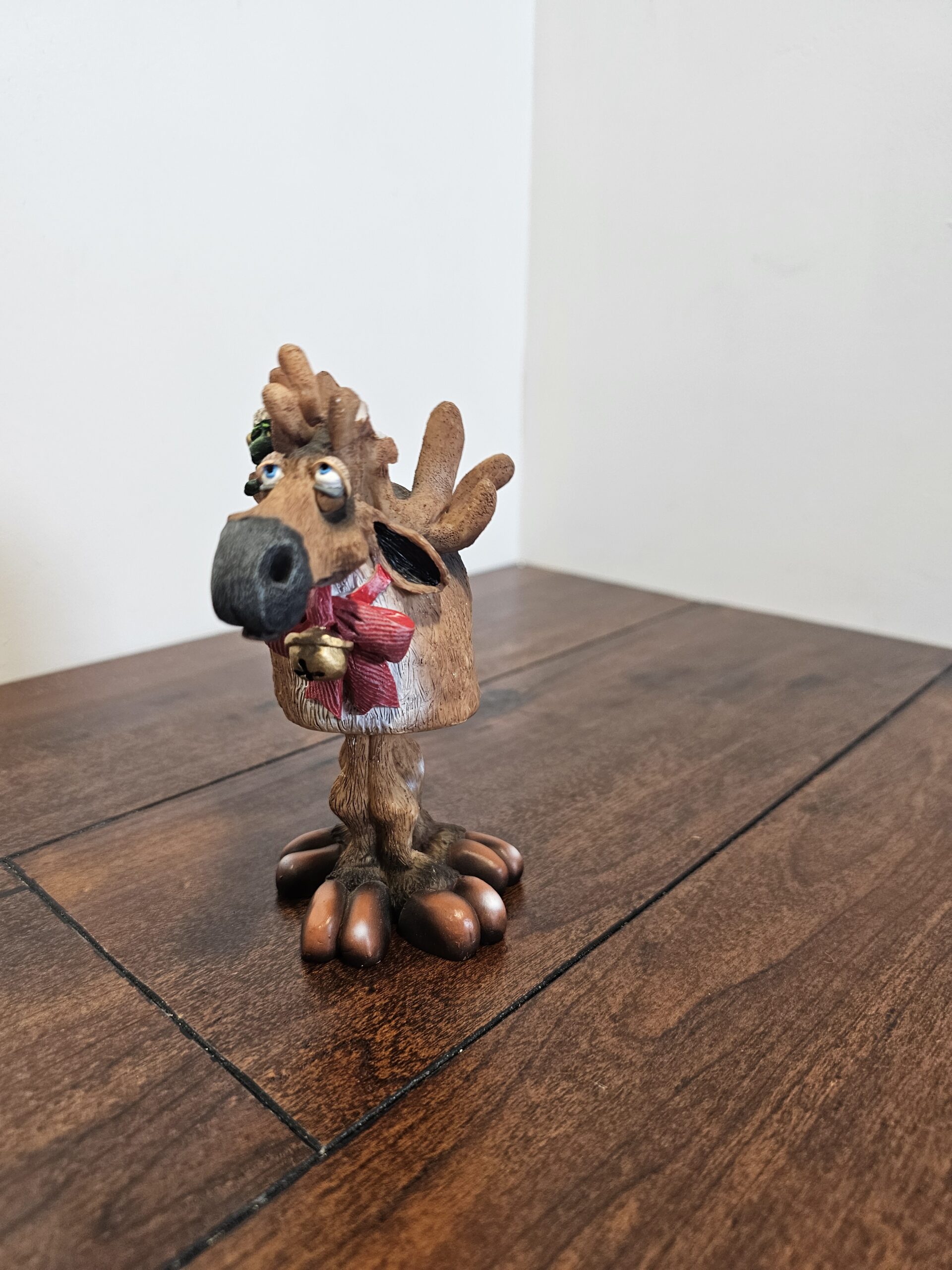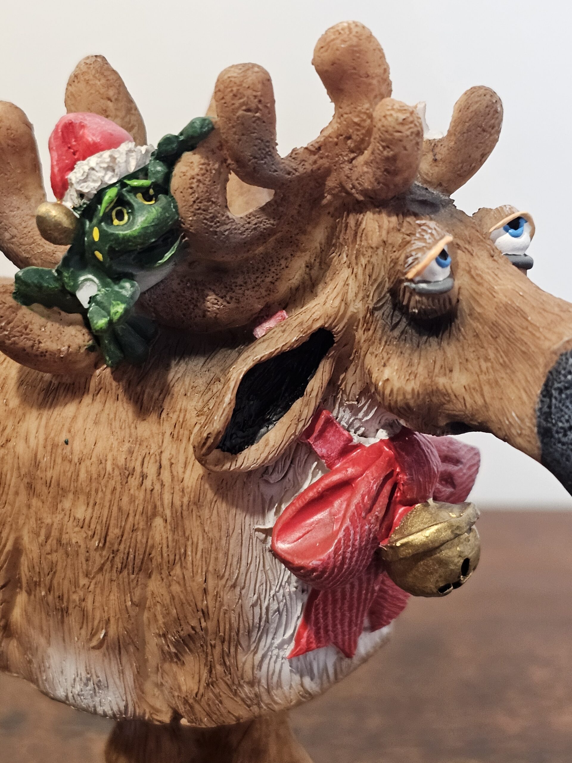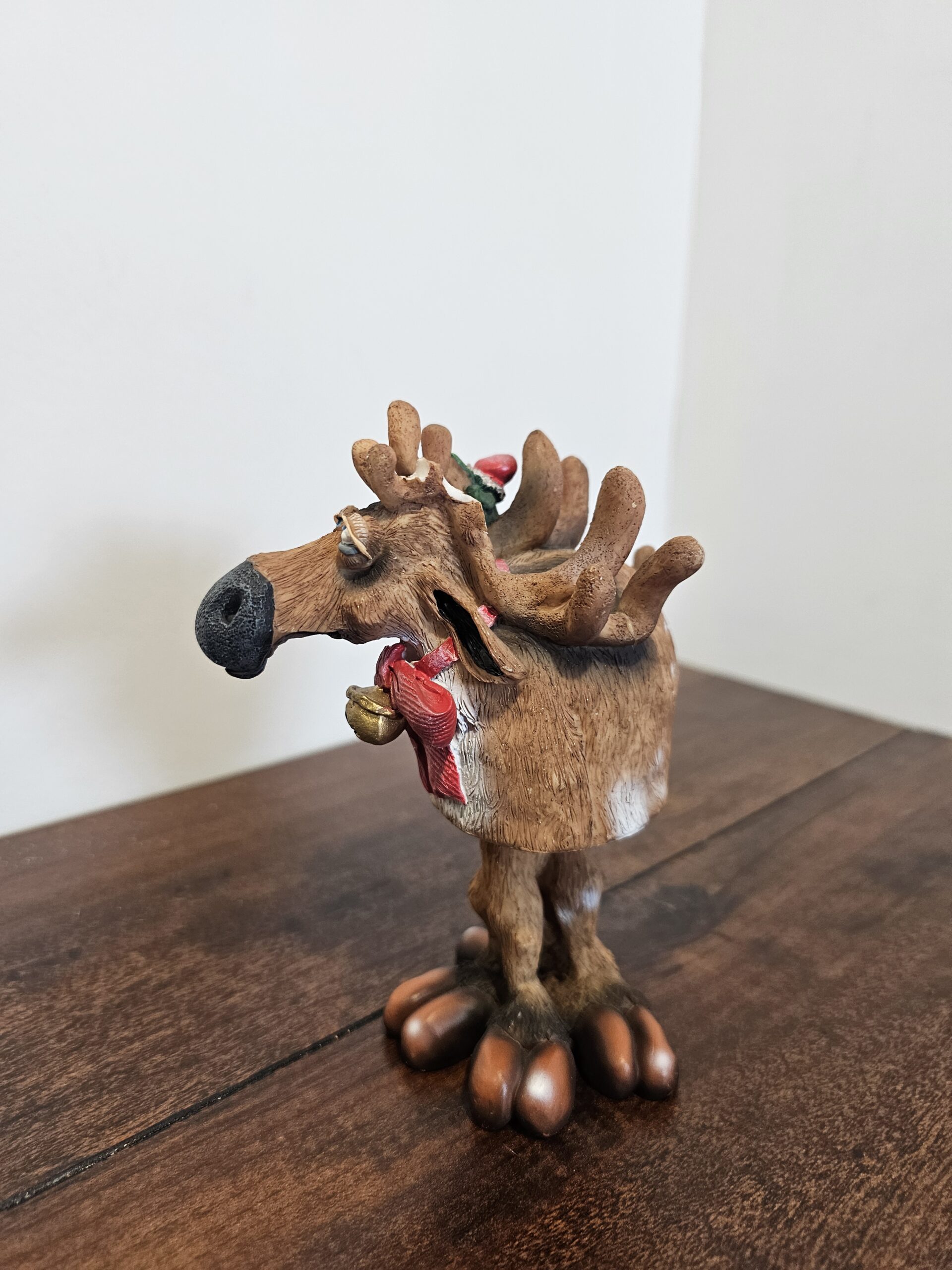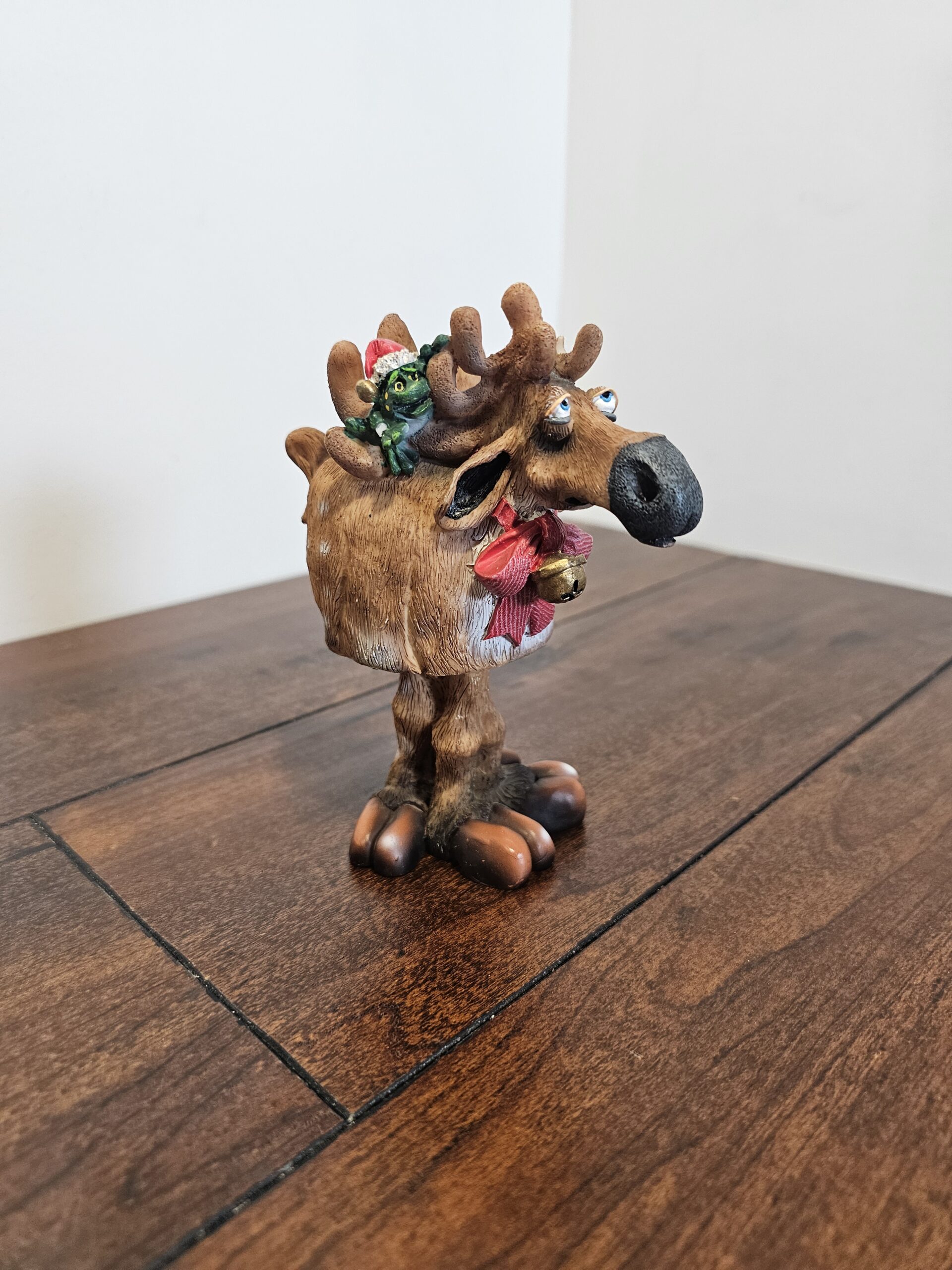 Douglas moose figurine featuring a whimsical design with a green frog wearing a Santa hat perched on the antlers. The moose is adorned with a…