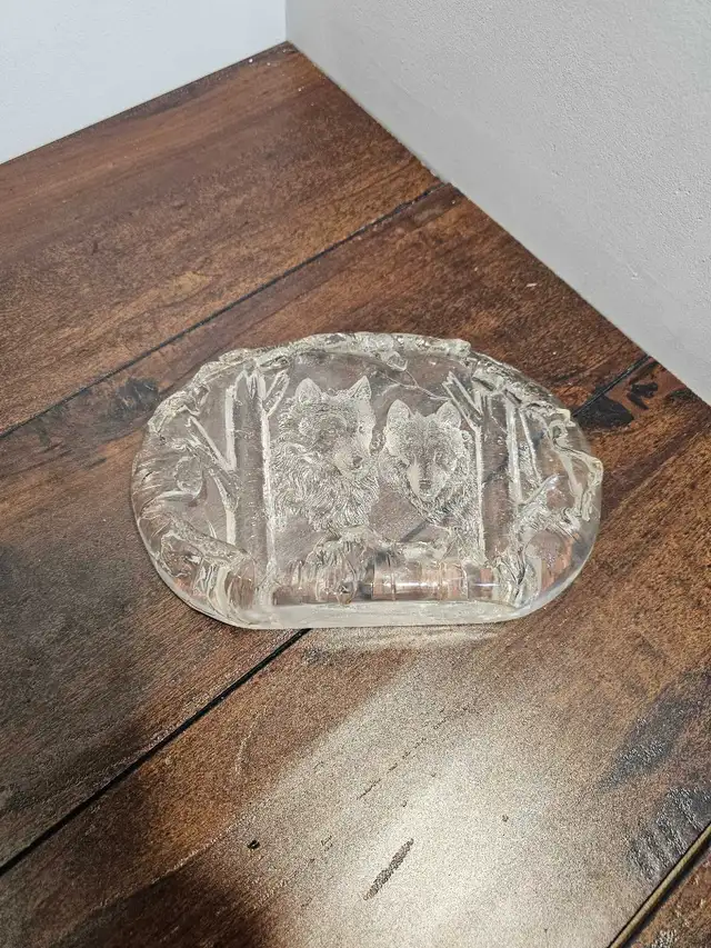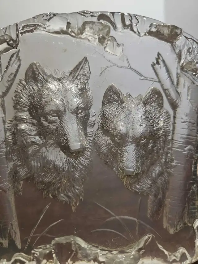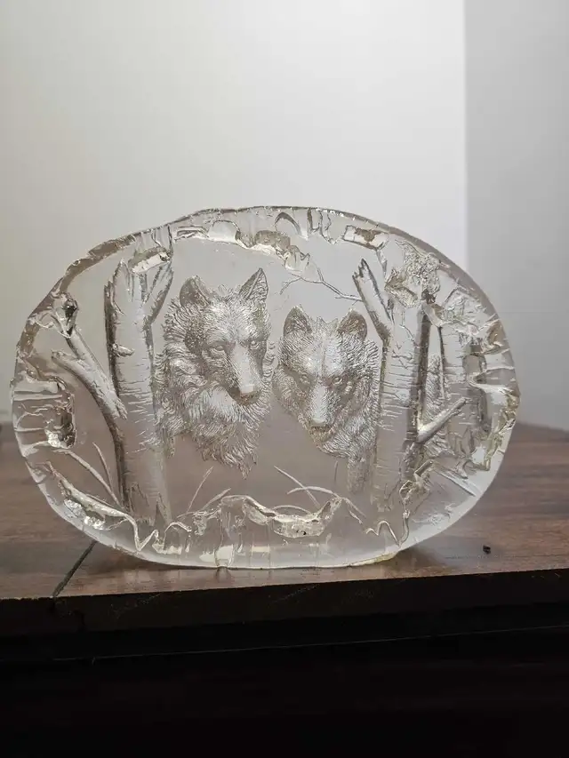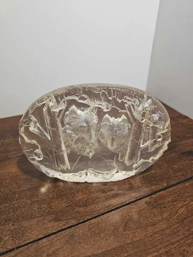 This is a beautiful, used clear glass sculpture featuring two wolves in a forest scene. This unique piece captures a serene woodland moment, making it a perfect addition to any art collection or as a standalone decorative item. I have had this sculpture for a number of years, it has been well cared for, and it is in good condition. If the ad is still up, it’s still available-no need to howl at the moon; just send a message!