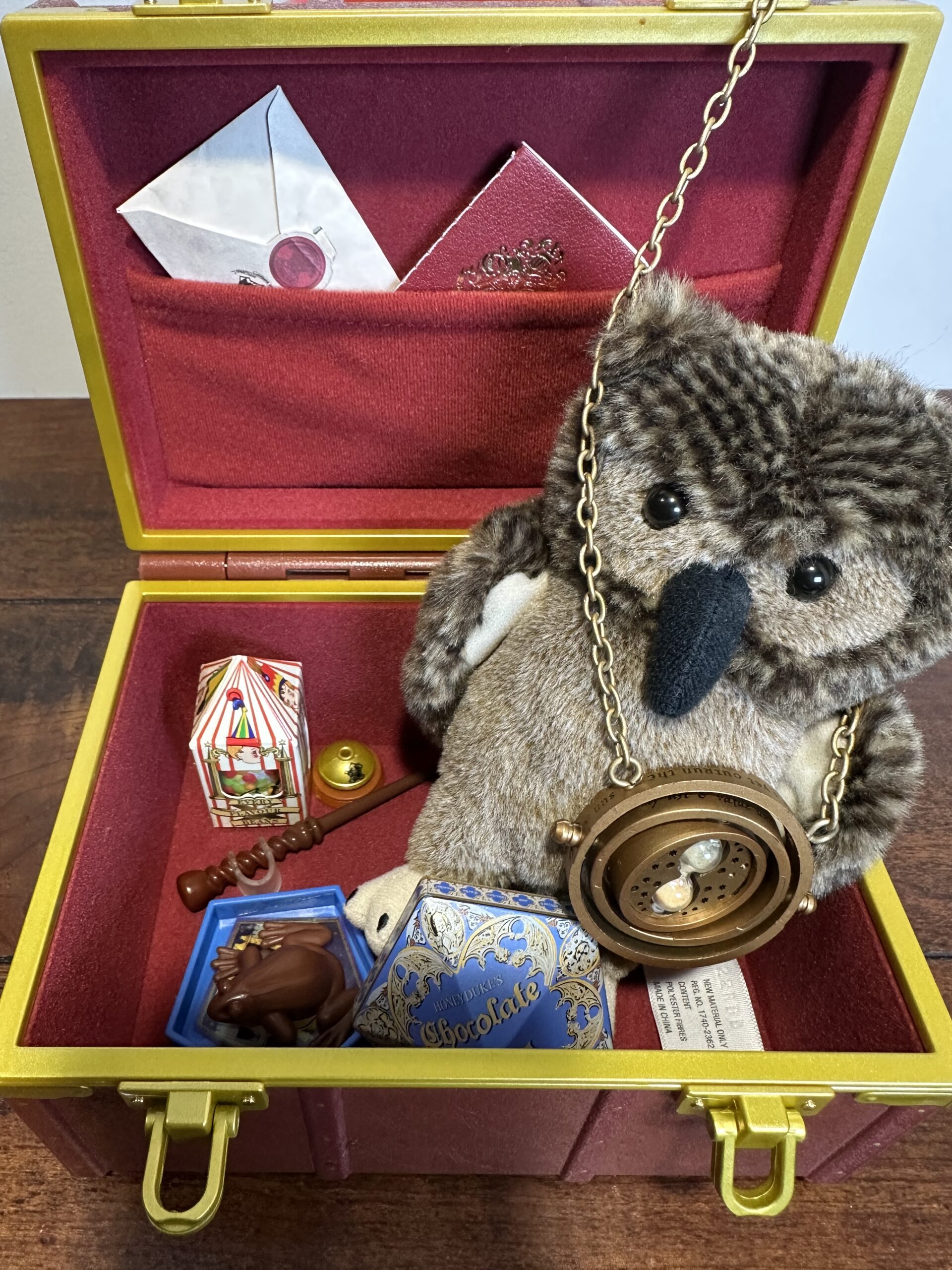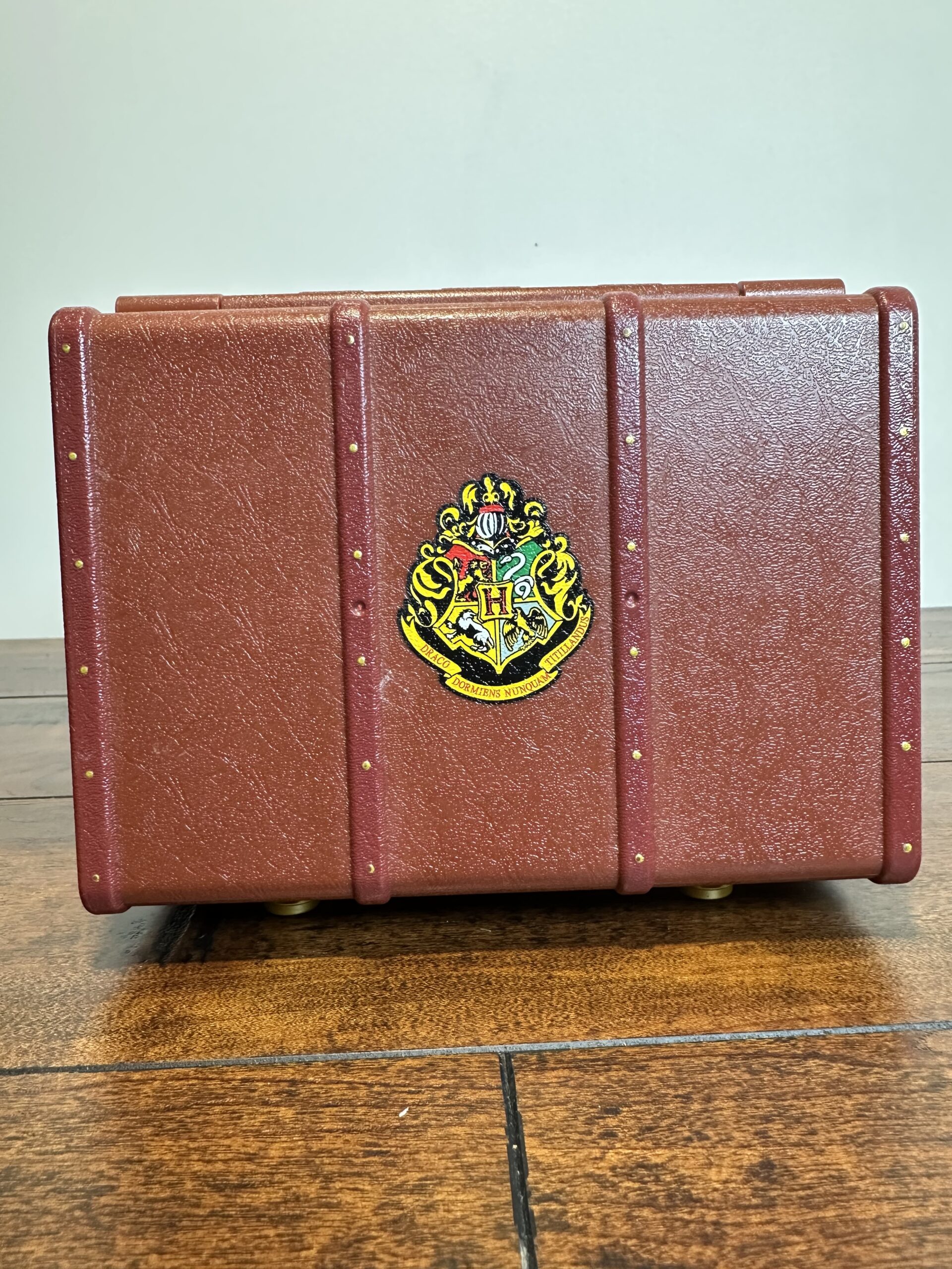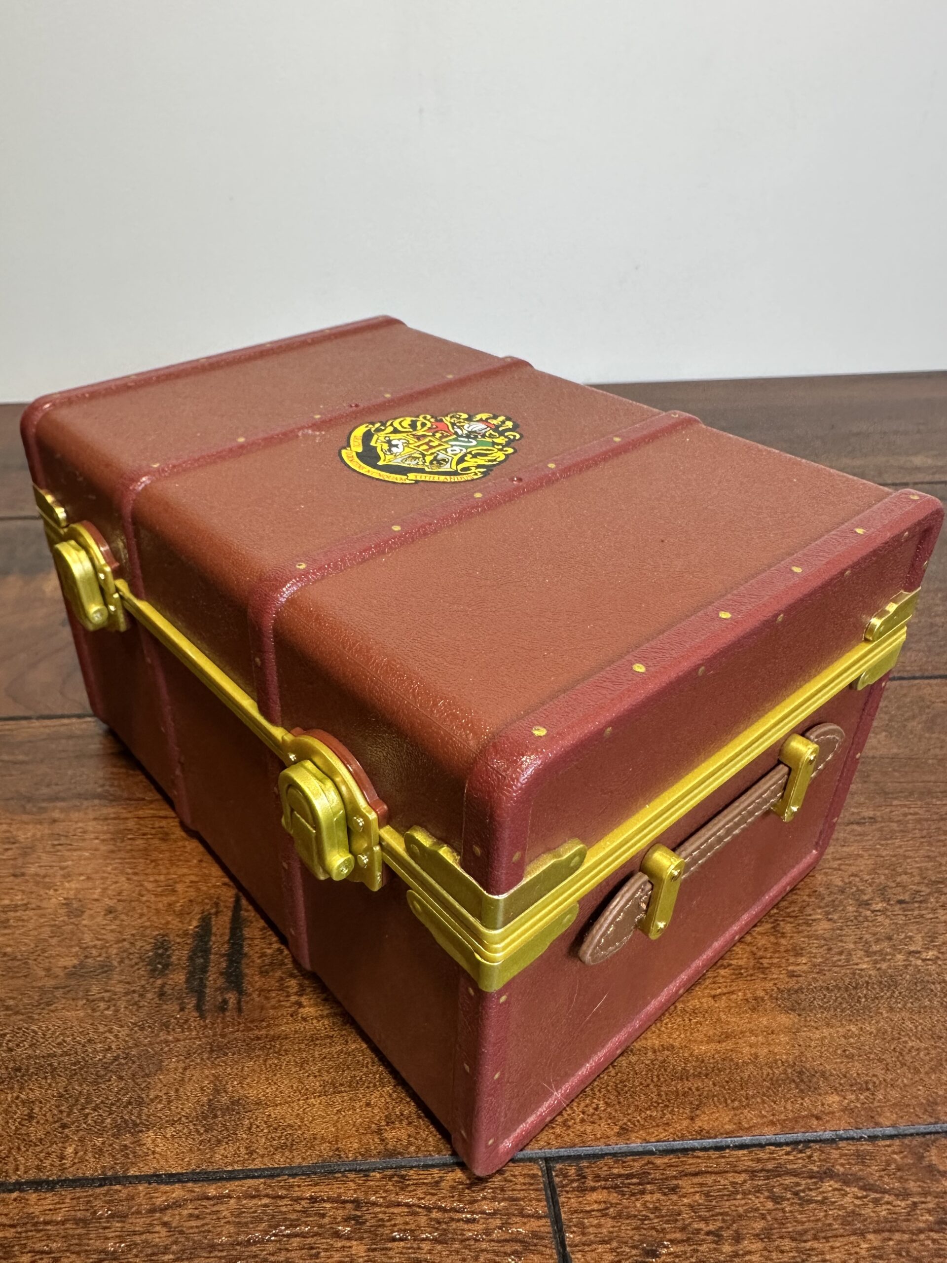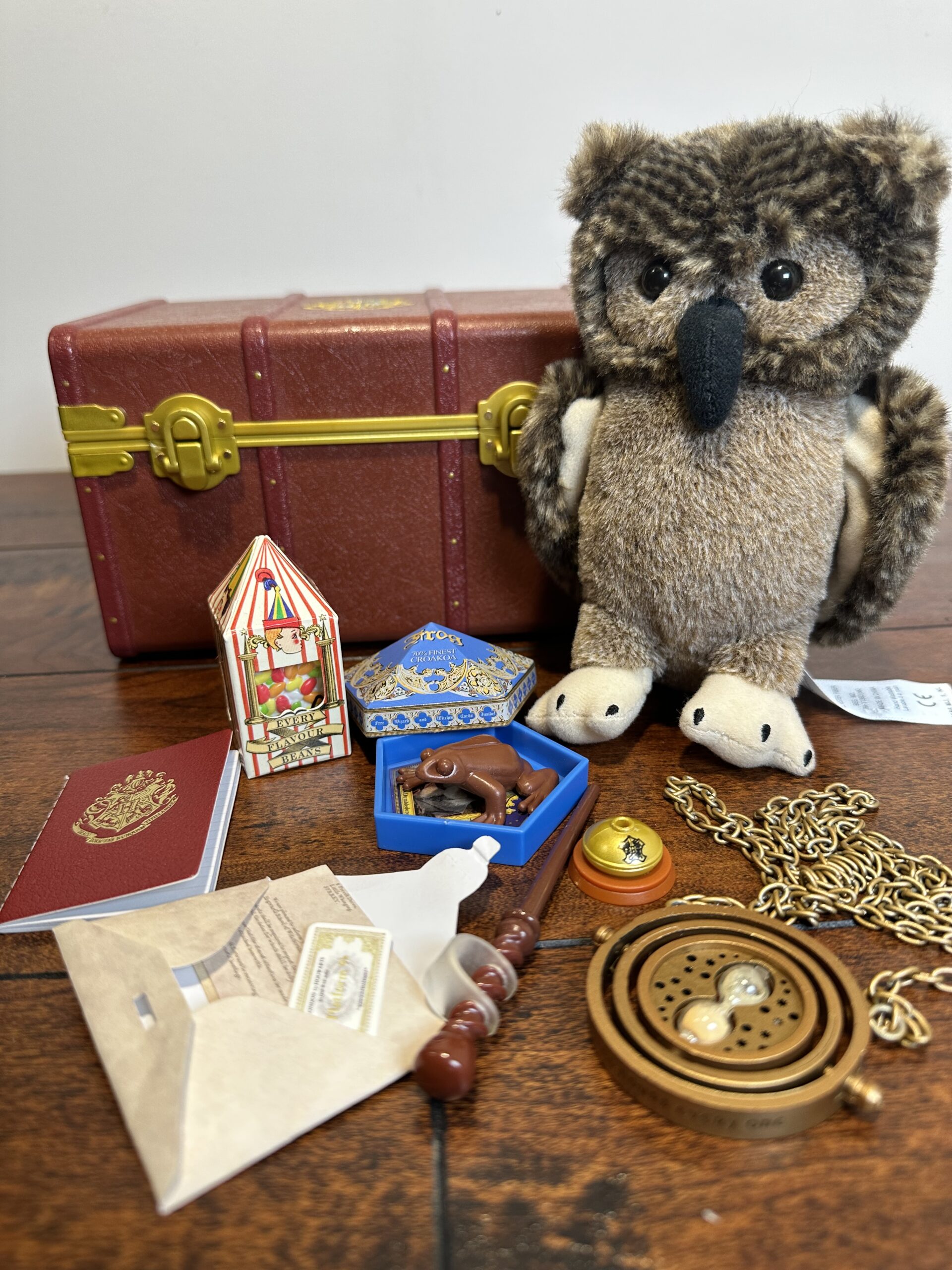 chocolate frog box, Bertie Bott’s Every Flavor Beans box, wand, time-turner necklace, letter, and Hogwarts Express ticket. The trunk and accessories are decorated with Hogwarts-related logos and designs.