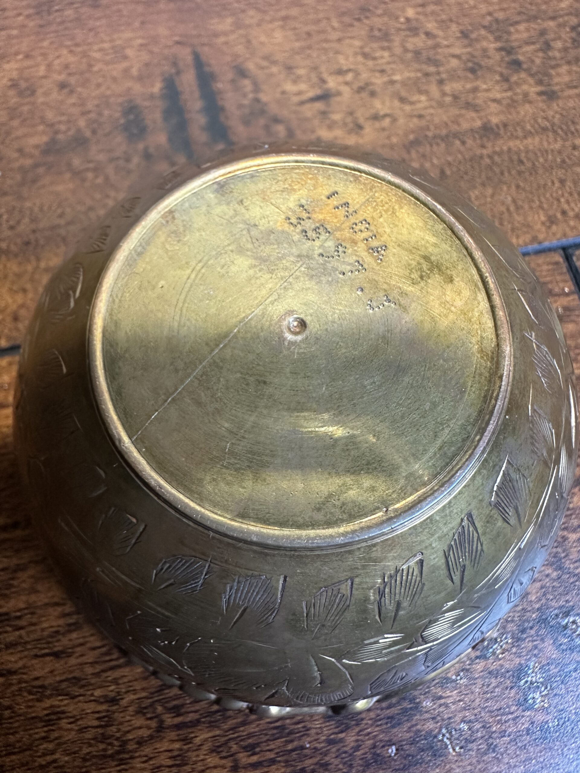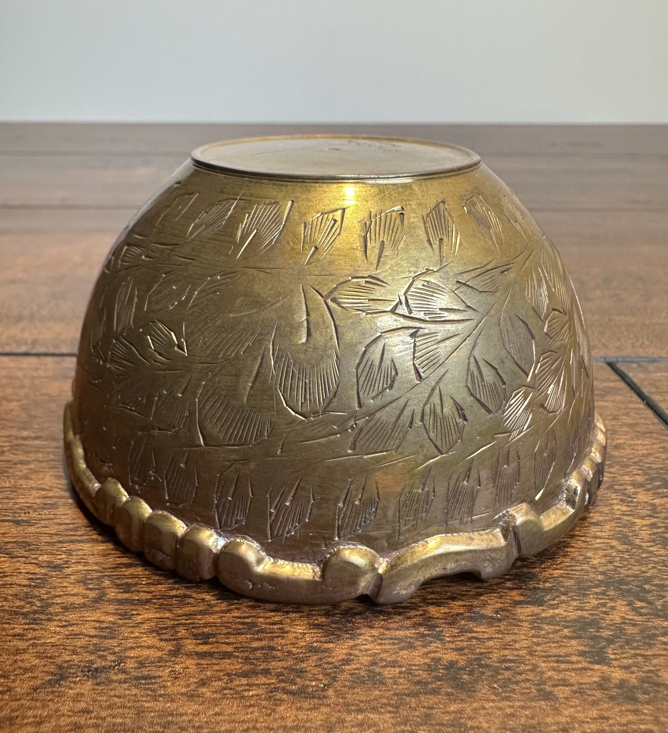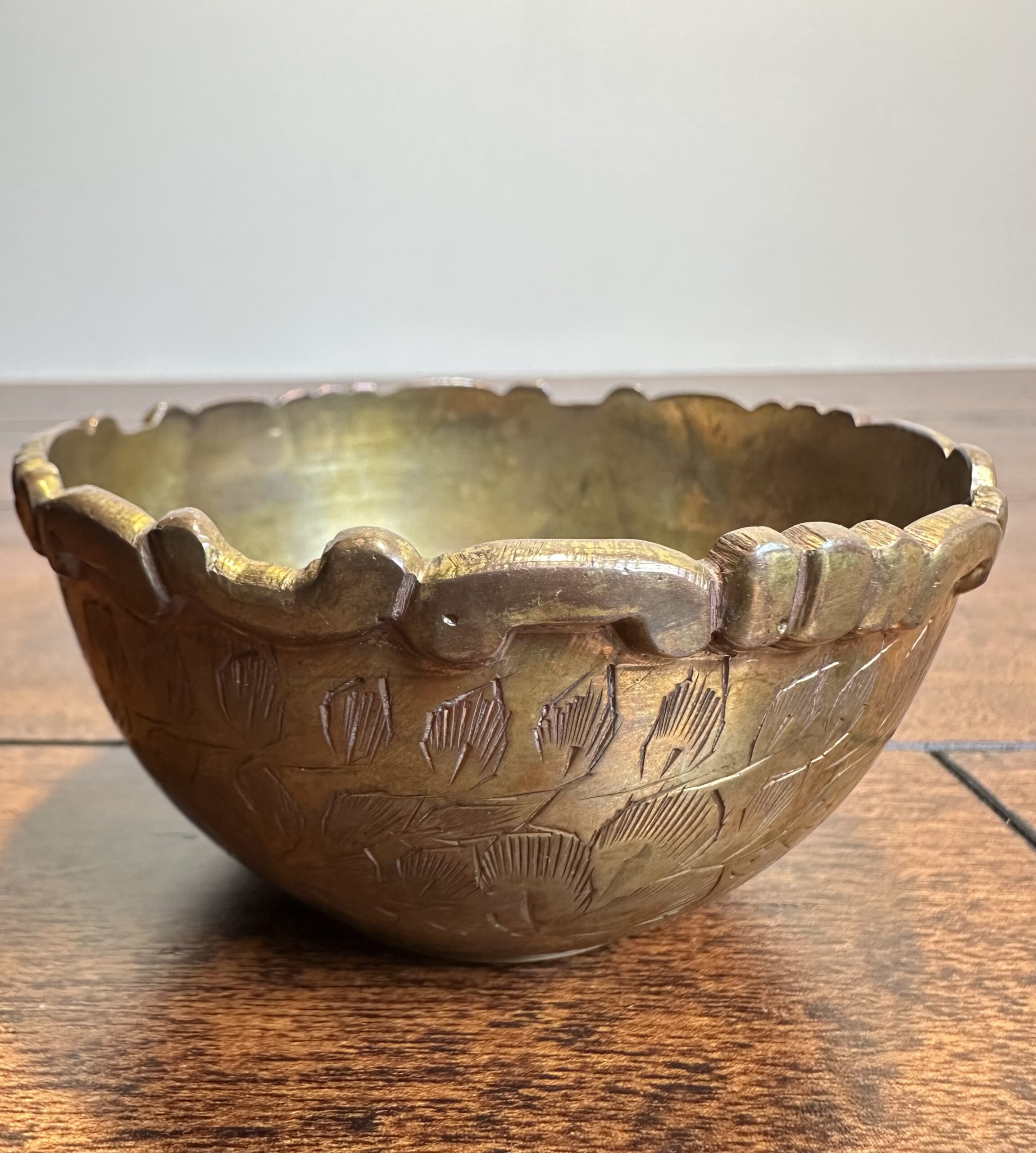 This vintage brass bowl, crafted in India, showcases intricate leaf carvings and a unique scalloped rim. Marked ‘India’ and ‘3597.3’ on the base, this piece carries a rich history and cultural charm. Note that, being a item of age, it shows wear and imperfections, which only add to its character.