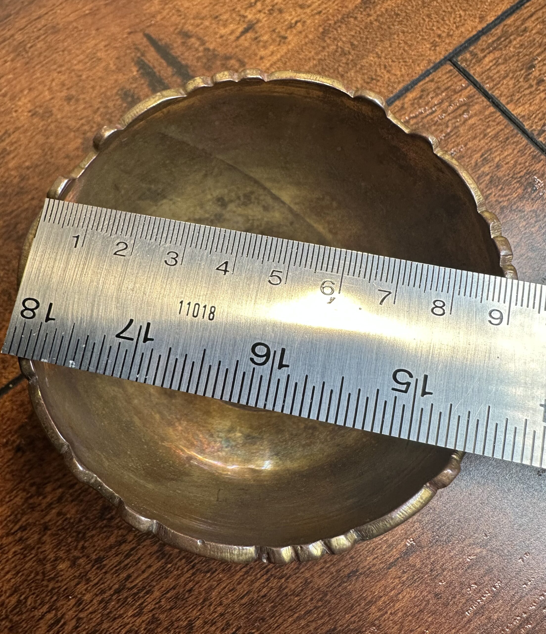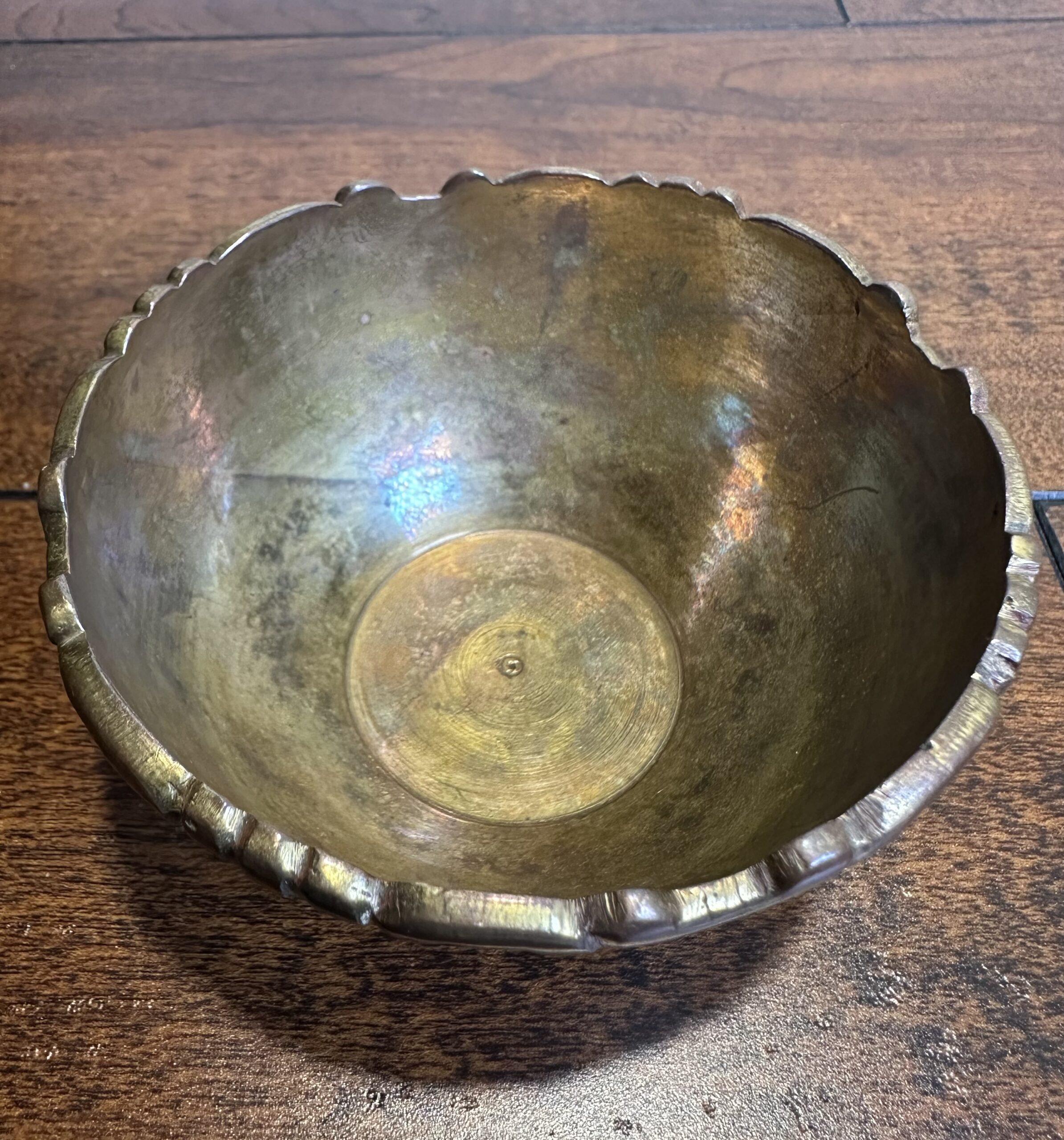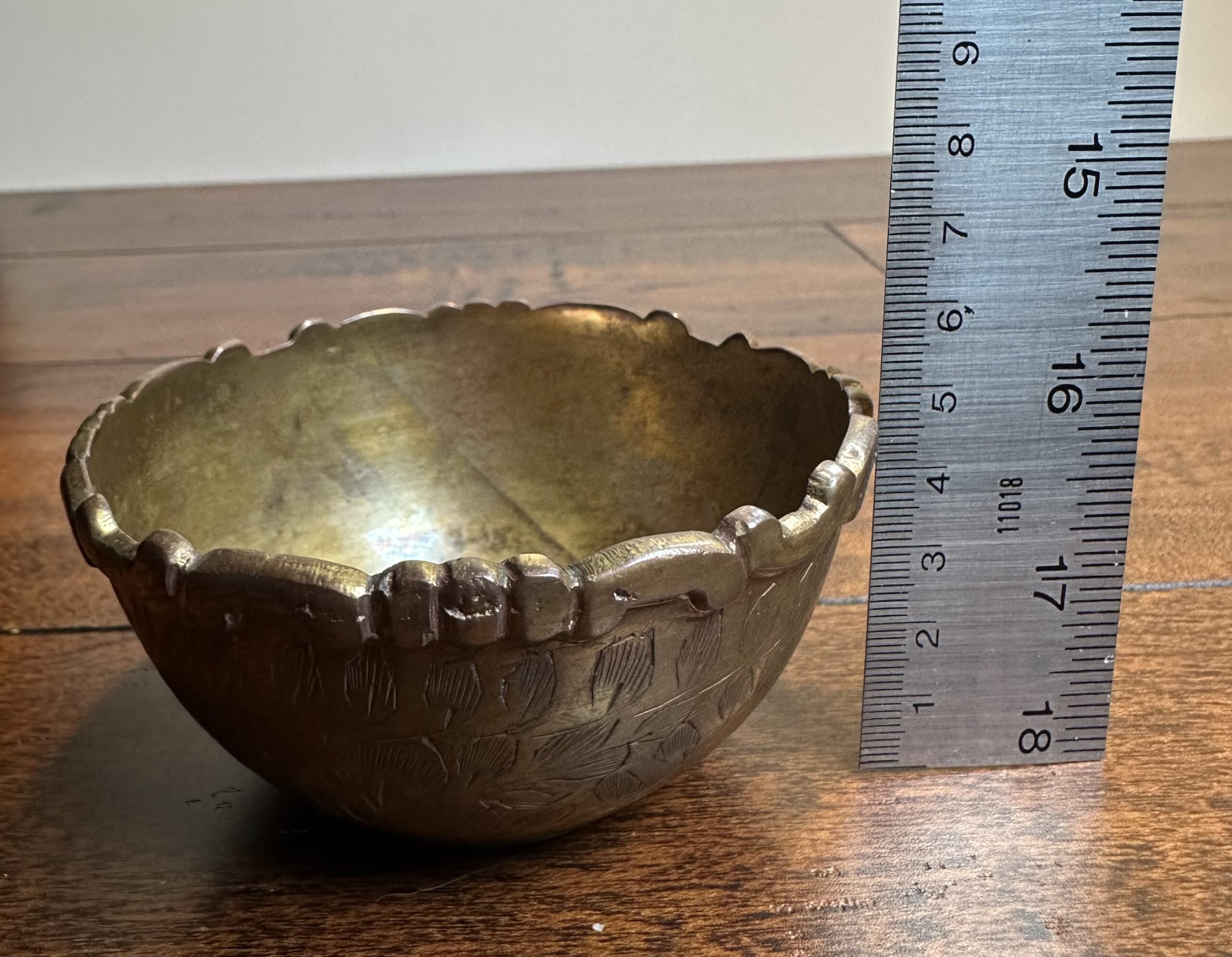 This vintage brass bowl, crafted in India, showcases intricate leaf carvings and a unique scalloped rim. Marked ‘India’ and ‘3597.3’ on the base, this piece carries a rich history and cultural charm. Note that, being a item of age, it shows wear and imperfections, which only add to its character.