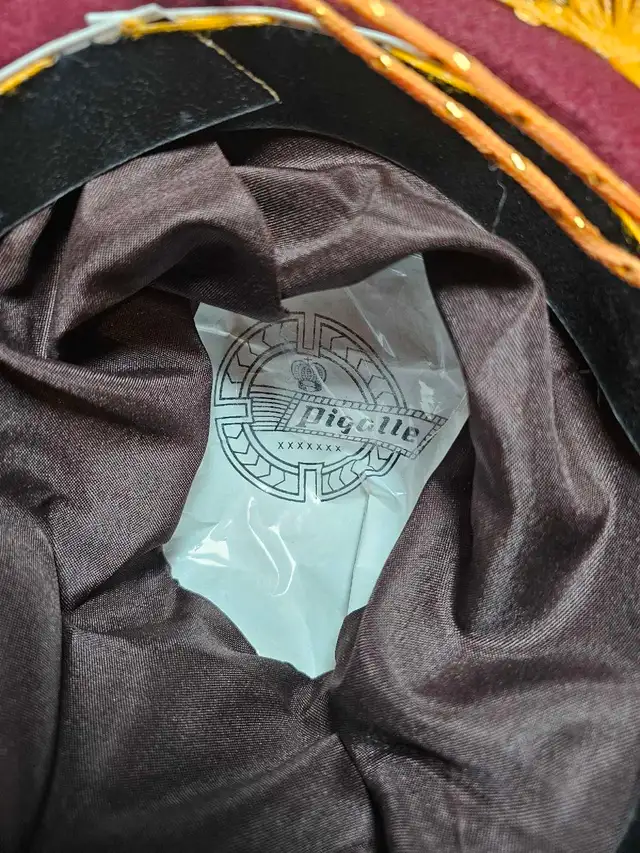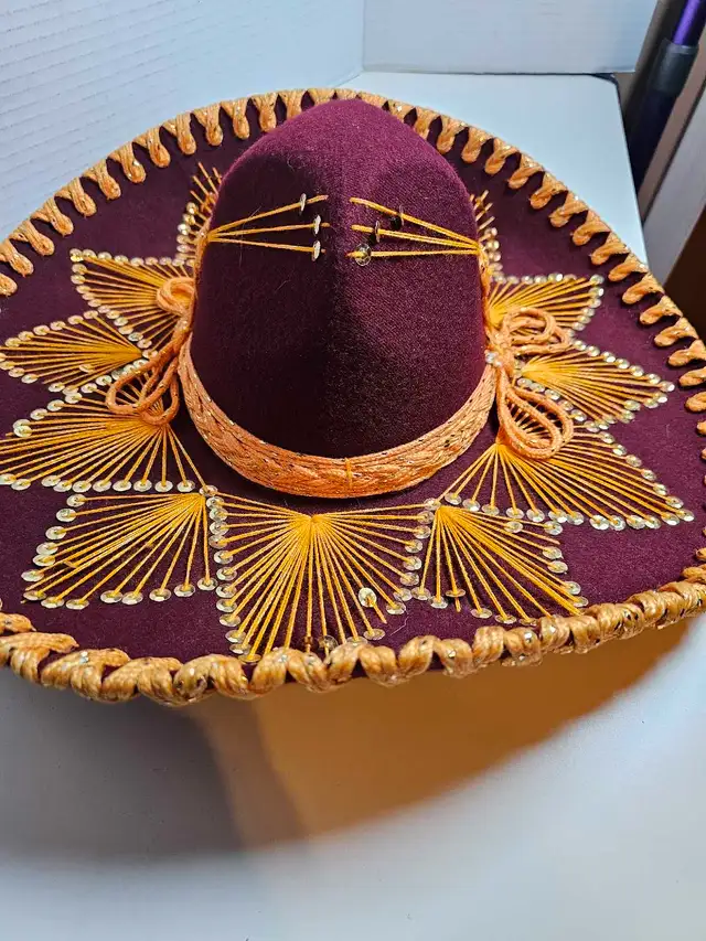 Adorn yourself with this vintage Pigalle Mexican sombrero, a unique piece showcasing purple and gold velvet. While it has been previously enjoyed, its distinctive design and craftsmanship make it a standout collectible.
