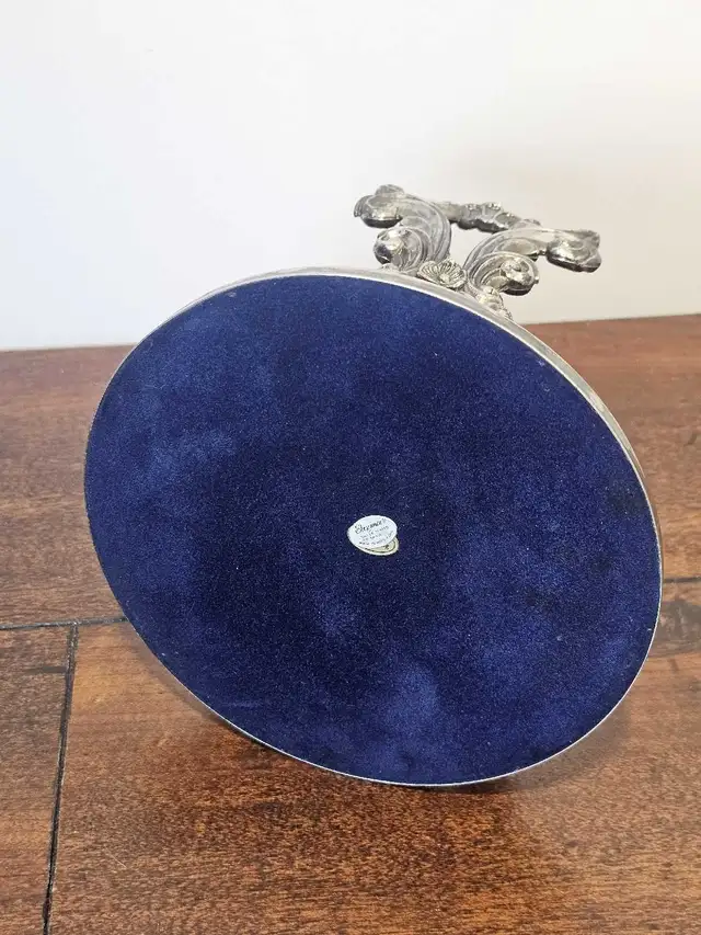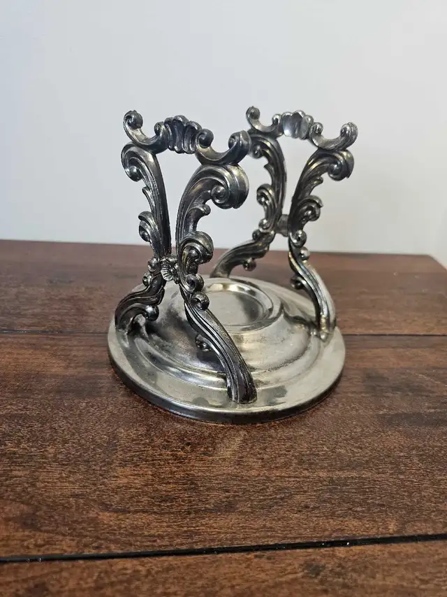 Enhance your table setting with this used, yet elegant, vintage silver plated stand made in Hong Kong. This ornate piece, marked ‘Elegance Silver Plated on Brass,’ features a beautiful design that adds a touch of sophistication to any occasion. It is in good condition, showing only slight signs of its age.