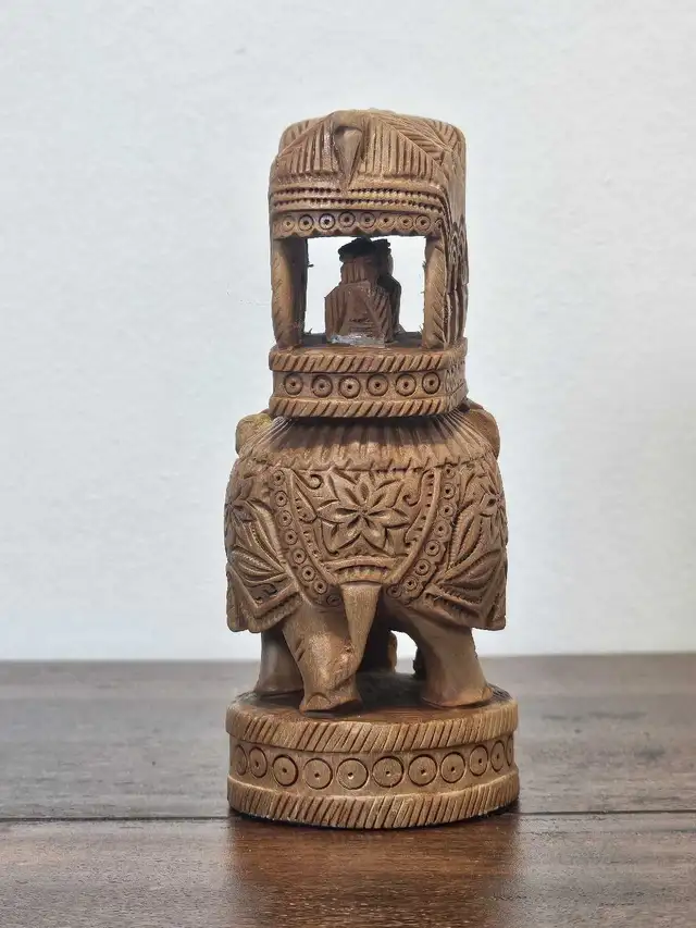 This is a beautiful and detailed vintage wood carving featuring an elephant with a rider, showcasing intricate craftsmanship, although there are signs of wear consistent with its age, which adds to its unique charm.