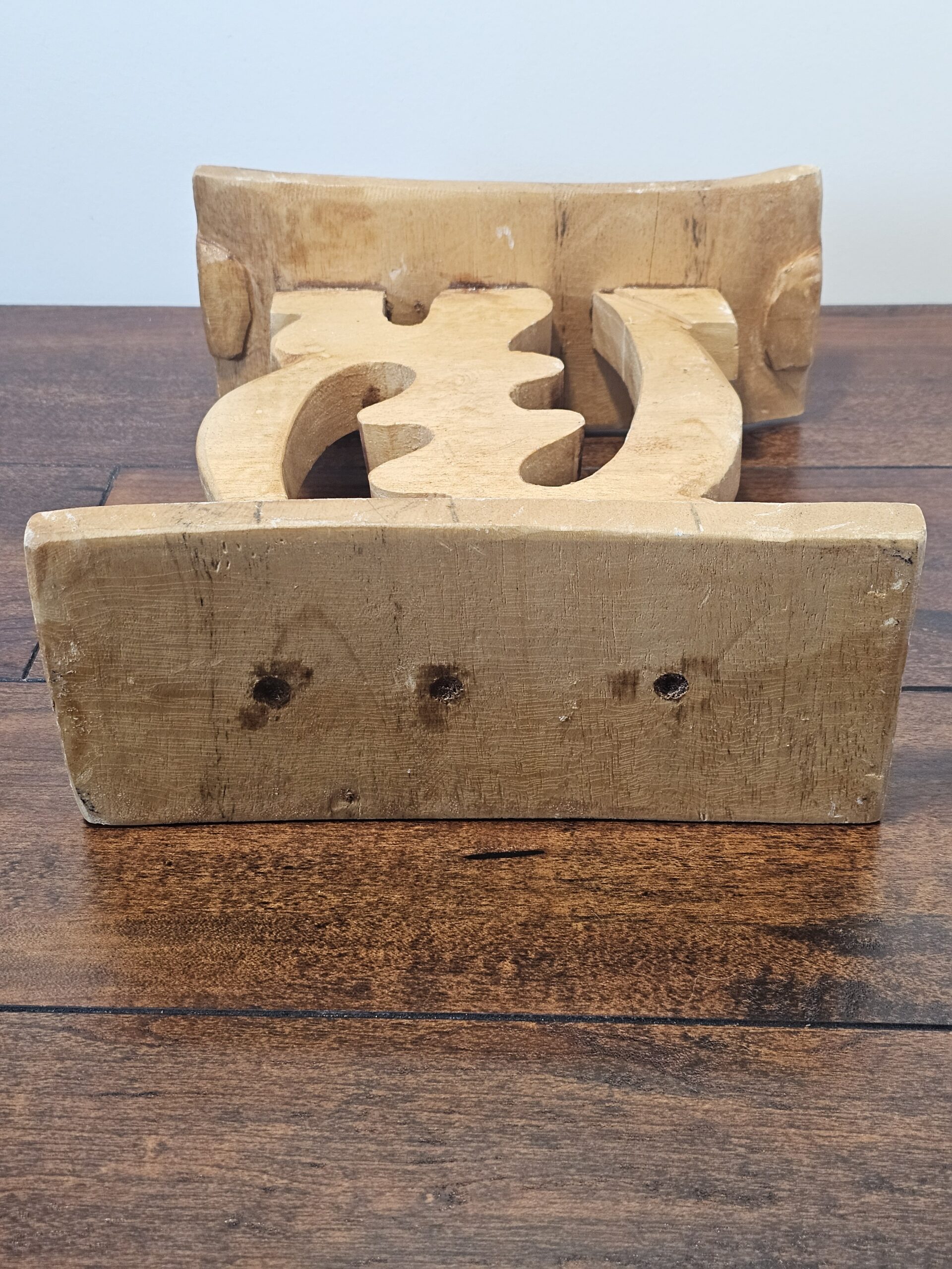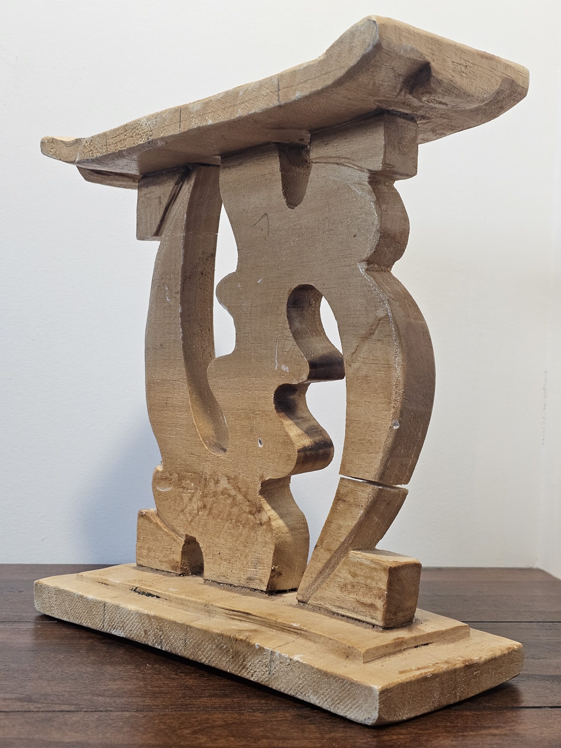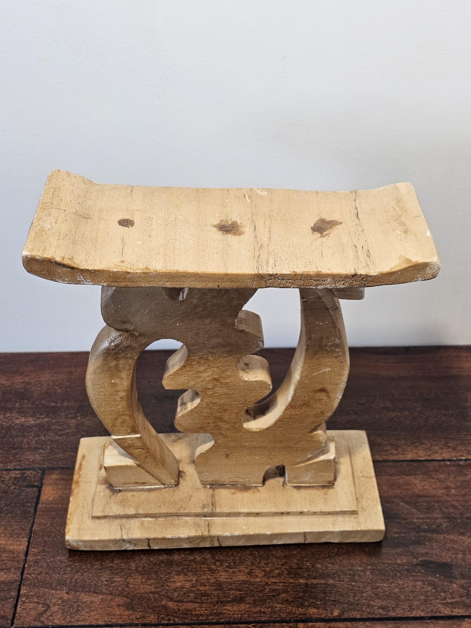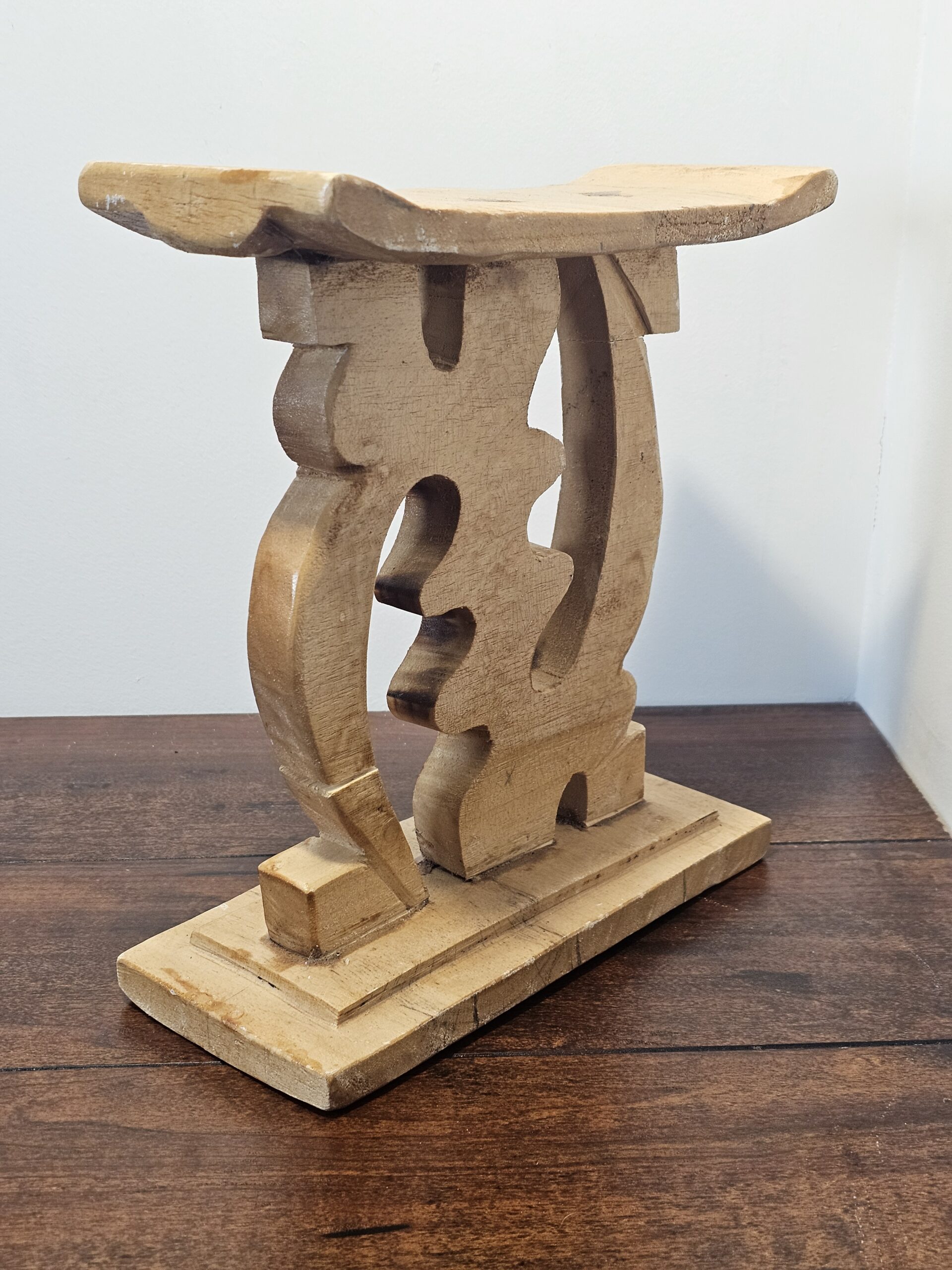 This unique handcrafted wooden stool features an intricate carved design, showcasing skilled craftsmanship. Ideal as a decorative piece or a functional small stand, it is made from natural wood with a light, rustic finish. The stool is in good condition with some visible wear, adding to its vintage charm. Measurements are approximately 12 inches in height.