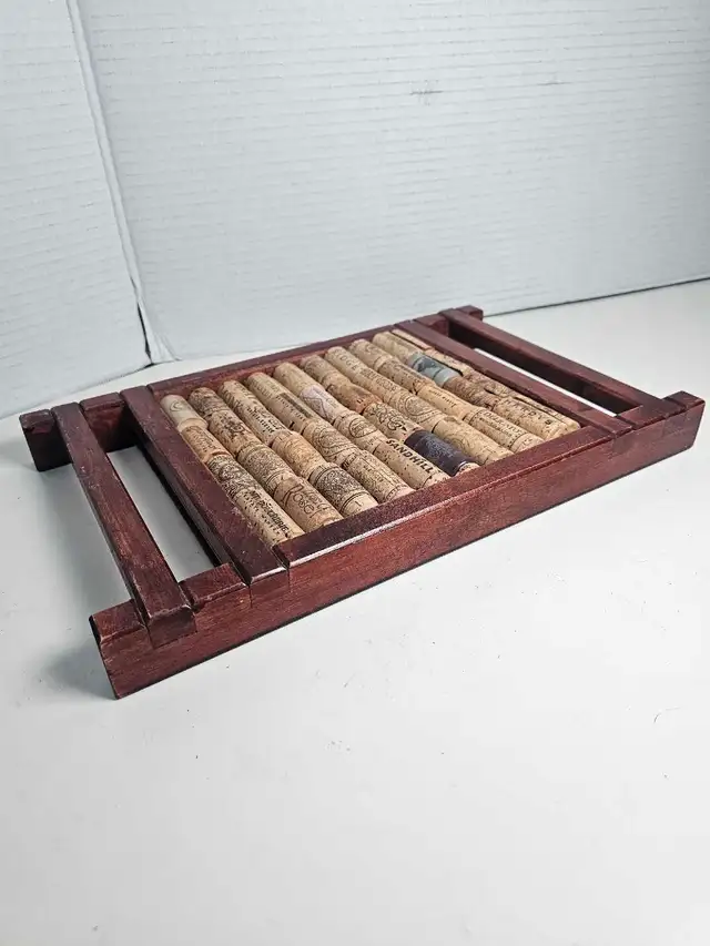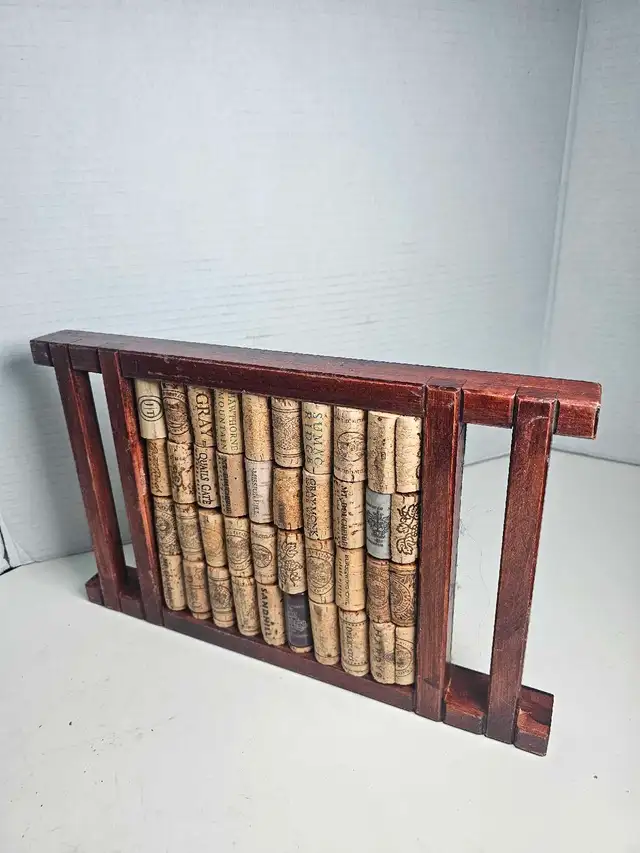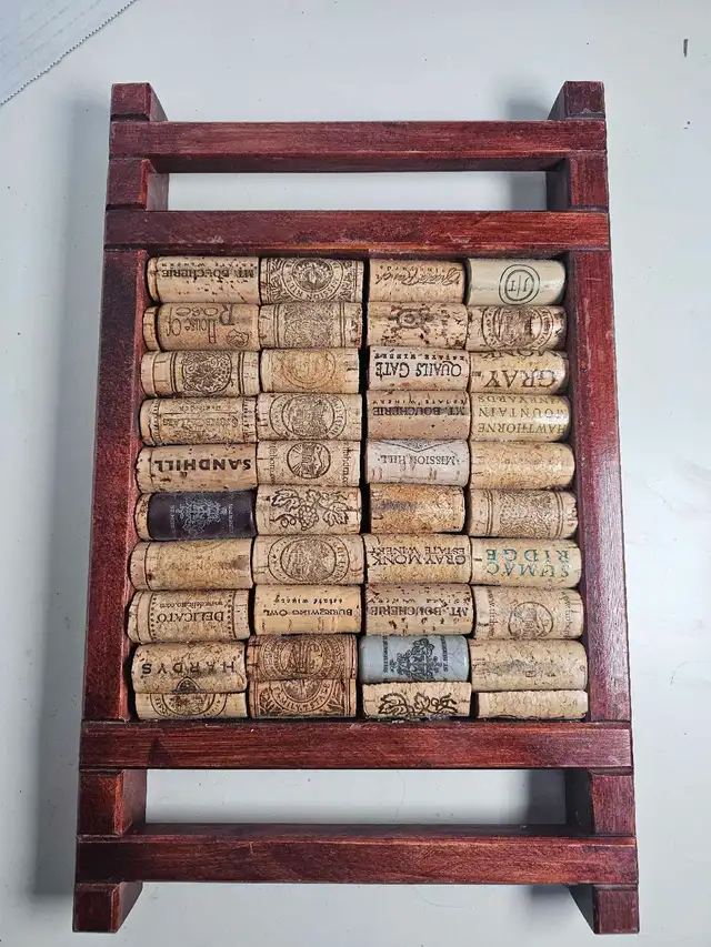 This unique wine cork art piece features a collection of various wine corks artfully arranged in a wooden frame, making it a great conversation starter and decorative item for any wine lover’s home, and is in used condition.