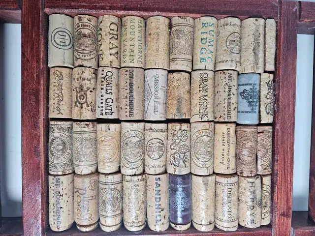 This unique wine cork art piece features a collection of various wine corks artfully arranged in a wooden frame, making it a great conversation starter…
