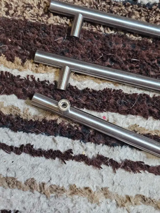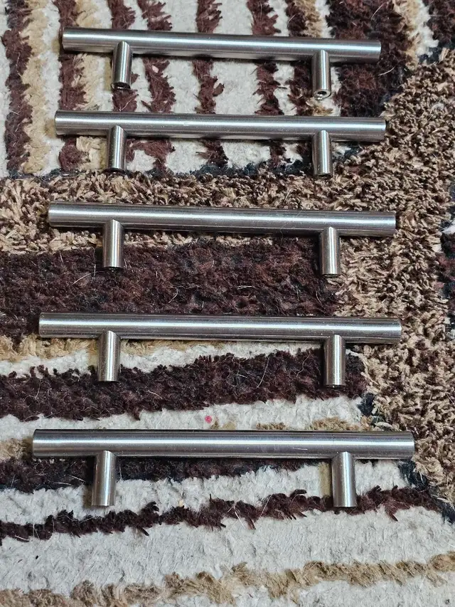 Set of cabinet or drawer pulls, each 4 inches in length, these stainless steel handles are a sleek upgrade for your kitchen or furniture. Previously installed, these are in good condition and ready to add a modern touch to your space.