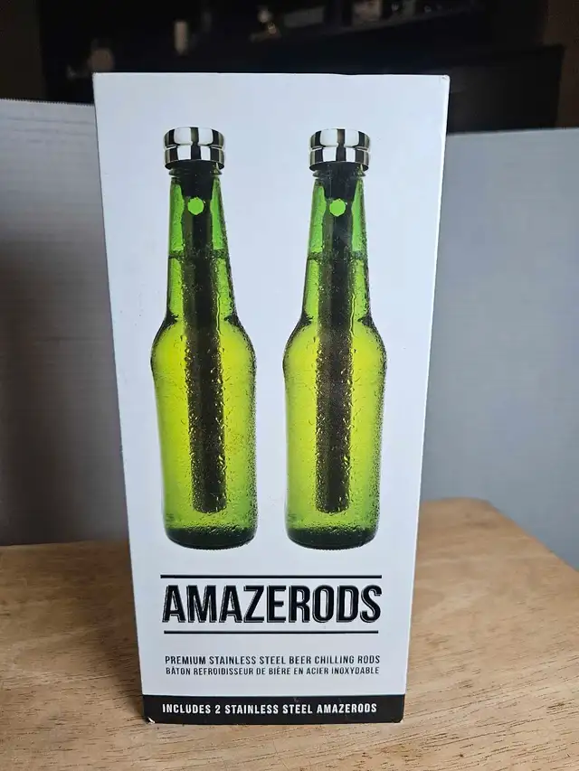 Enjoy perfectly chilled beer with this set of two Amazerods premium stainless steel beer chilling rods. These rods are designed to fit most standard long neck beer bottles, keeping your beer cold for longer. They are new, unused, and ready to enhance your drinking experience.