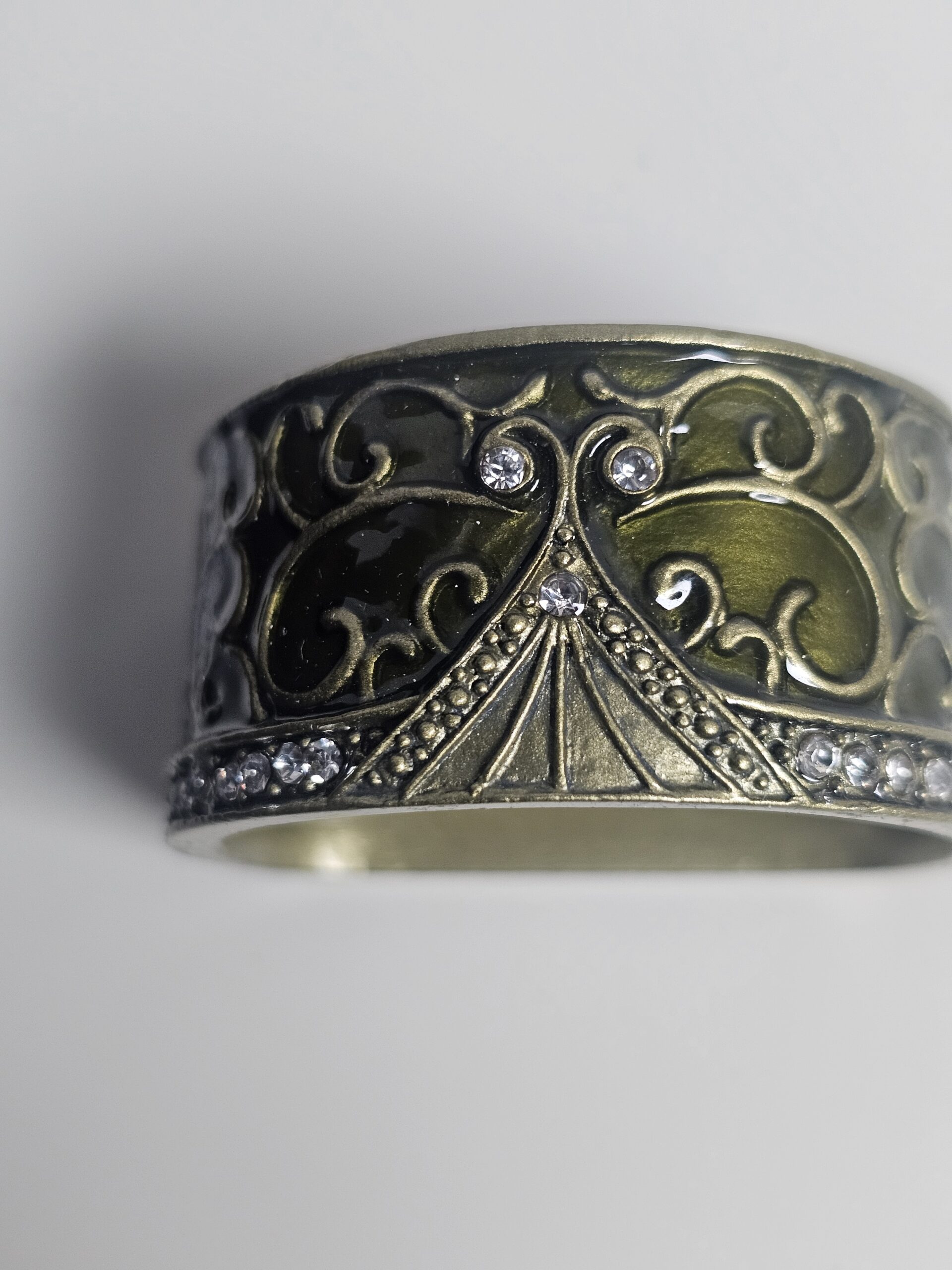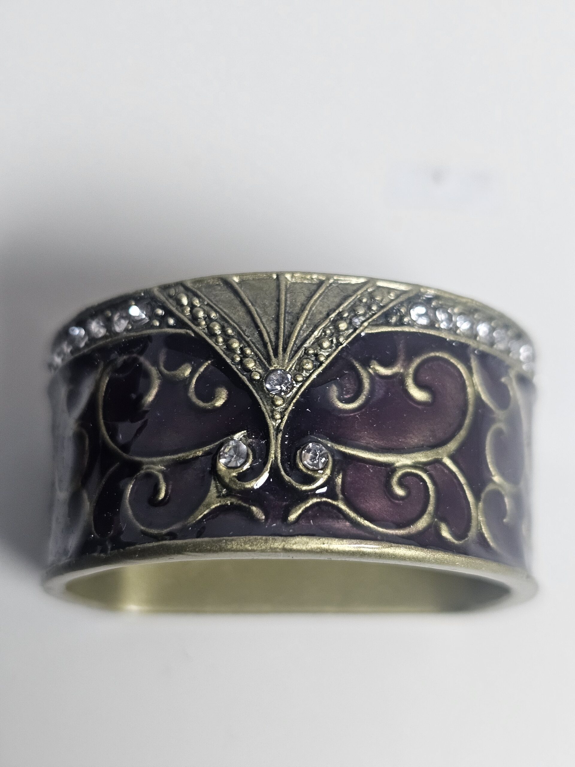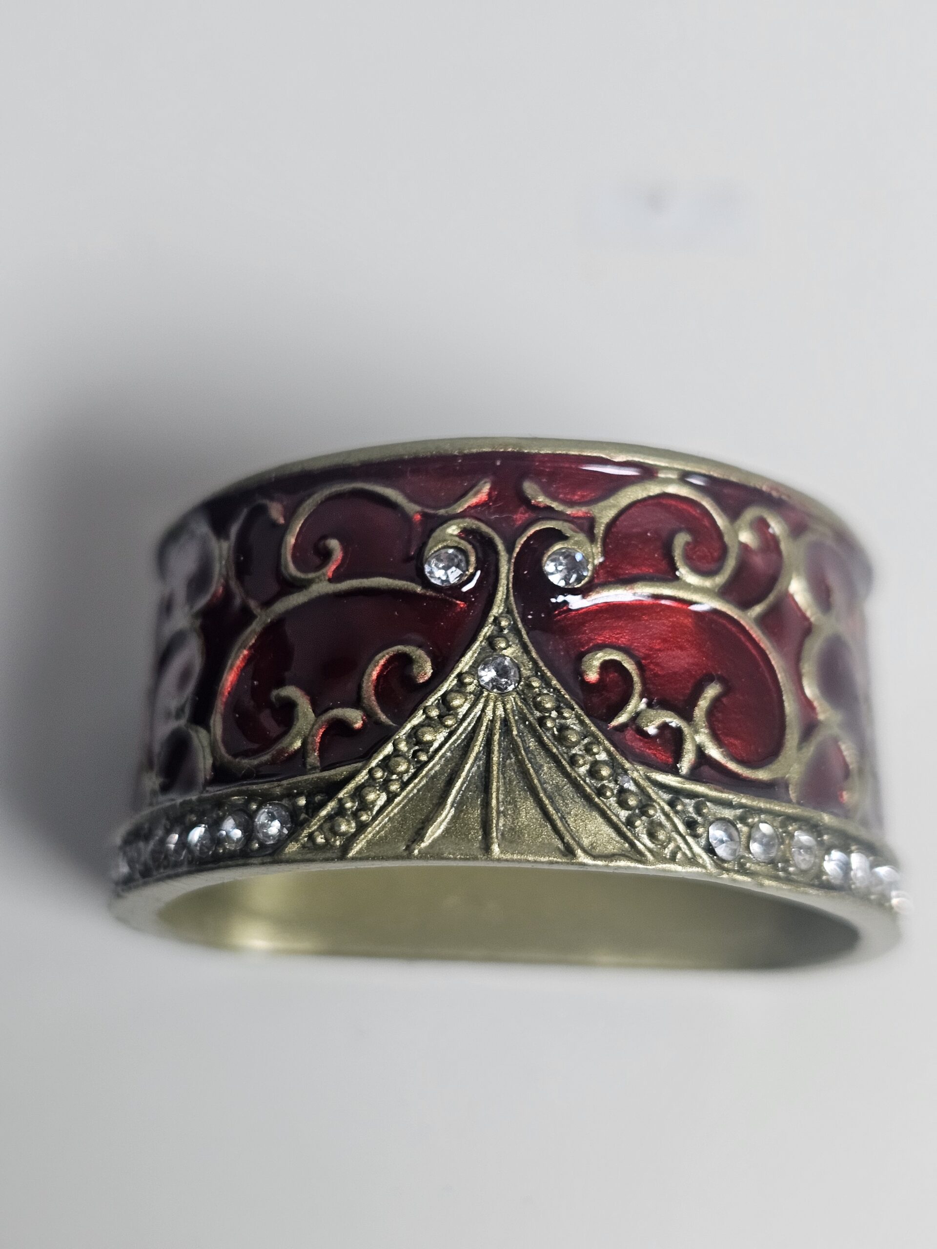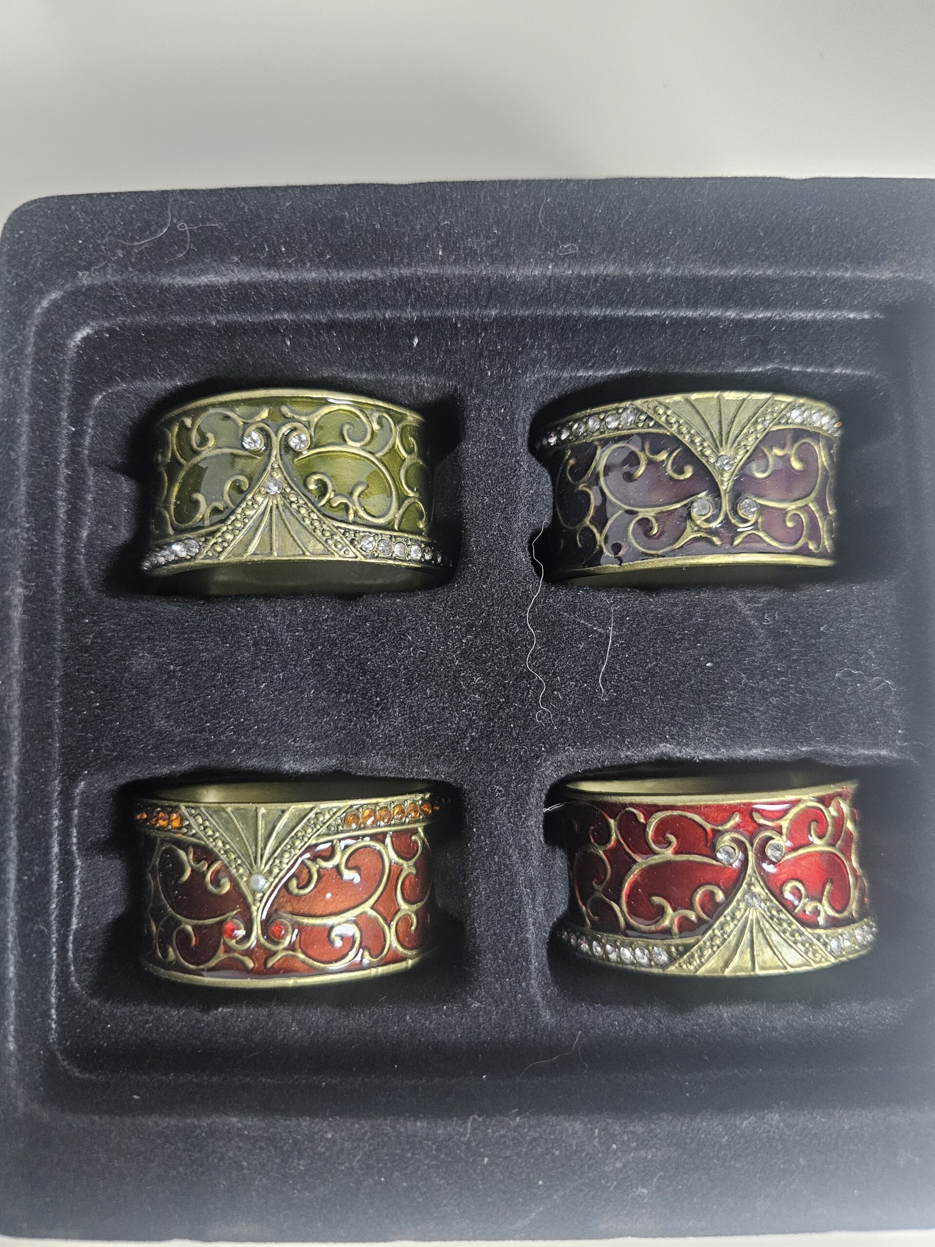 This set includes four beautifully designed napkin rings by Bombay, featuring intricate scrollwork and sparkling gem accents. Each ring showcases a unique color and design, adding elegance to your dining experience. The napkin rings are in excellent condition with no visible flaws and come in the original box. Perfect for special occasions or everyday luxury.