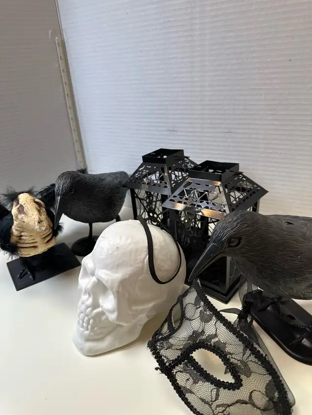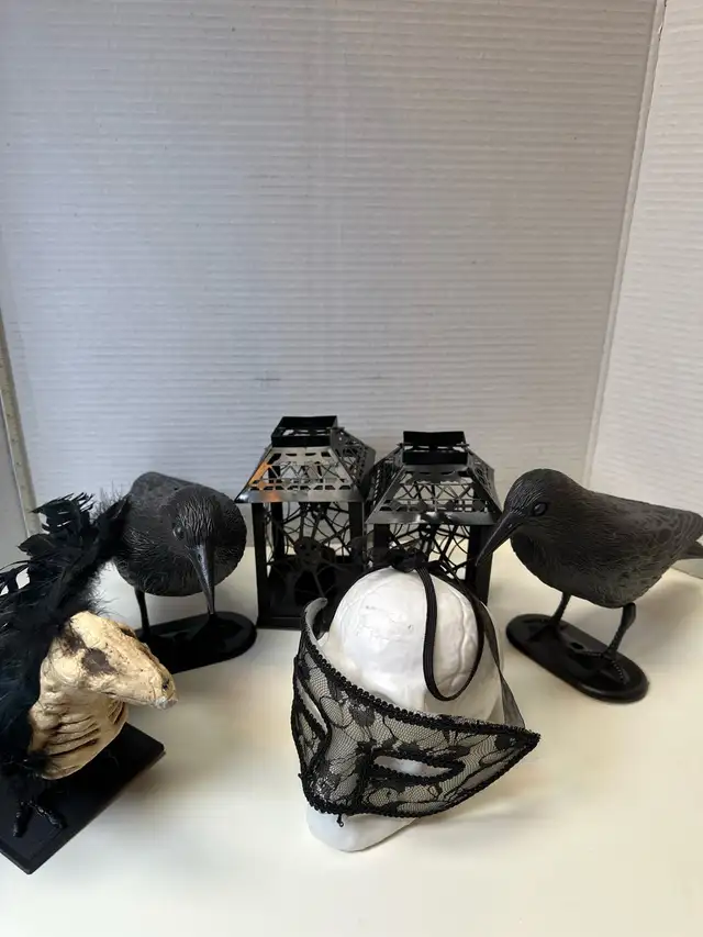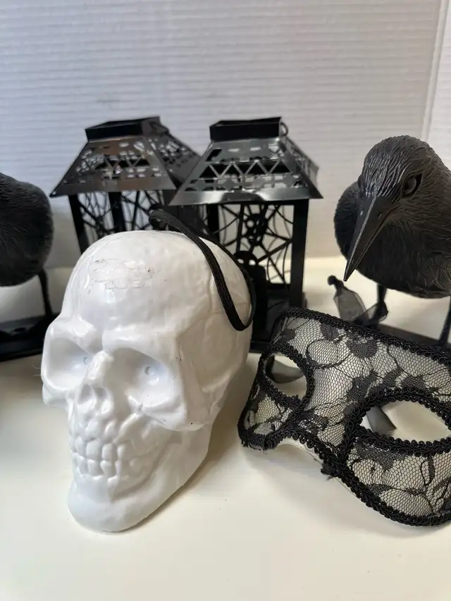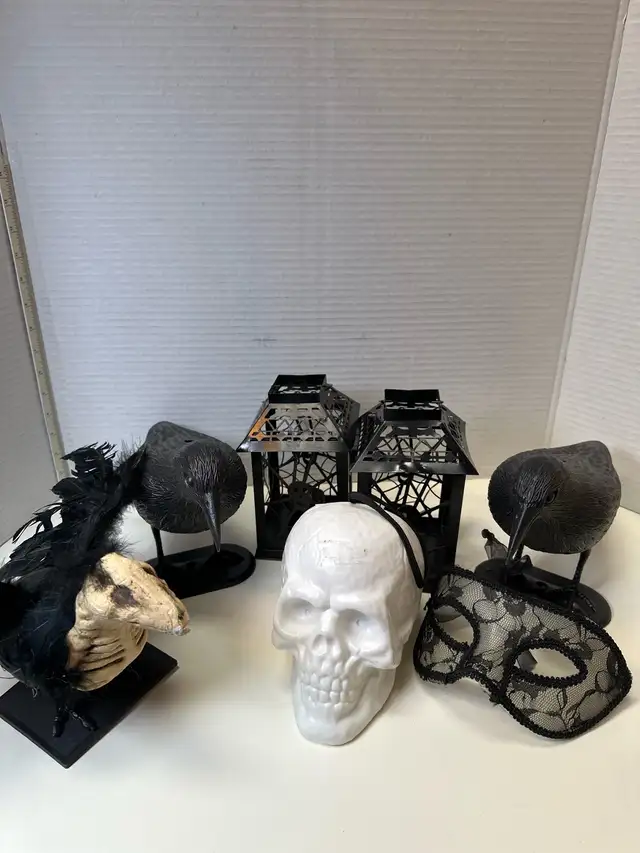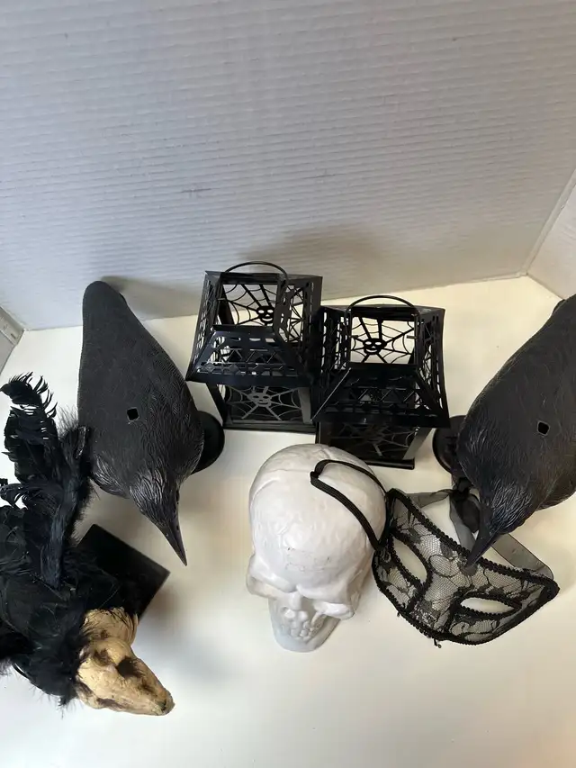 I’m selling a spooky assortment of Halloween decorations that will add a haunted touch to your home this season! Included in this creepy collection are a pair of ominous black crows, two lanterns with spooky spider web designs, a skull wearing a lace mask, and a witch’s head for that extra eerie feel. All items are in used condition, ready to bring some frightful fun to your Halloween display.