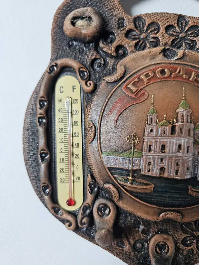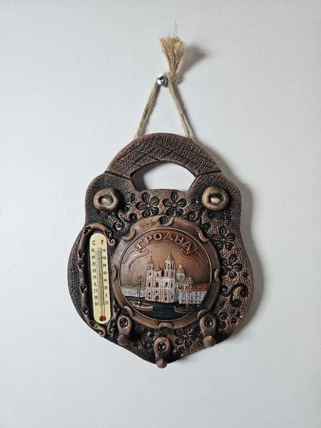 This is a souvenir key holder featuring a thermometer and a charming depiction of what I believe is a Ukrainian Orthodox Church. The piece is…