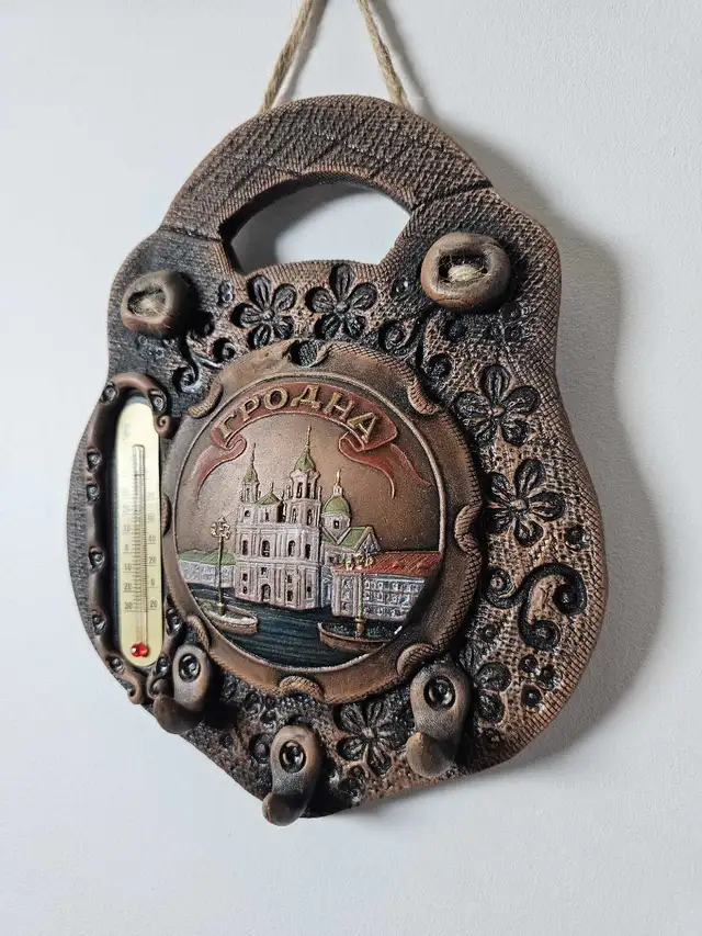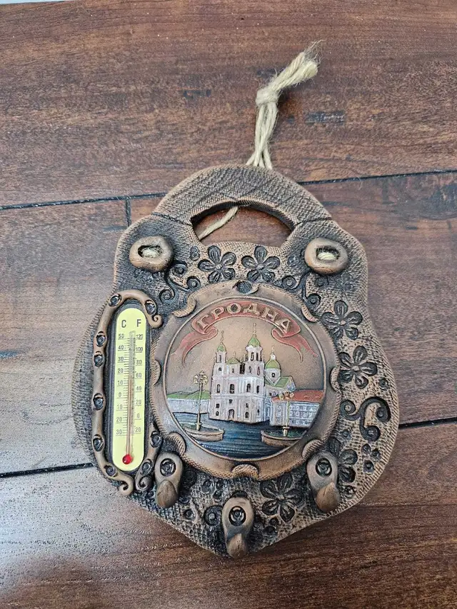 This is a souvenir key holder featuring a thermometer and a charming depiction of what I believe is a Ukrainian Orthodox Church. The piece is used but remains in good condition, ready to bring a bit of worldly charm to your entryway. The thermometer is in working order. Looking at similar items on Kijiji, a reasonable price for this piece would be $15. If you’re reading this, it’s still available-no need to wonder! Add a touch of whimsy to your home decor!
