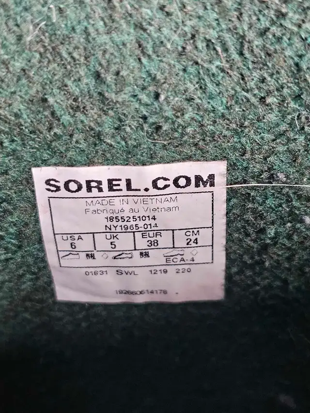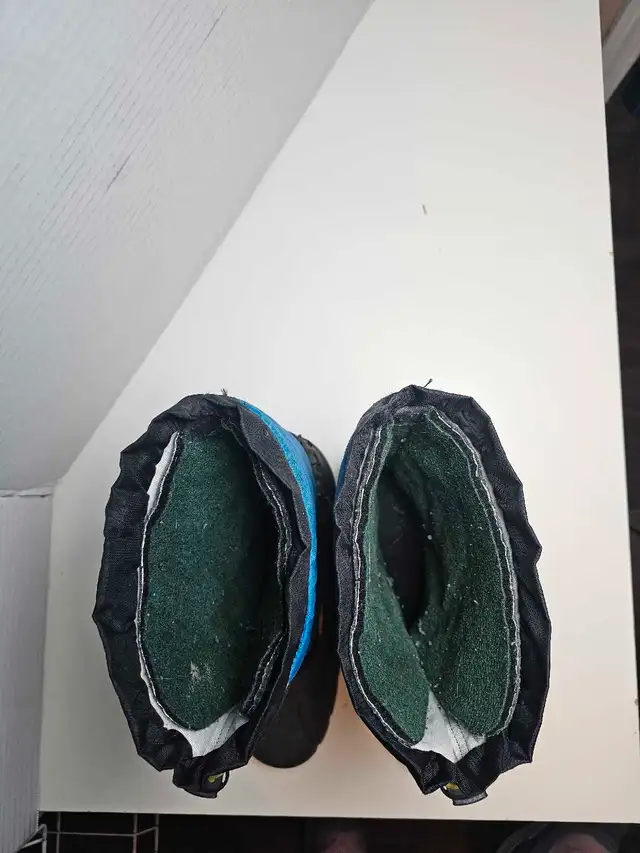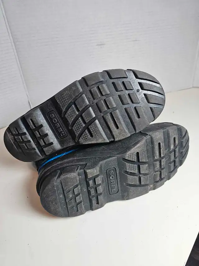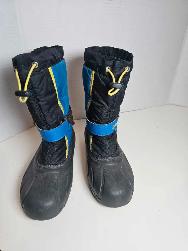 Keep your little one’s feet warm and dry with these Sorel winter boots, perfect for snowy adventures! These boots are a size 6 and feature a durable black rubber foot with a blue and black nylon upper, accented with yellow details. They come with adjustable hook and loop straps for a snug fit and a drawstring closure at the top to keep snow out. The boots are used but in good condition, ready for lots of fun in the snow.