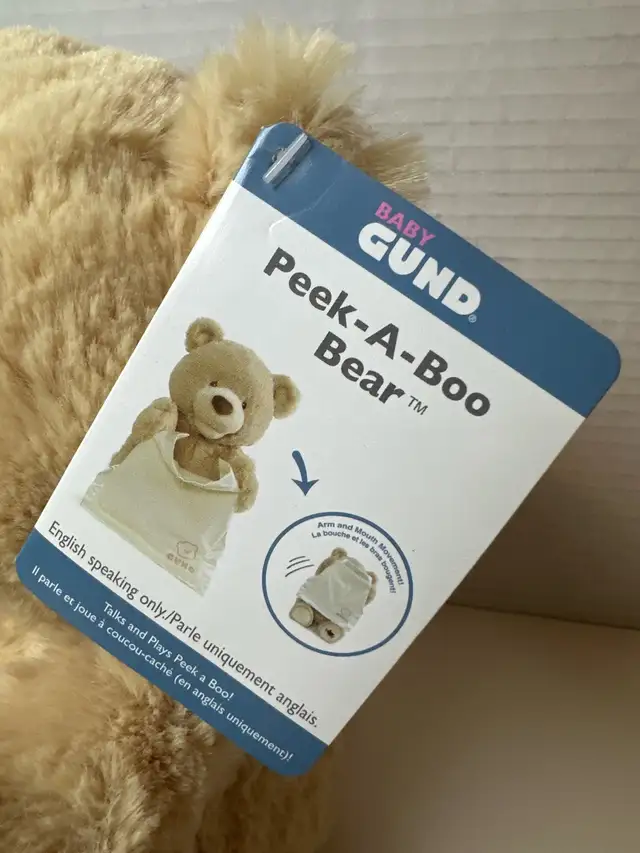 This is a new Gund Peek-A-Boo Bear, an adorable interactive plush toy that features arm and mouth movement. The bear talks and plays peek-a-boo, providing endless entertainment for little ones. This cuddly companion is in pristine condition, ready to bring joy and laughter to its new home!