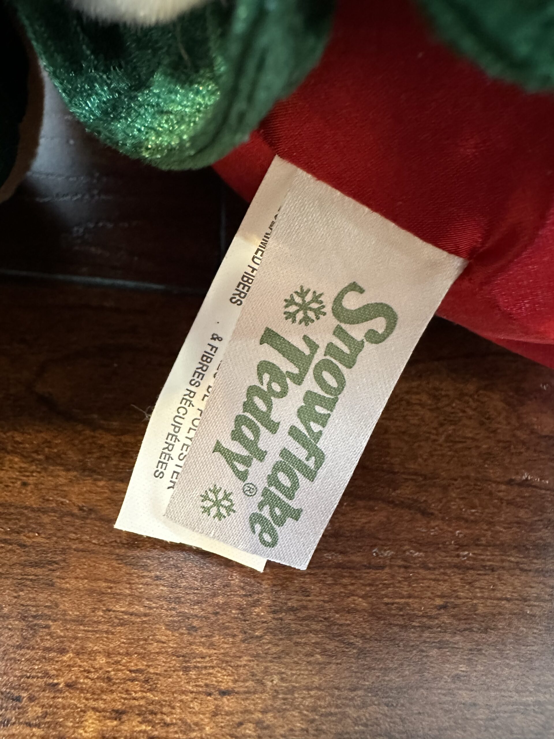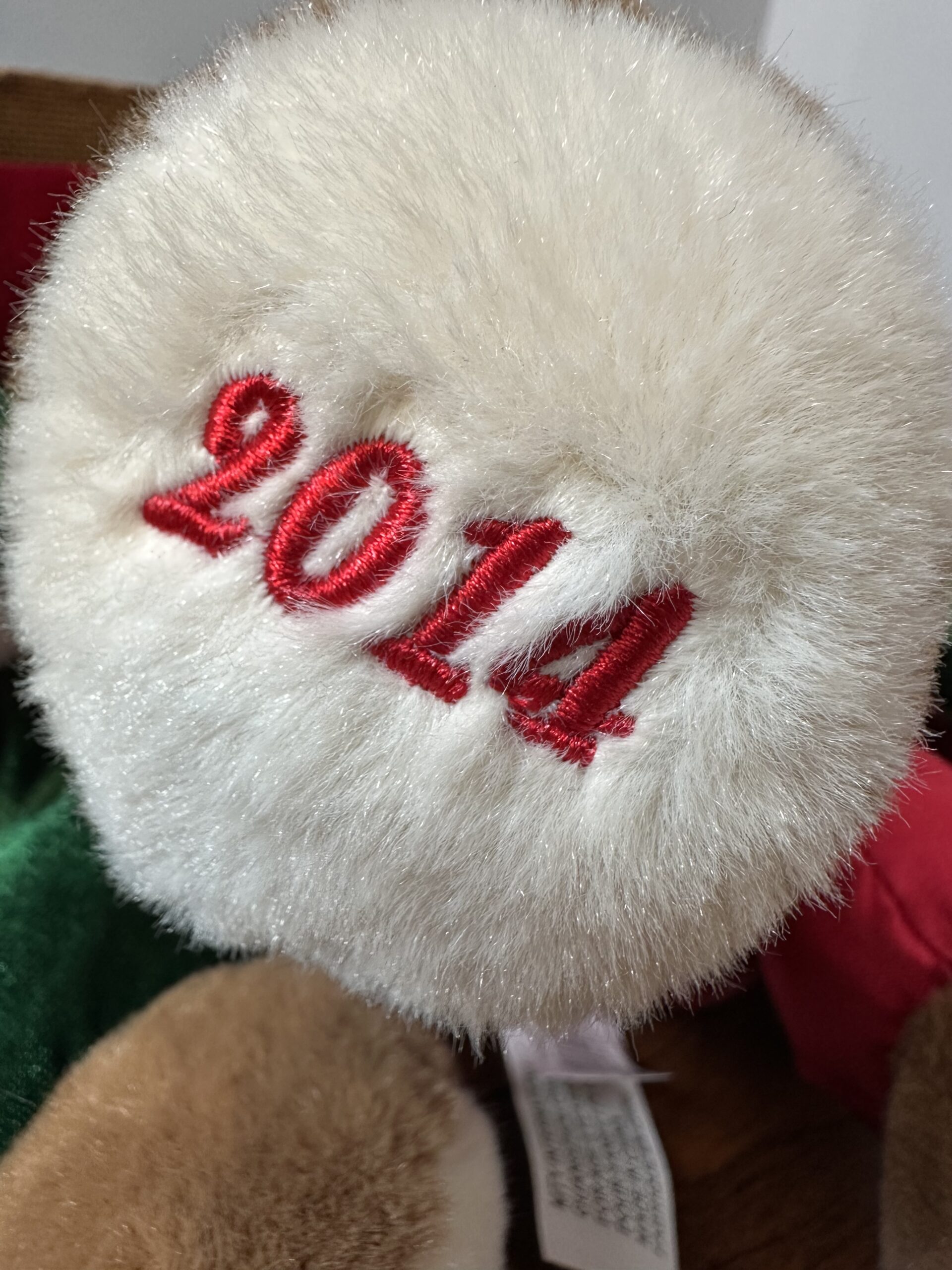 This charming set of Snowflake Teddy bears is perfect for adding festive cheer to your home. Dressed in red and green holiday outfits, these plush bears are in good condition with no visible defects. Made of soft polyester, they are dated 2014 on the feet. Ideal for collectors or as seasonal decor.