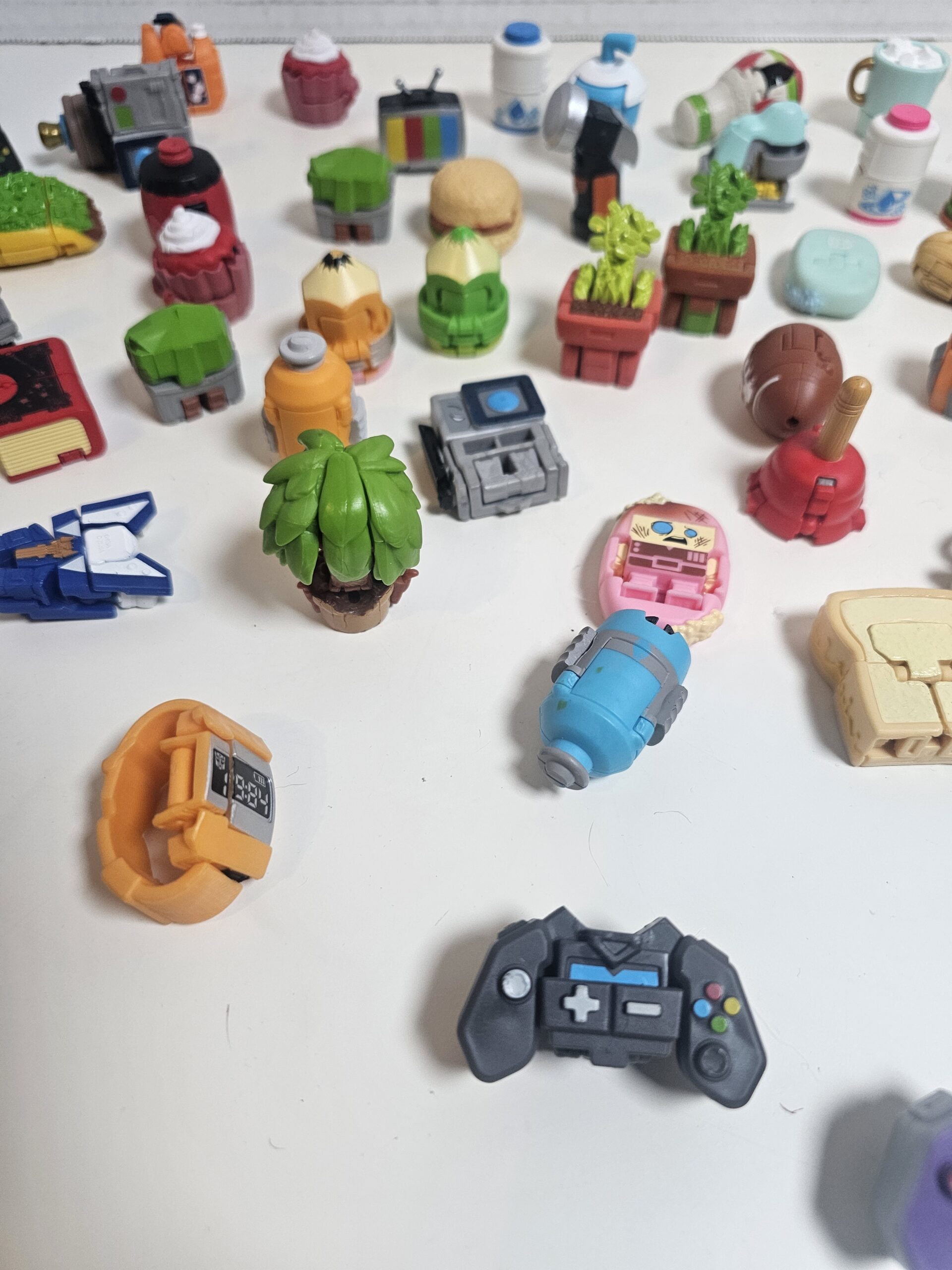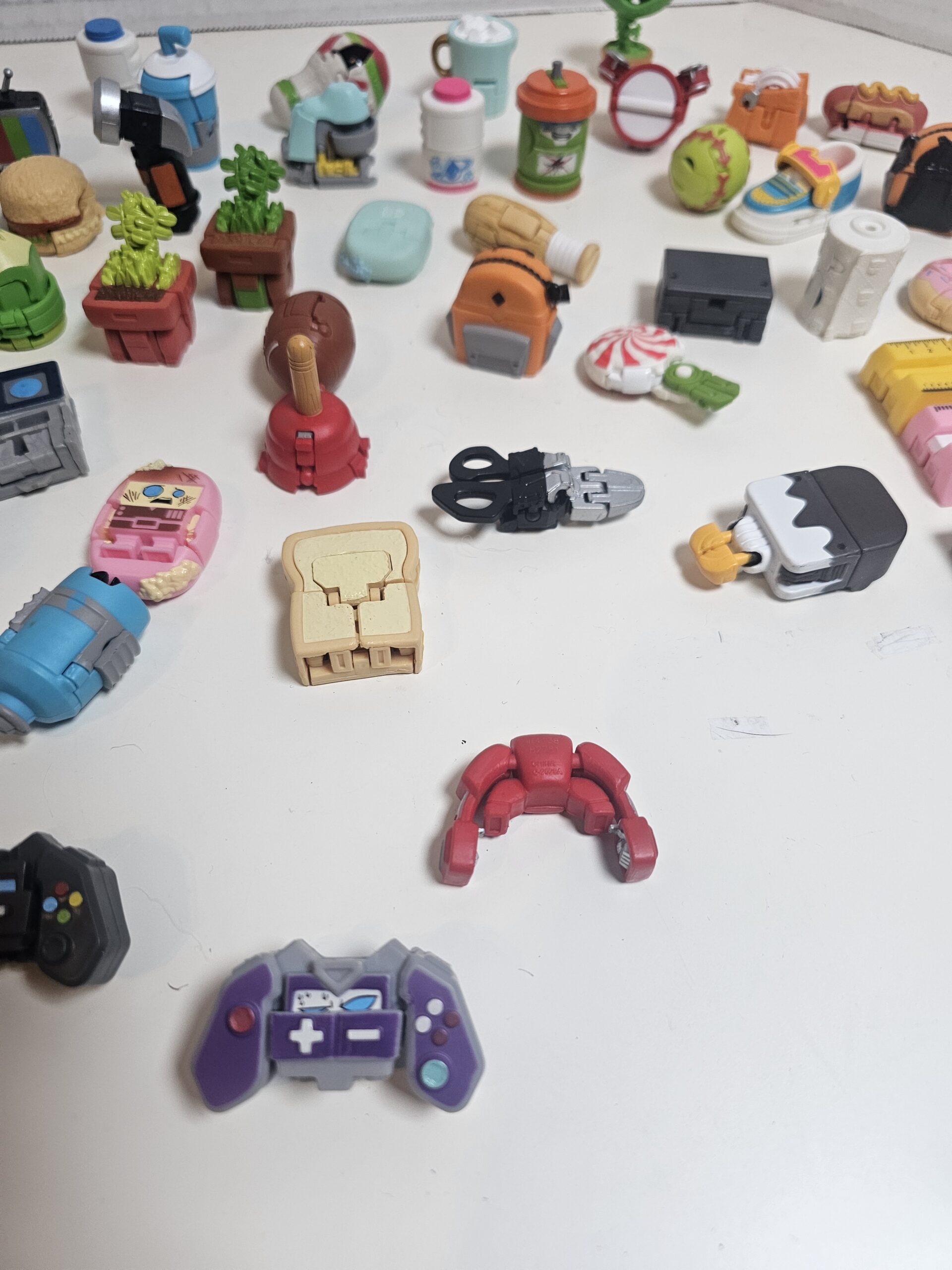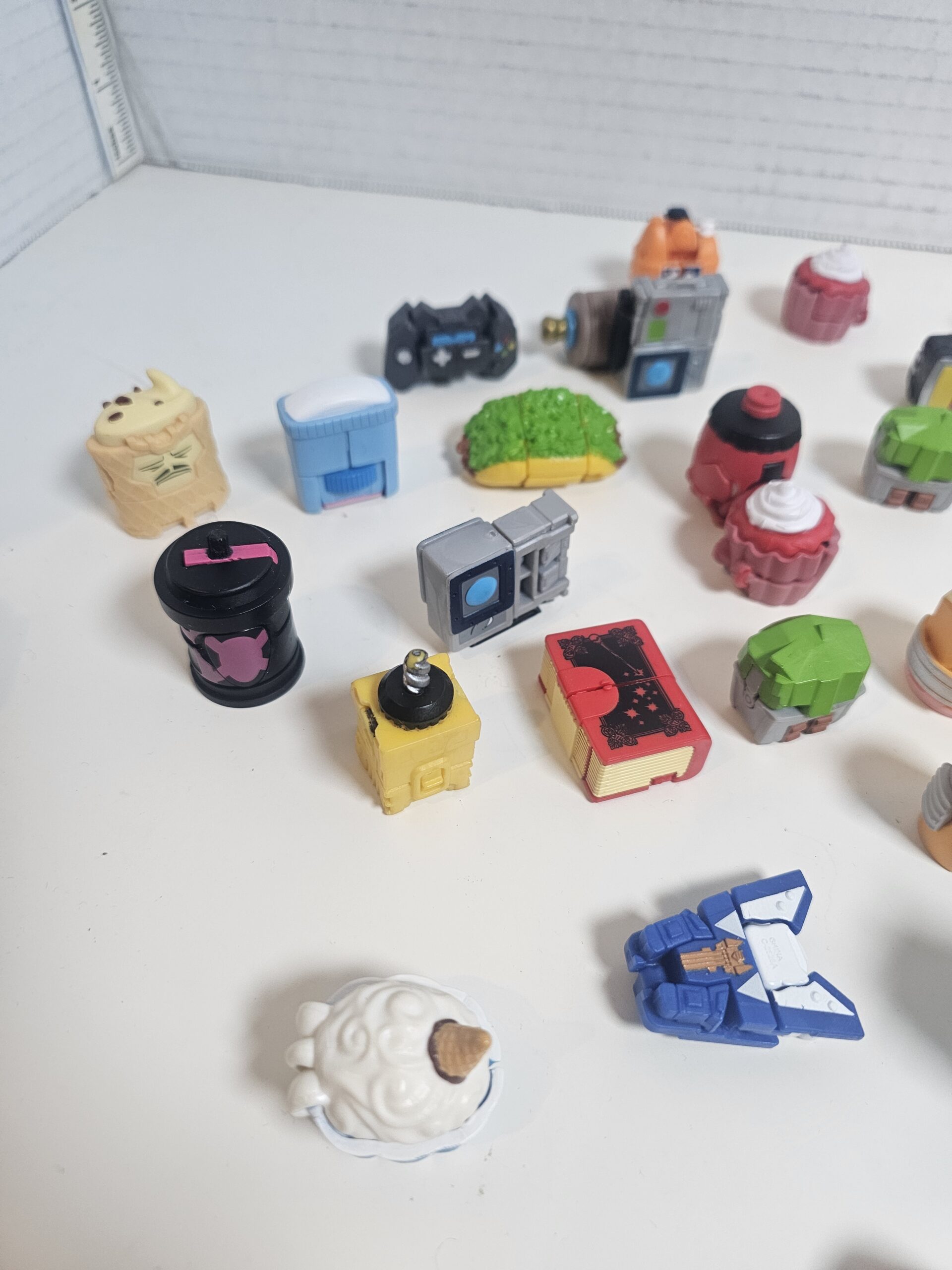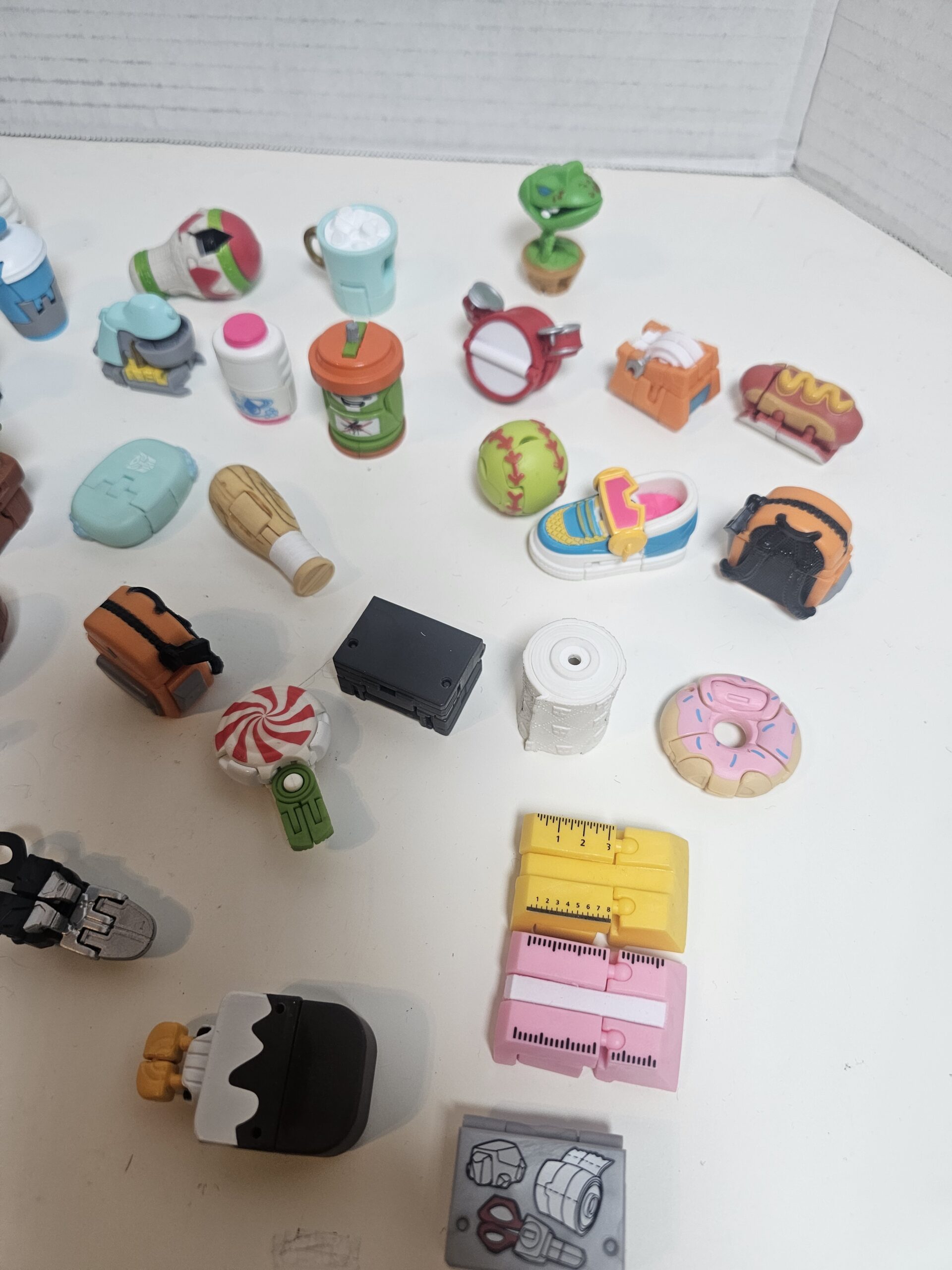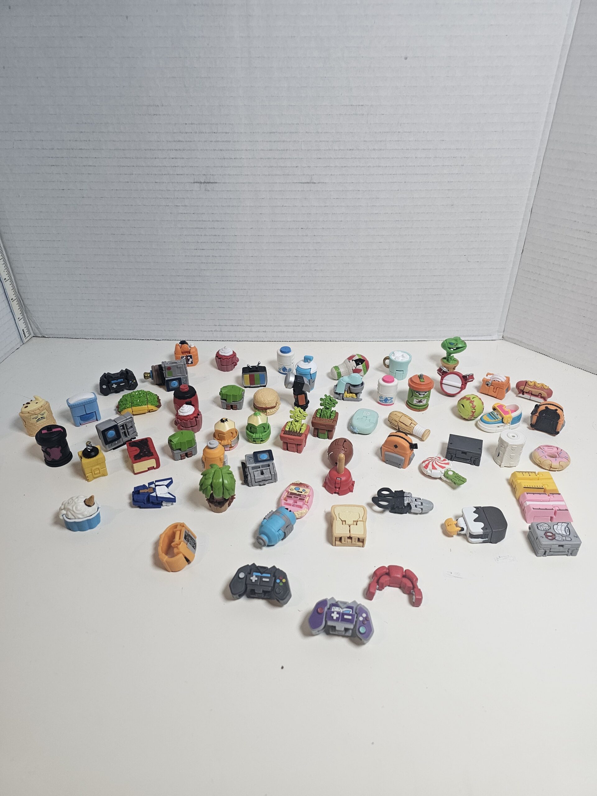 This unique collection includes 50 miniature collectible figures and accessories, featuring various designs such as food items, gadgets, and more. Each piece is crafted from durable plastic with vibrant colors. The items are in good condition, perfect for collectors or as fun desk decor. No visible flaws noted.