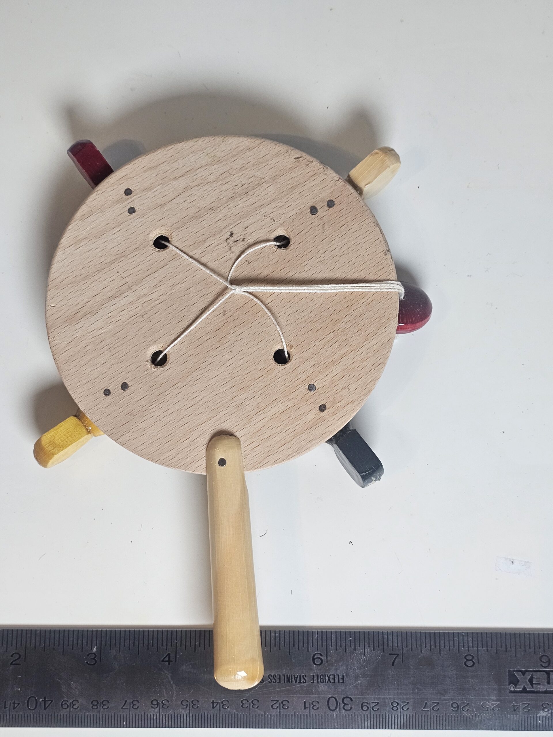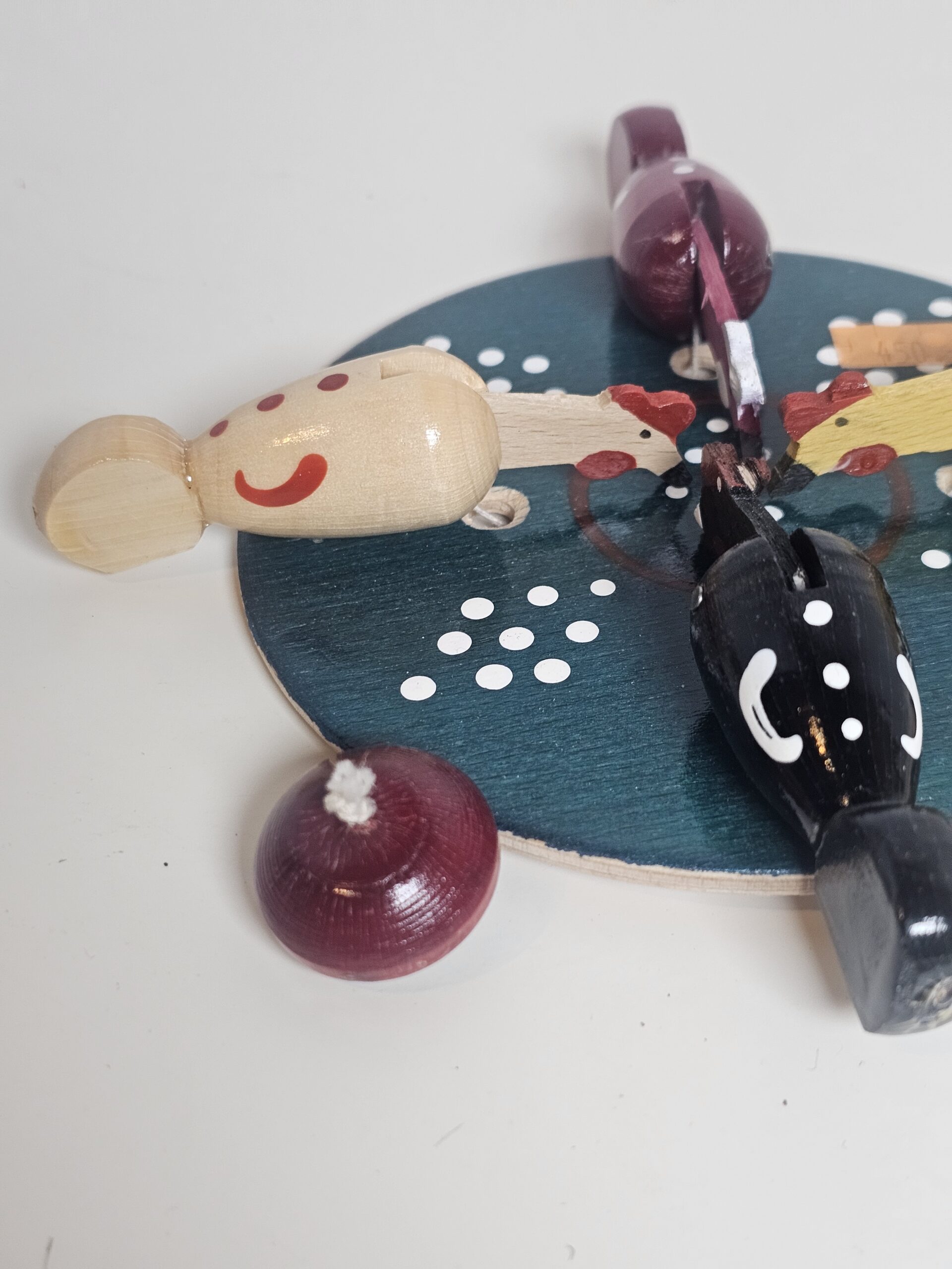 This charming wooden spinning toy features colorful, hand-painted figures on a wooden disc. Crafted from durable wood, it offers a delightful, nostalgic play experience.