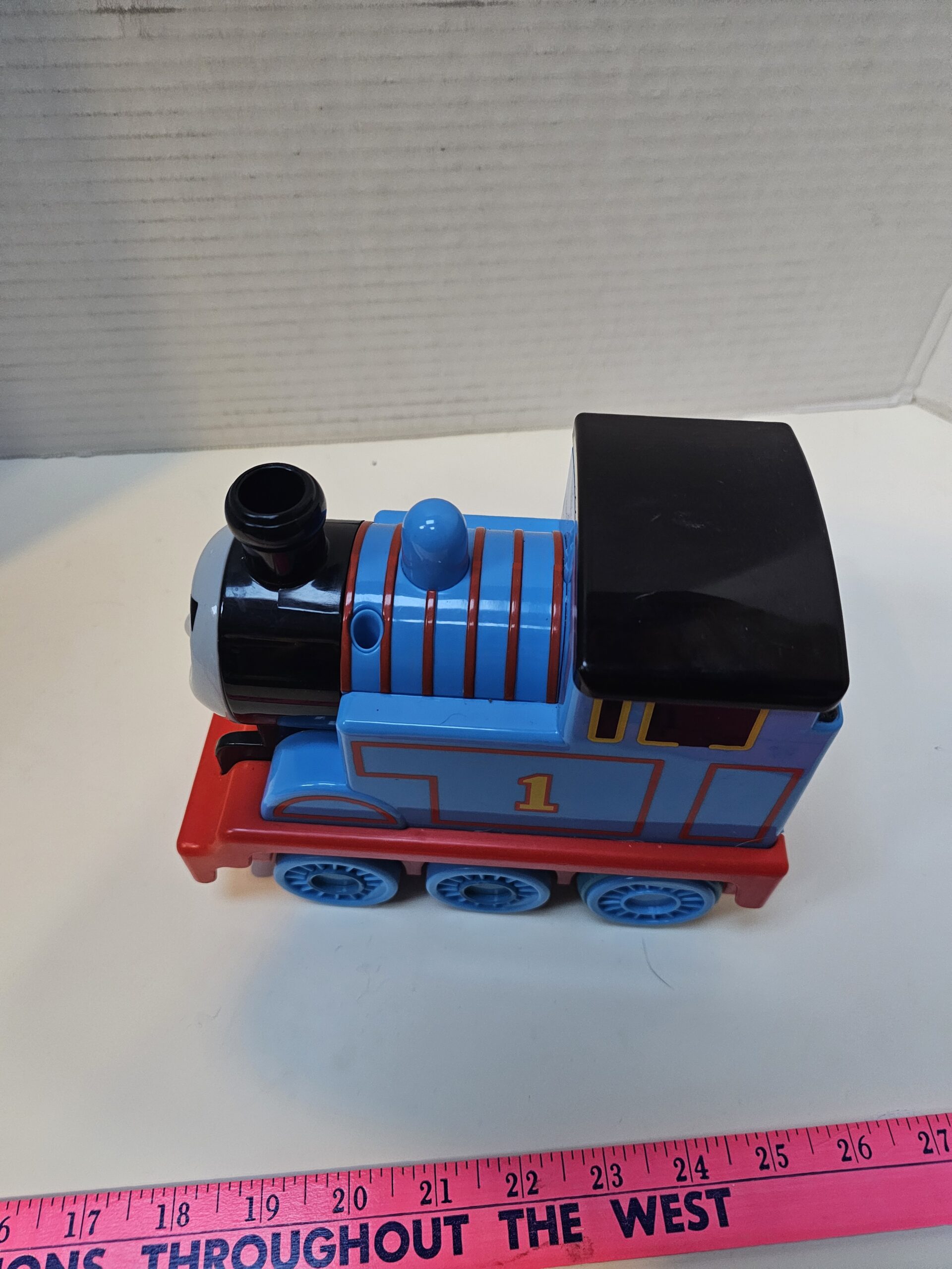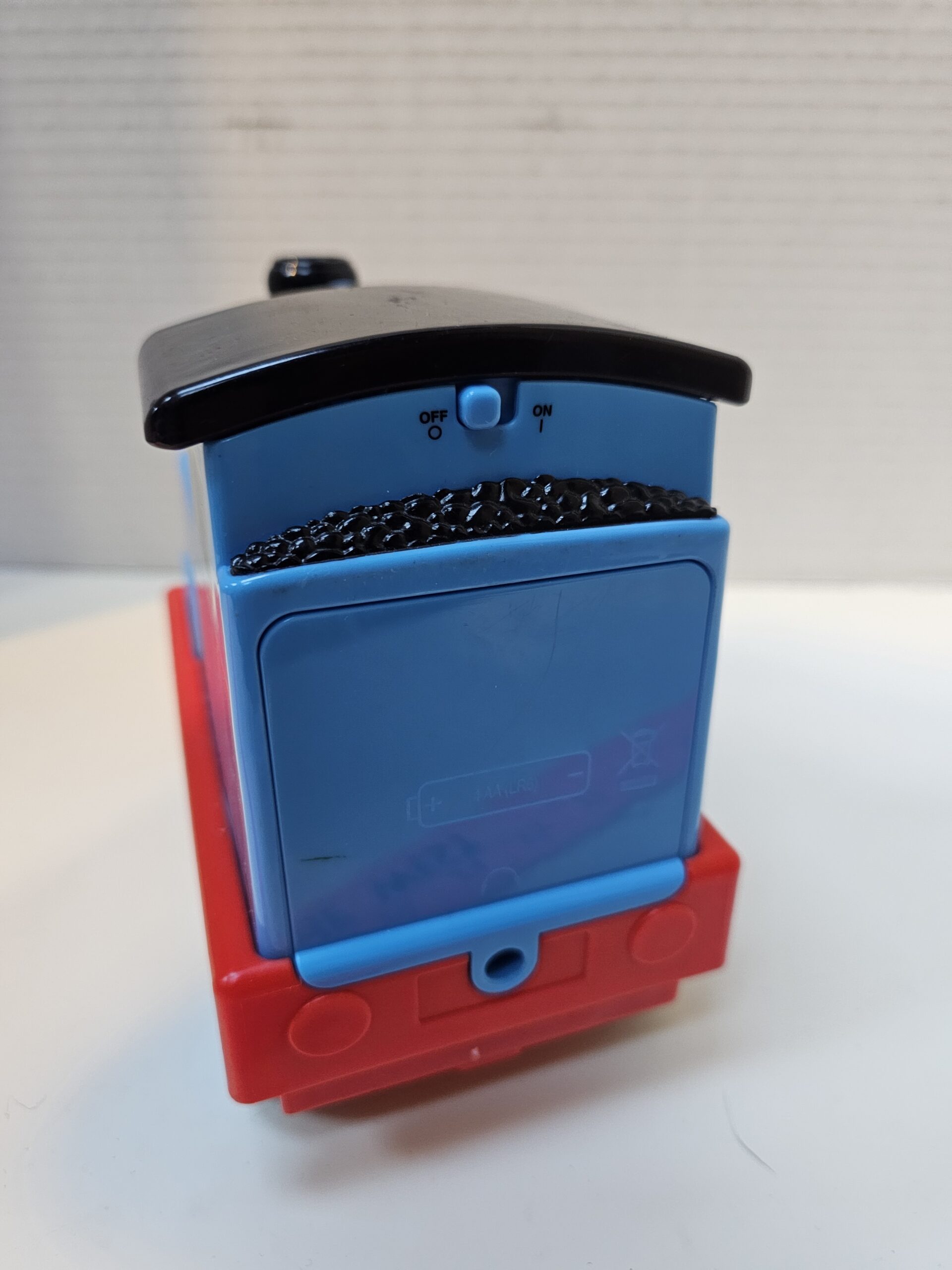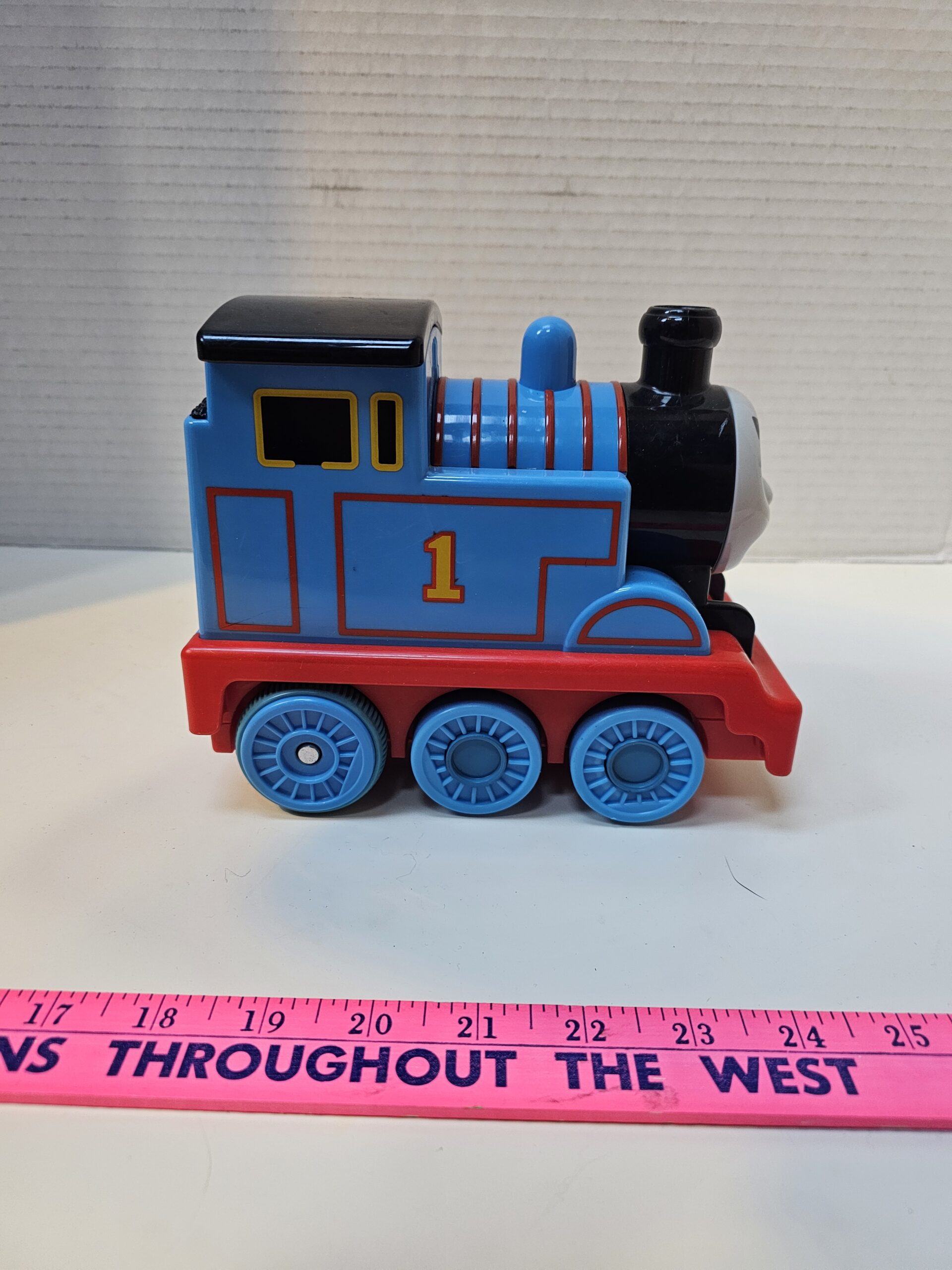 This Thomas the Train engine toy by Mattel is a delightful, battery-operated toy perfect for young train enthusiasts. Made from sturdy plastic, it features vibrant blue and red colors with black accents. The toy measures approximately 10 inches in length. It is in good condition with minor surface scratches. Requires AA batteries (not included).