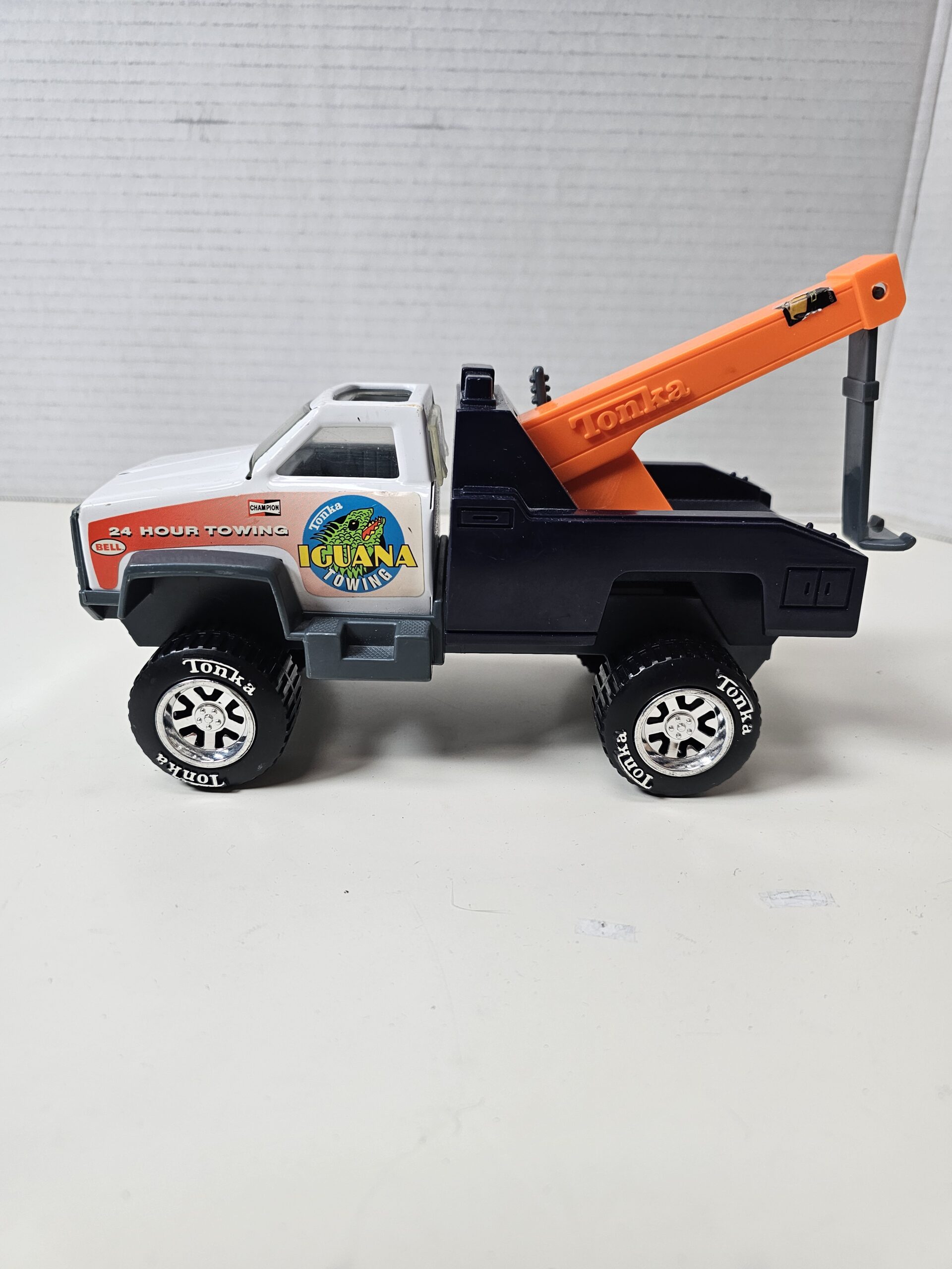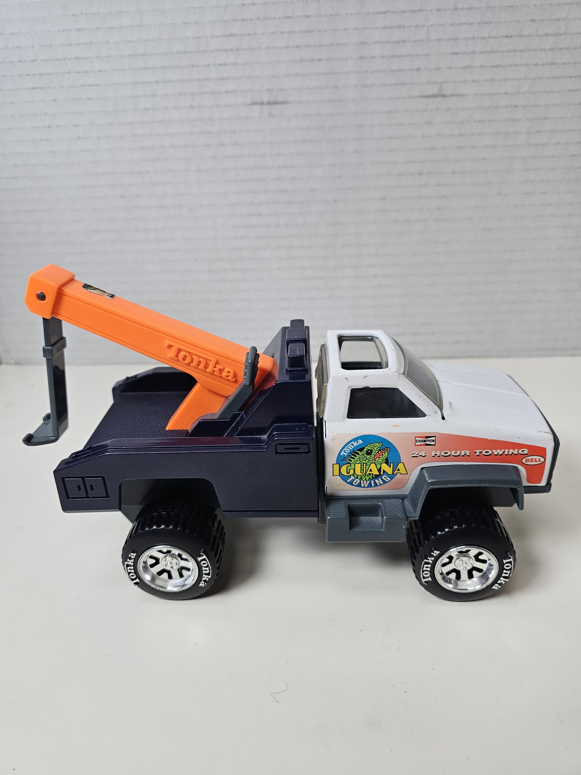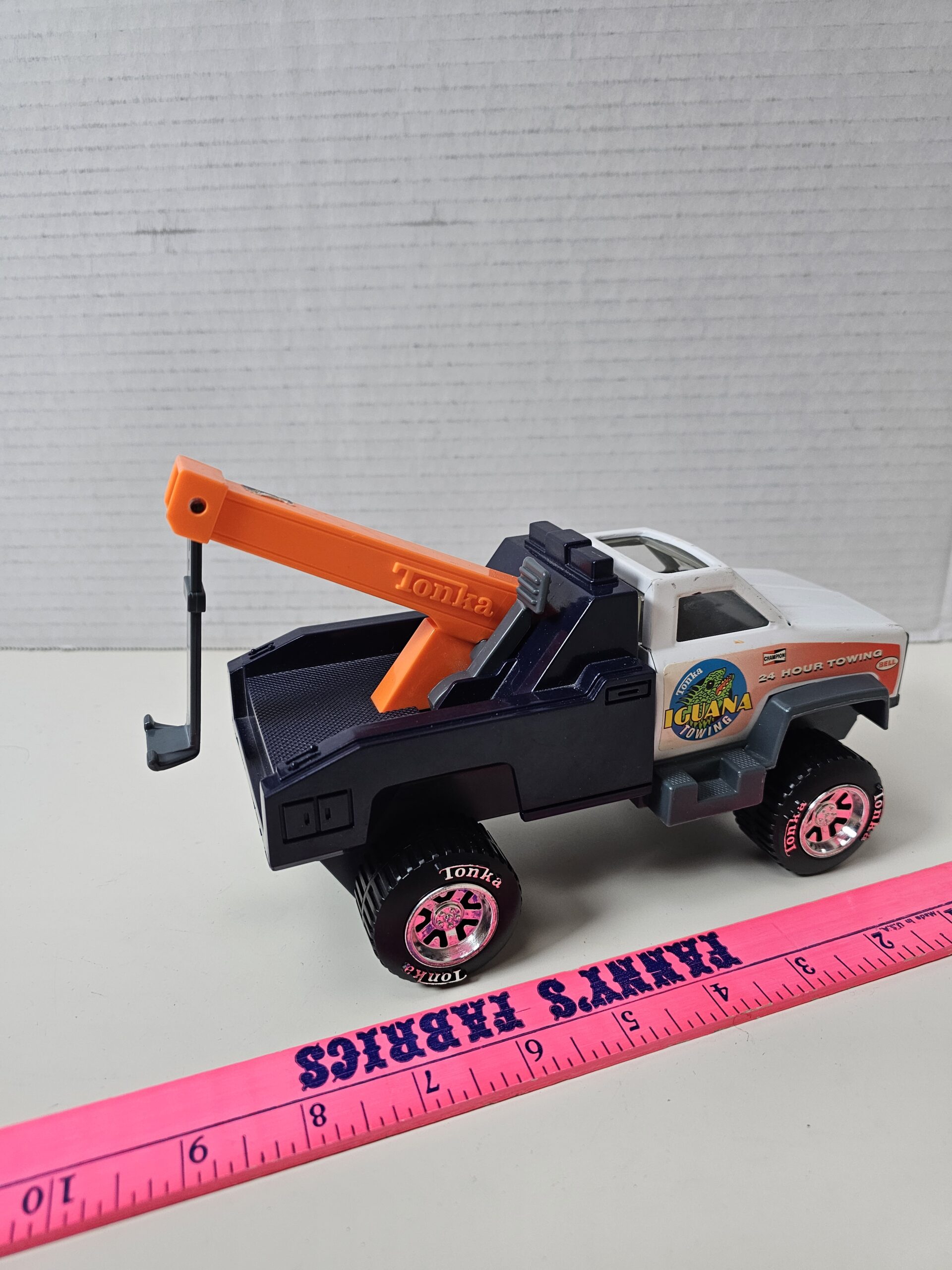 This Tonka toy tow truck is a classic piece perfect for imaginative play. Featuring a durable plastic build with vibrant orange, white, and black colors, it showcases Tonka’s signature rugged design. Measuring approximately 8 inches in length, it’s in good condition with minimal signs of wear. A great addition to any toy collection.