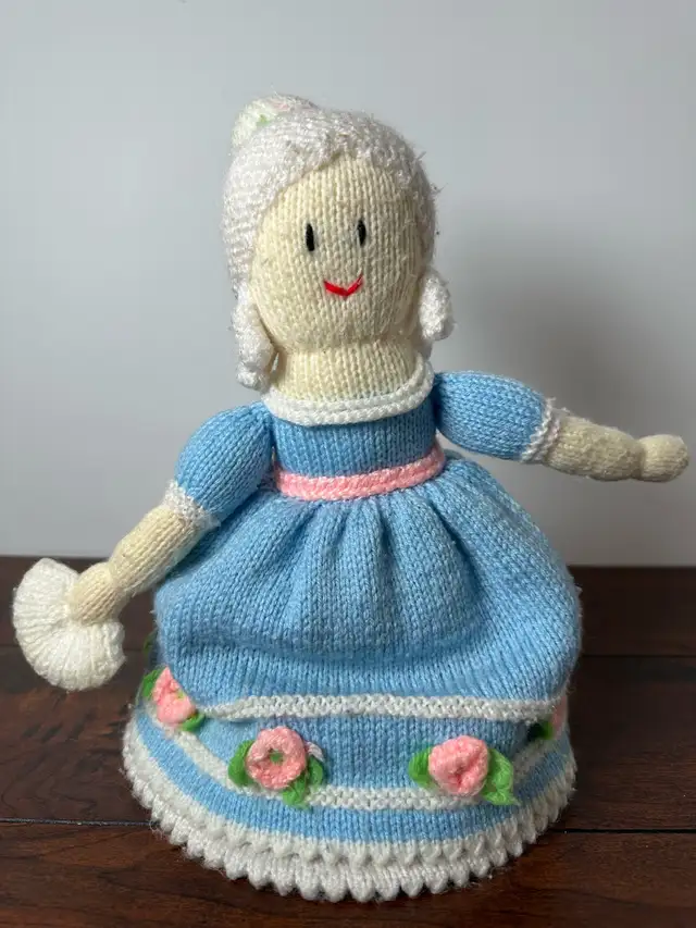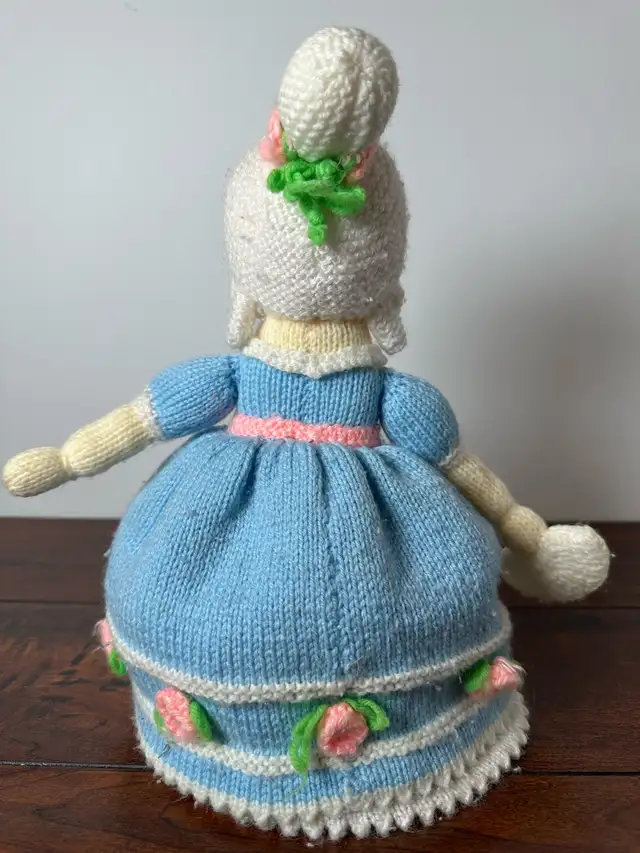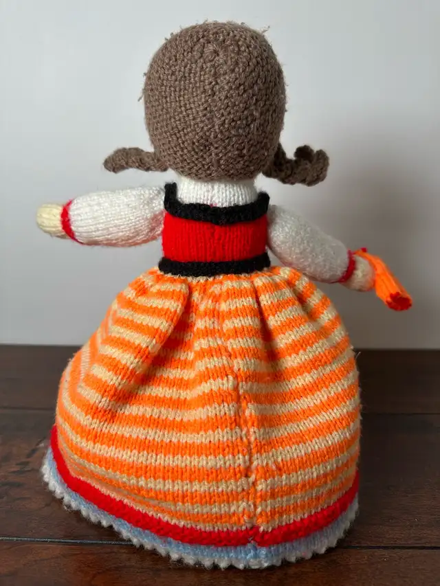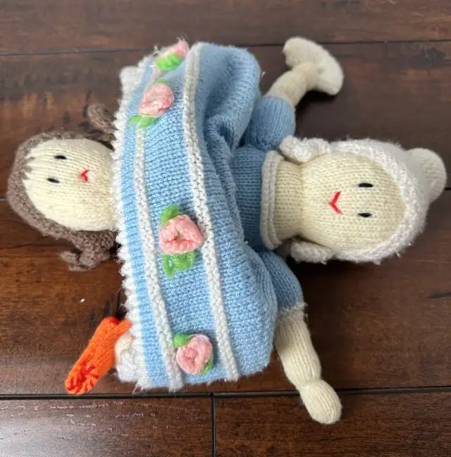 This charming, used hand knit doll features intricate detailing and a unique design, making it a delightful addition to any collection or a sweet companion for a child. Lovingly crafted, it showcases traditional knitting techniques and vibrant colours. Perfect for collectors, children, or as a decorative piece, this doll adds a touch of handmade warmth to any space.