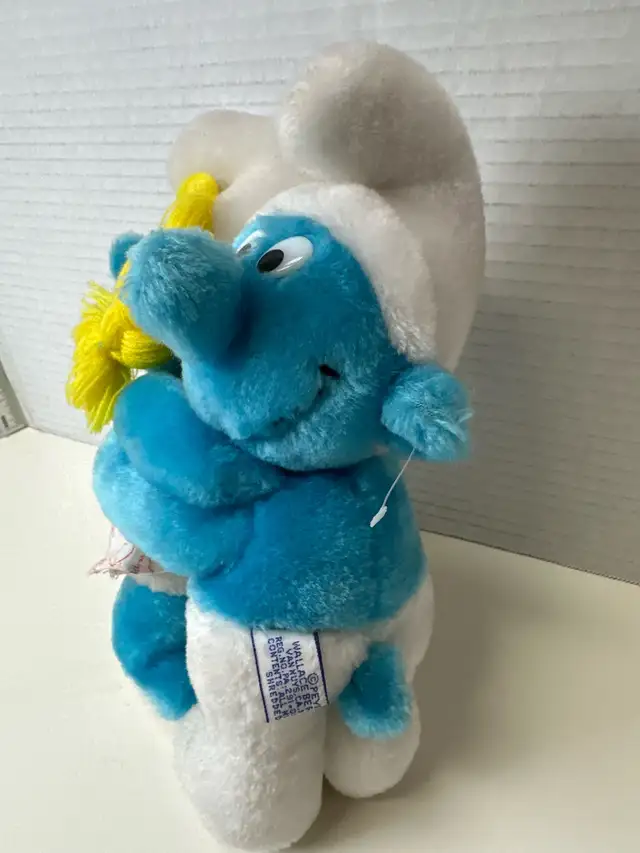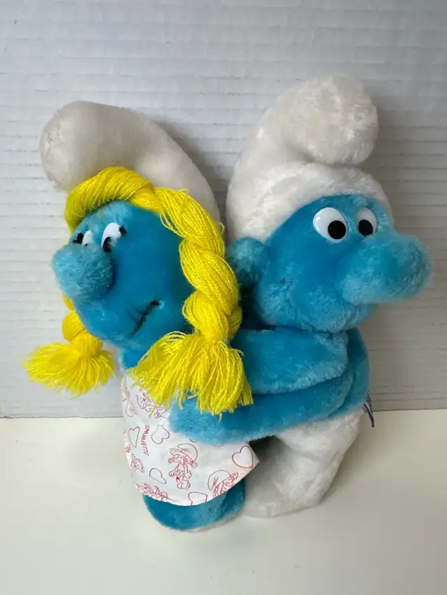 This vintage Peyo Smurfs hugging plush toy features Smurf and Smurfette in a loving embrace, a delightful collectible for any Smurfs fan. The plush is in used condition, showing some wear, but is overall in good shape for its age. A charming piece of Smurfs memorabilia!