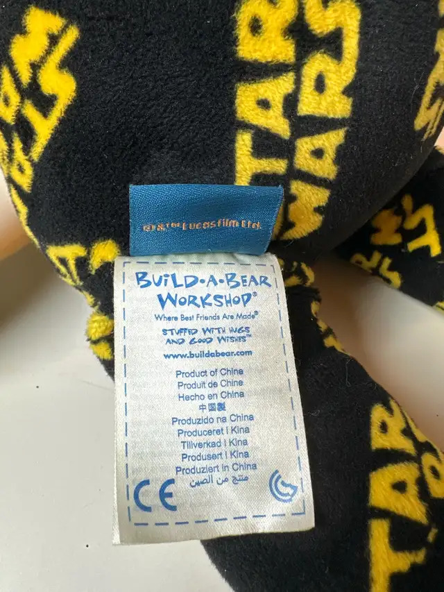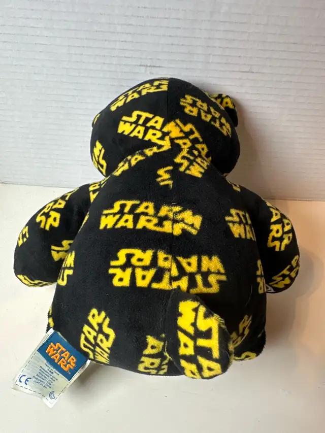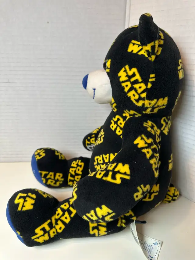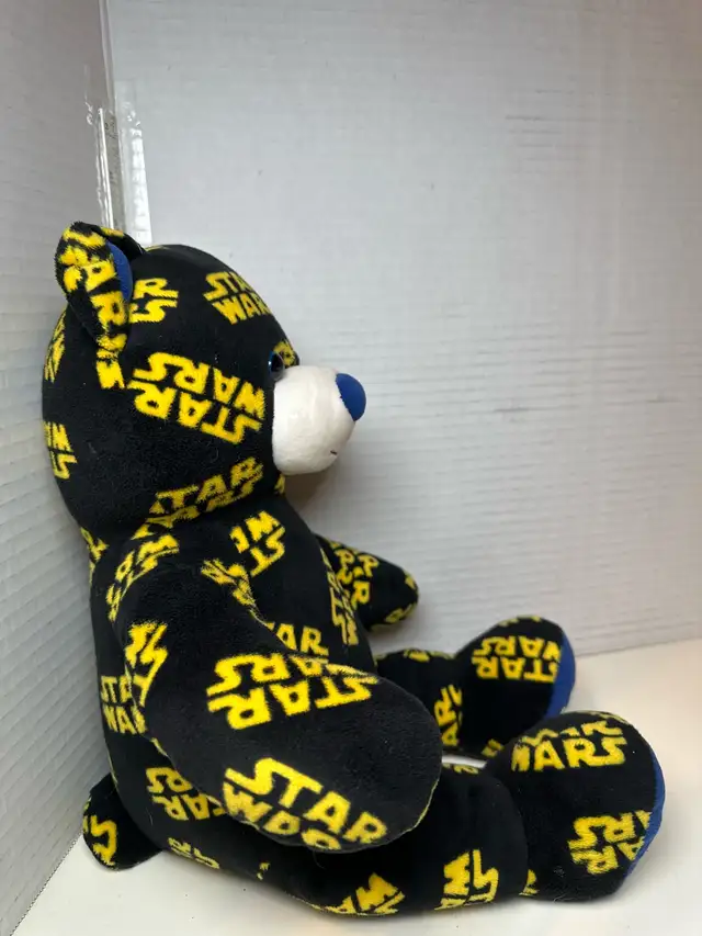 This Build-A-Bear Star Wars plush is in excellent condition and ready for a new home. It features a unique Star Wars print design, making it a must-have for any fan. It has a blue nose and footpads, with the Star Wars logo printed all over it. This plush toy has been well-cared for and comes from a smoke-free home.