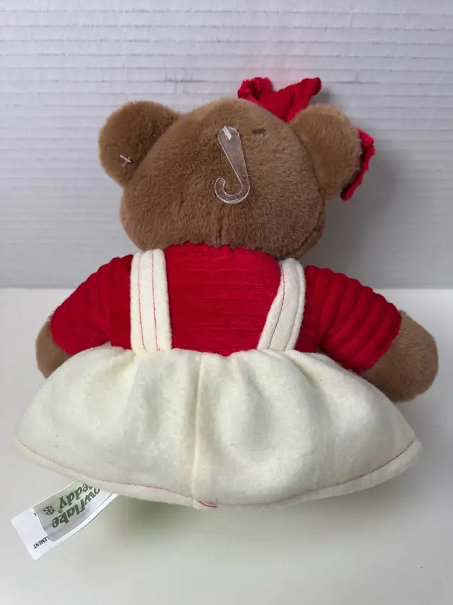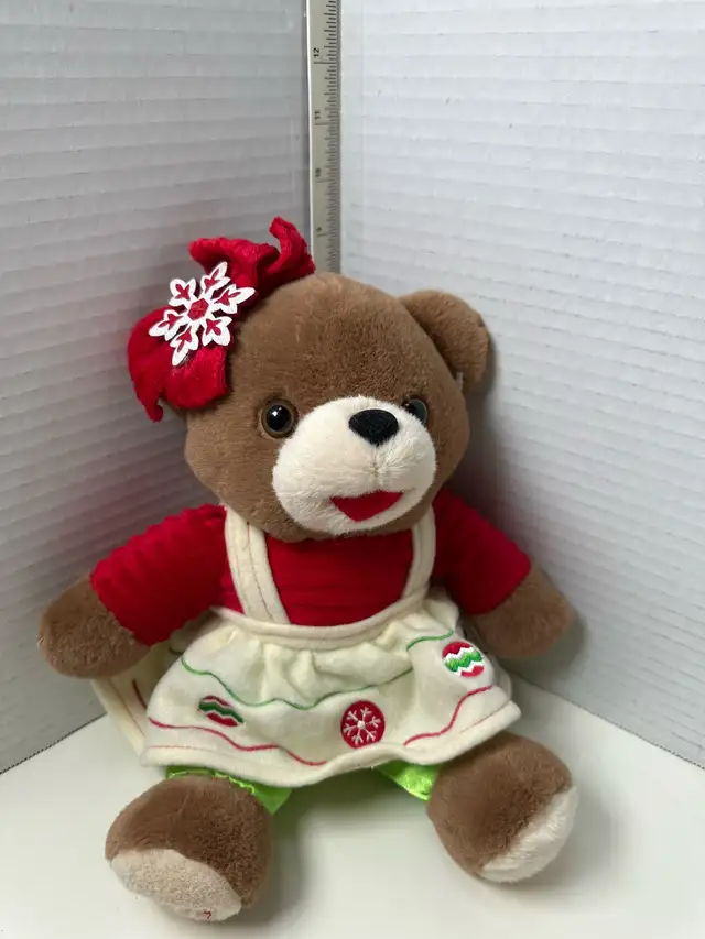 This adorable DanDee2015 teddy bear is ready to spread some Christmas cheer! Sporting a festive red and white dress with a snowflake bow, this plush bear is in good, pre-owned condition and waiting for a new home. It measures approximately 14 inches tall. This cute collectable could make a whimsical gift to be sure!