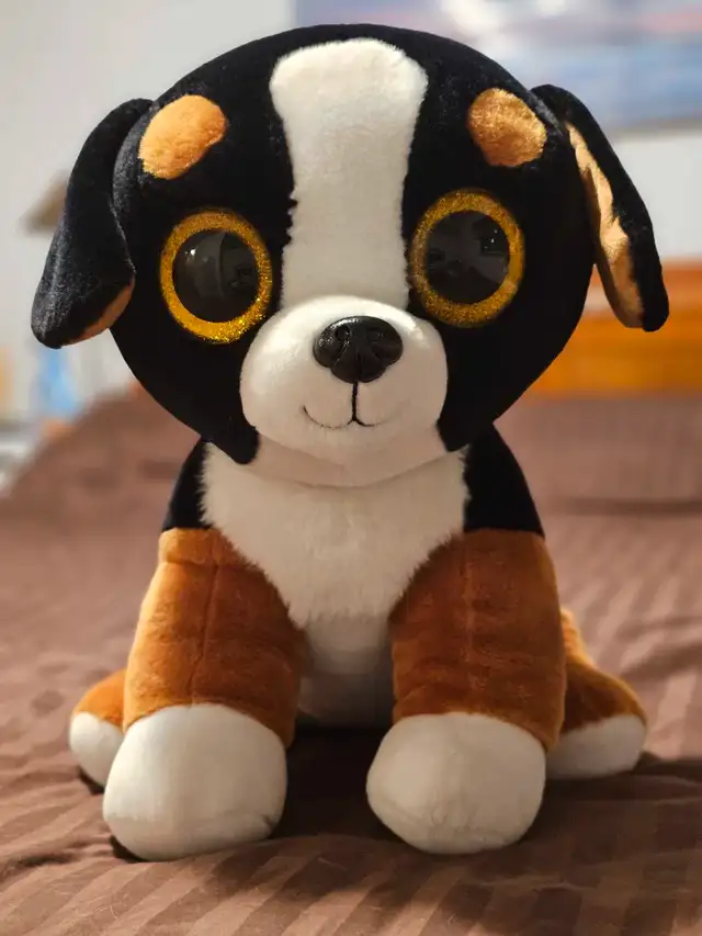 This is a used Ty Velvety Roscoe plush dog with golden glitter eyes, perfect for collectors or as a cuddly friend! It has been gently enjoyed and is in good condition.