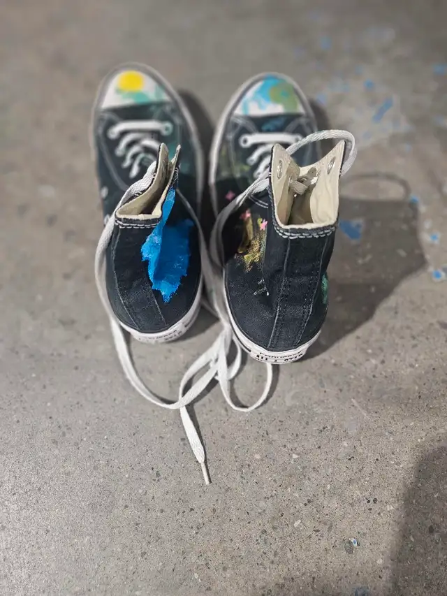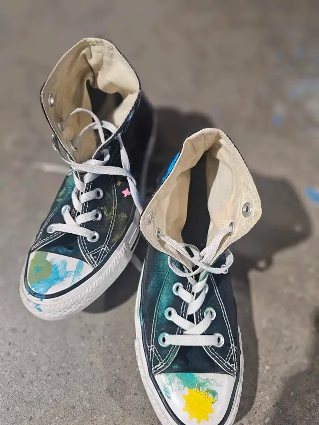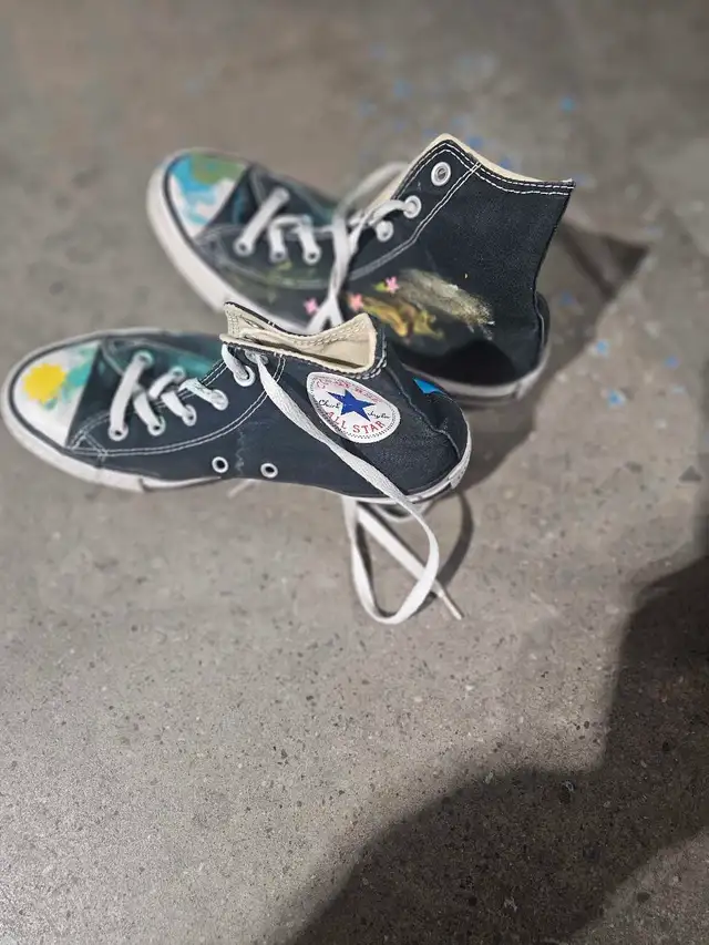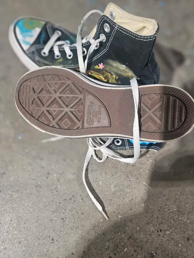 Elevate your sneaker game with these custom Converse All-Star high tops, size 6, featuring unique hand-painted designs! These are used condition, adding a touch of individuality to the classic silhouette.