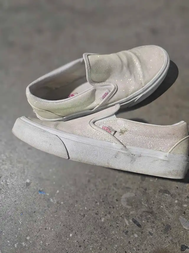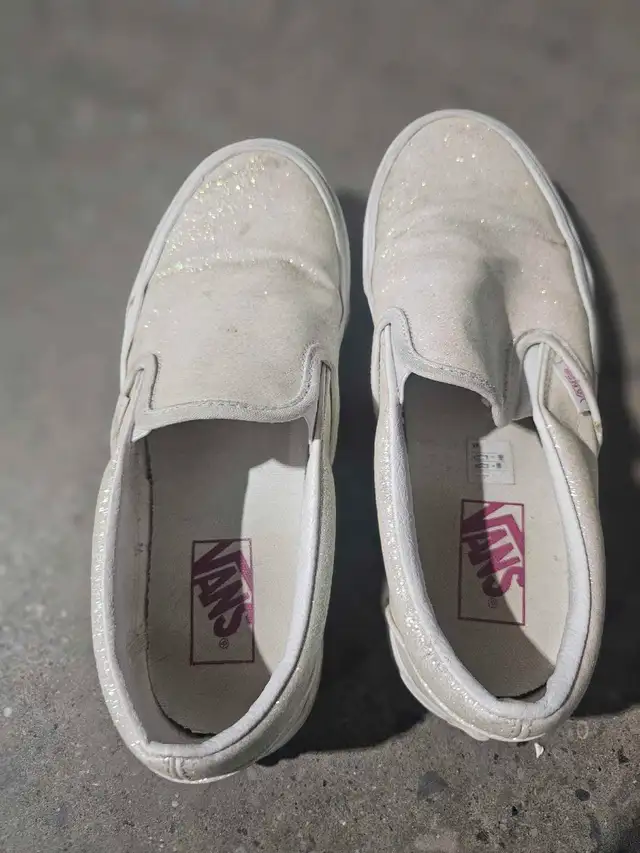 These are a pair of pre-owned Vans slip-on shoes, perfect for casual wear. These shoes feature a full glitter upper, offering a stylish, eye-catching look, with elastic side accents and the Vans logo at the heel. They are size 7.5. These shoes show signs of wear but still have plenty of life left!