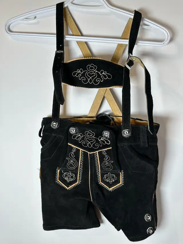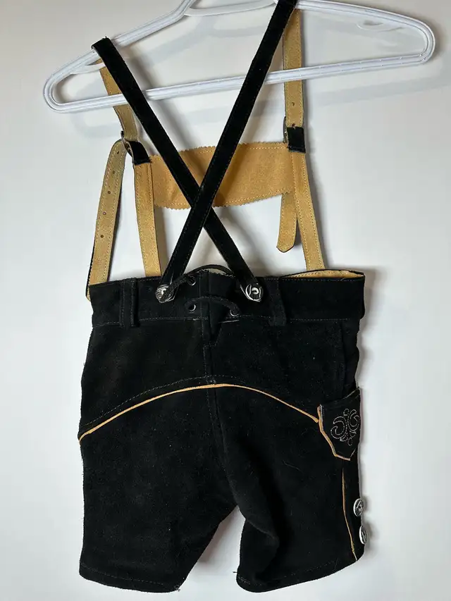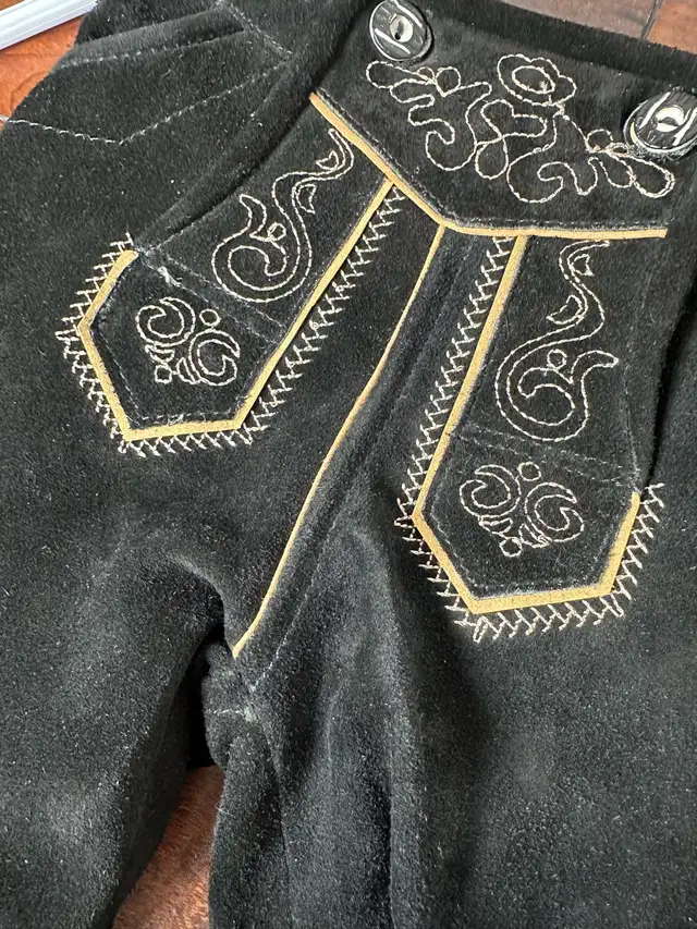 These are children’s black suede leather lederhosen, perfect for celebrating Oktoberfest or any festive occasion! These size 6 lederhosen are in good condition, showing only minor signs of wear, ready for your little one’s adventures. * Size: 6 Kids