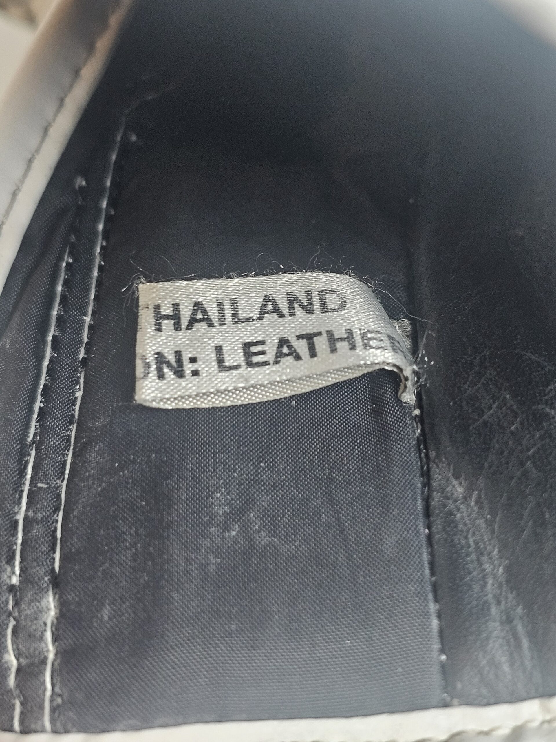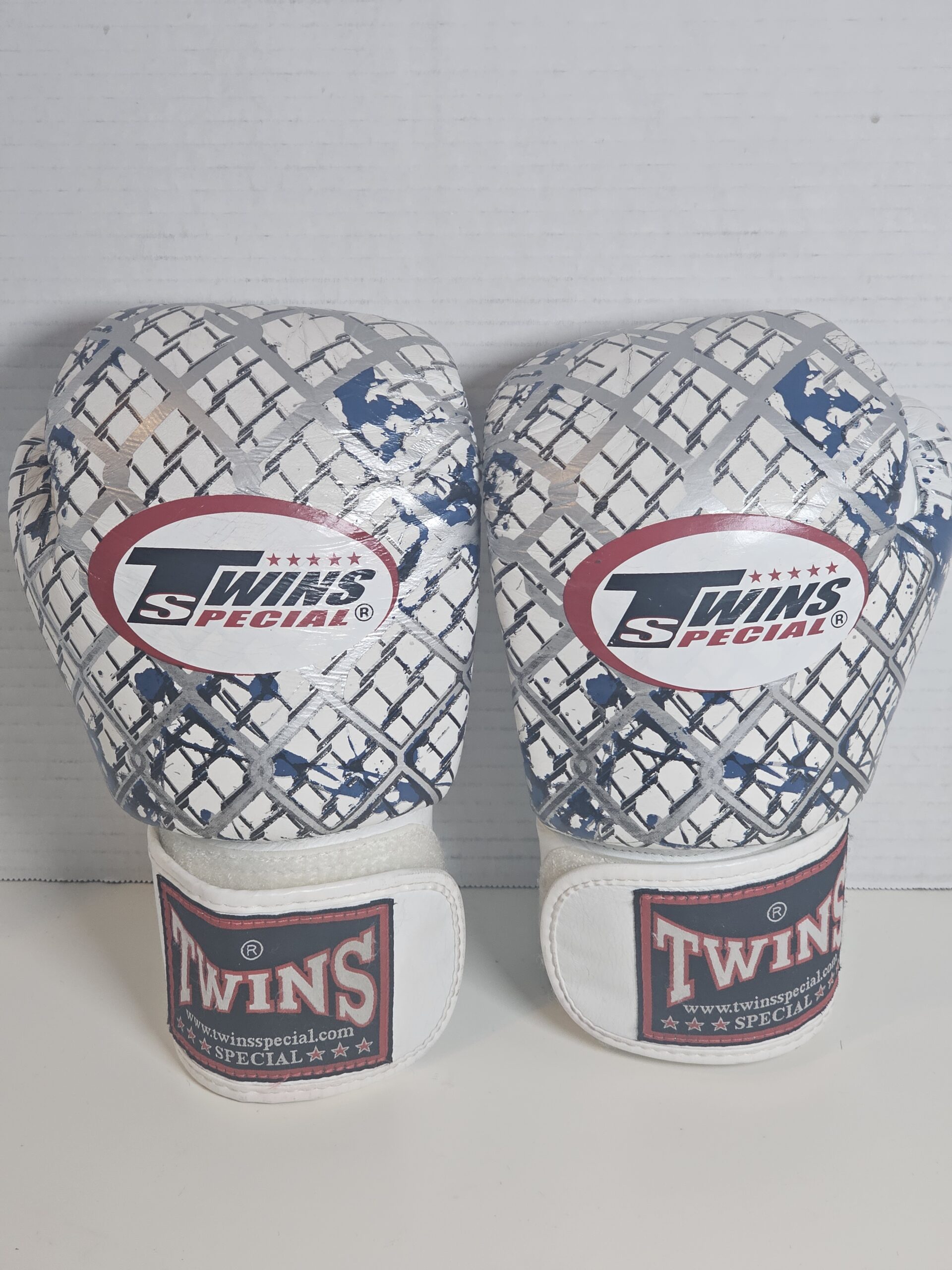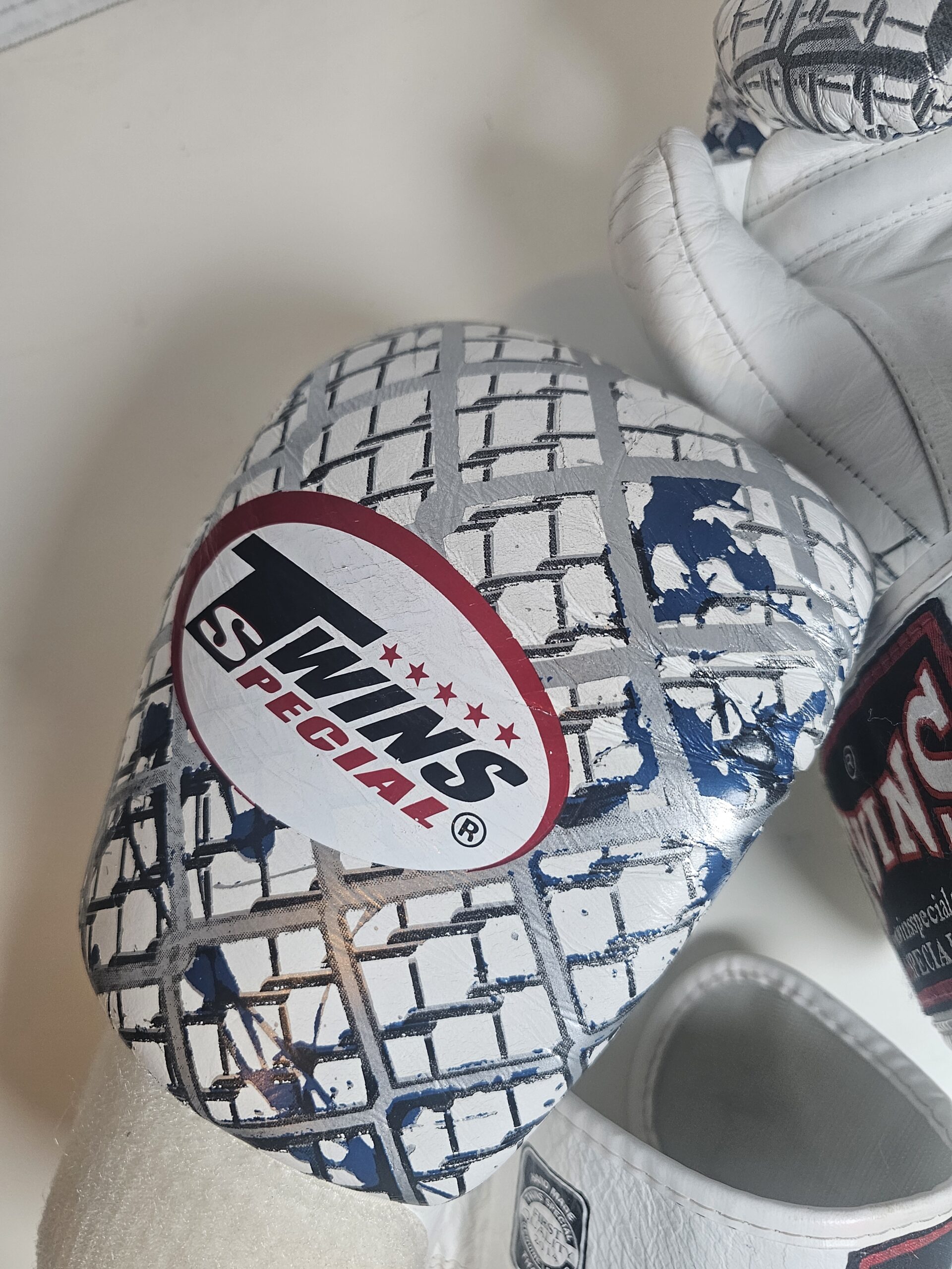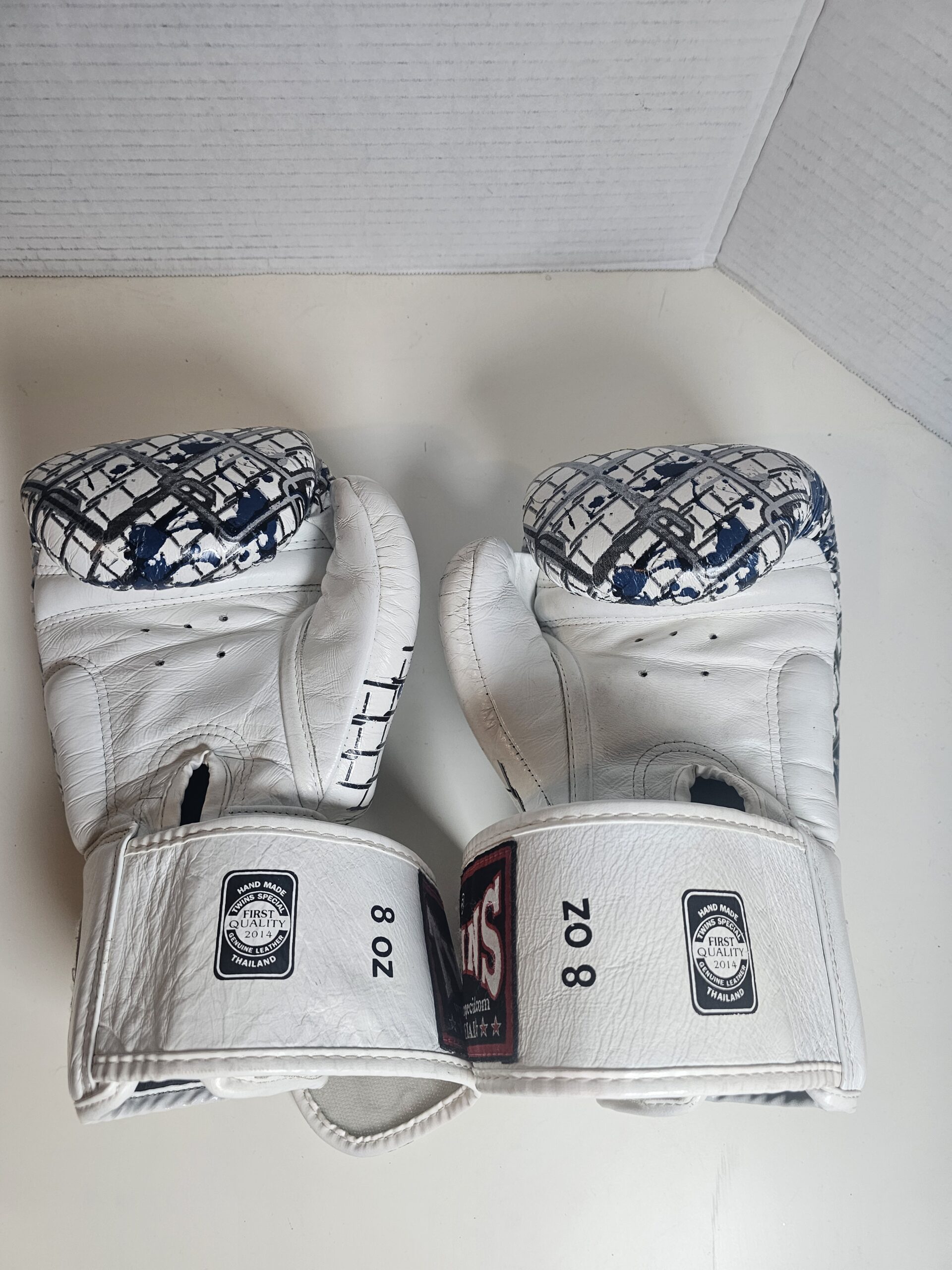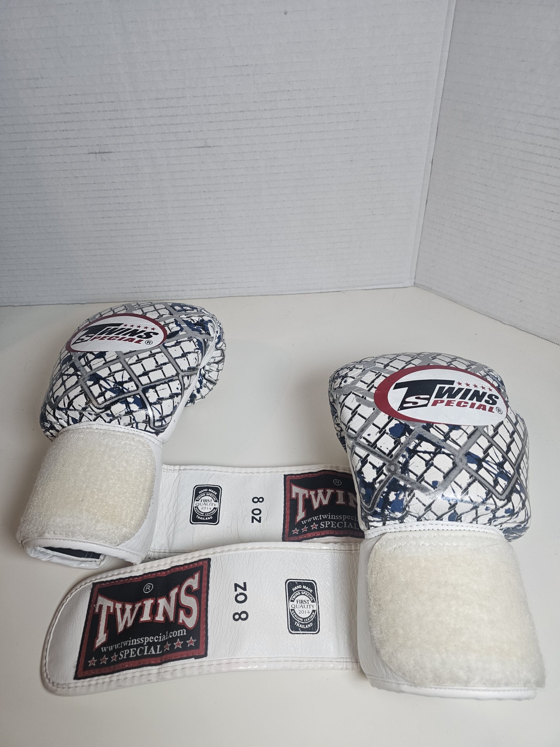 These Twins Special boxing gloves are crafted from genuine leather and handmade in Thailand, ensuring high quality and durability. Designed with a unique pattern, they feature a white base with blue and black accents. These gloves weigh 8oz, suitable for training and sparring sessions. They are in good condition with some signs of wear as shown in the photos.