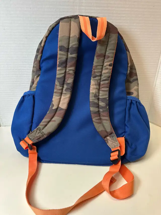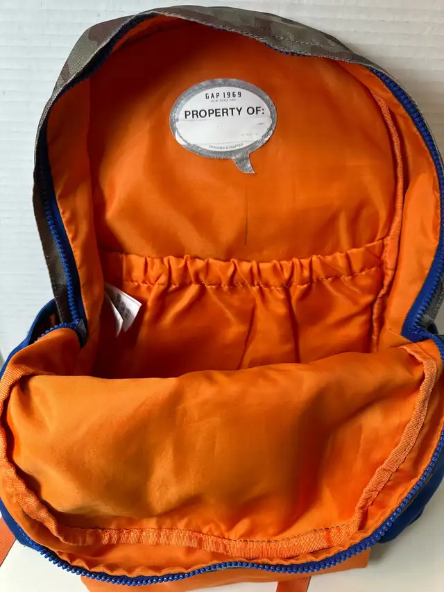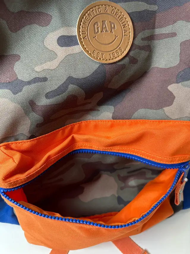 This Gap backpack is perfect for little adventurers! Featuring a fun camouflage print with blue and orange accents, it’s both stylish and practical. The backpack is used but still in good condition, ready for school or weekend outings.