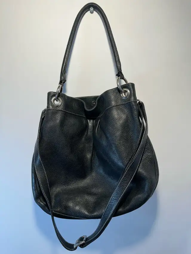 This is a stylish, black Roots genuine leather purse, perfect for everyday use. The purse is in used-good condition,