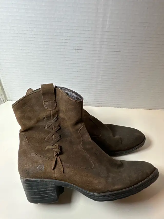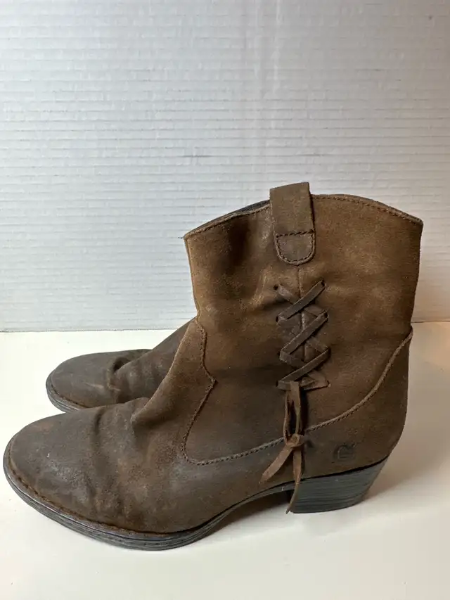 Step into style with these Born brown suede western-inspired ankle boots, size 8.5, featuring a comfortable block heel and stylish side zipper! These boots are in good condition, ready to add a touch of rustic charm to your wardrobe.