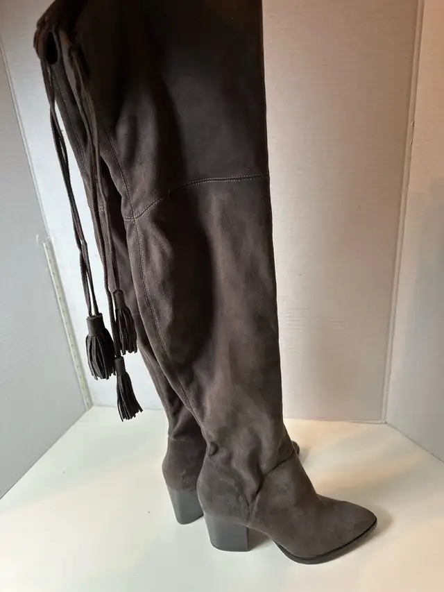 Step out in style with these used Marc Fisher over-the-knee boots, size 8, featuring a chic block heel and a comfortable fit. These boots have been previously loved, showing some signs of wear, but still have plenty of life and fashion-forward flair to offer. Perfect for adding a touch of elegance to any outfit.