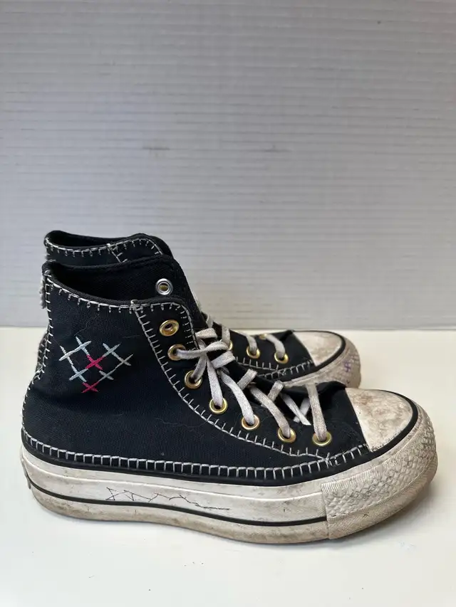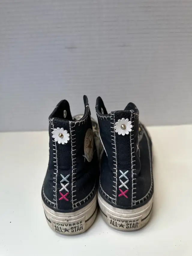 Add a touch of whimsy to your wardrobe with these charming, pre-loved Converse All Star high tops, size 5.5! These black canvas sneakers feature unique stitching and adorable flower embellishments on the back, making them a standout piece. While they show signs of wear, as pictured, they’ve got plenty of life and character left. Embrace the perfectly imperfect look! If the ad is up, they’re still available, ready to skip to a new home!